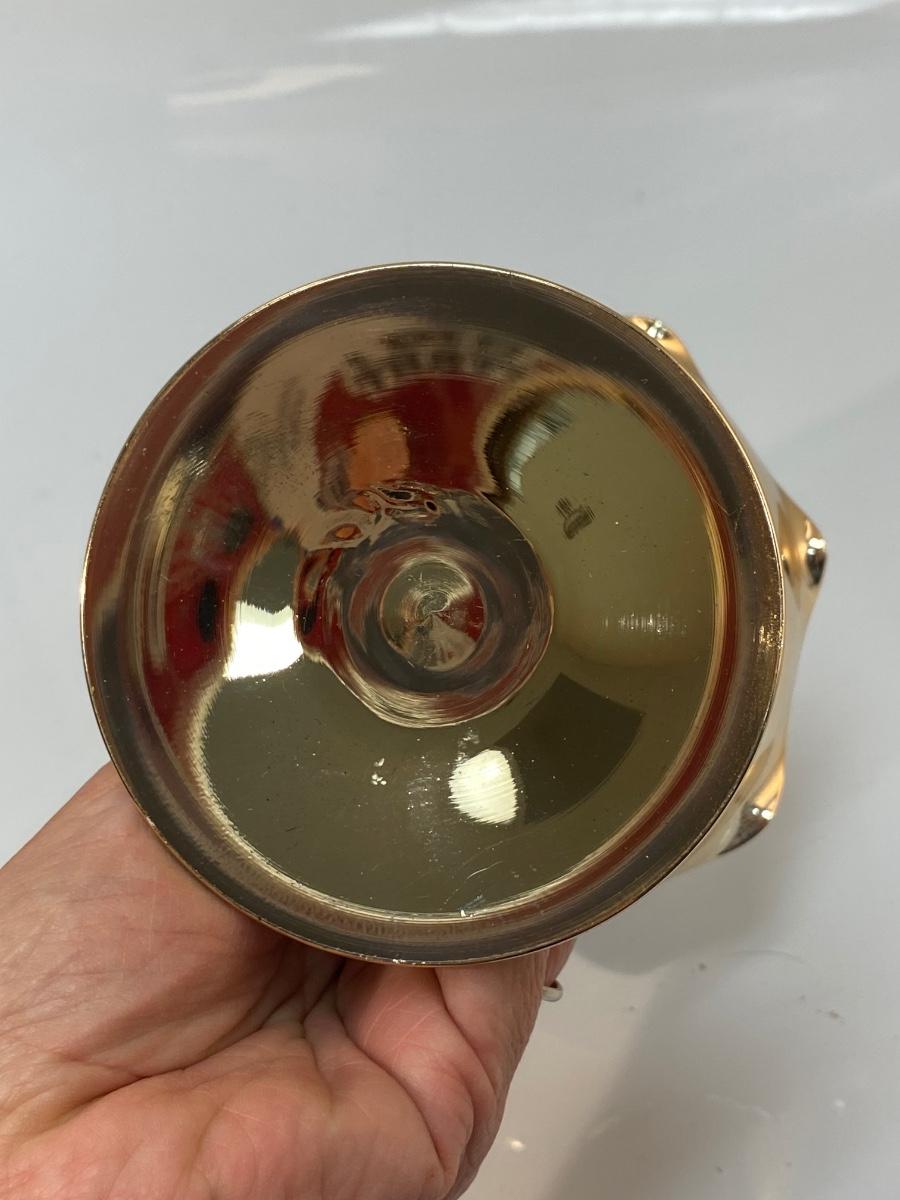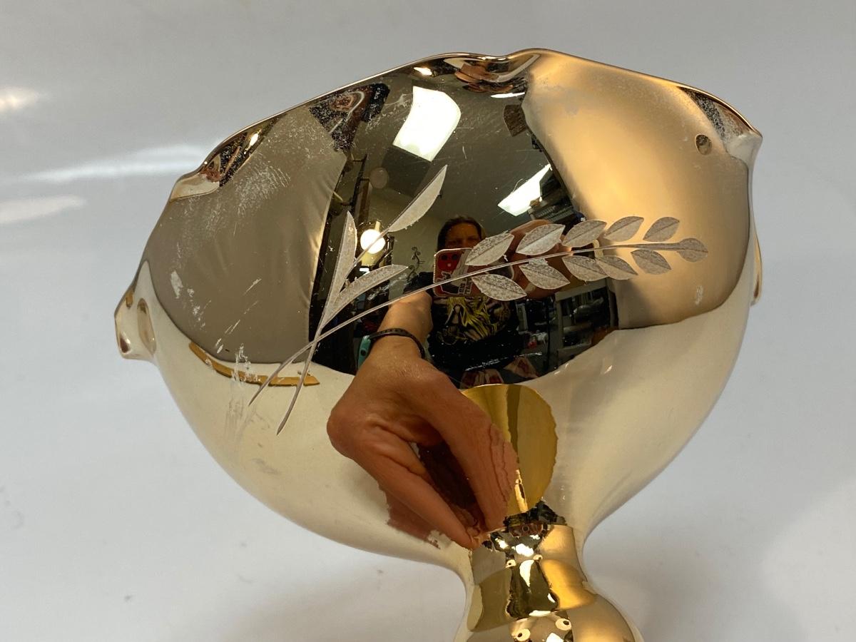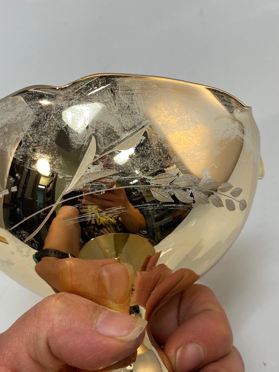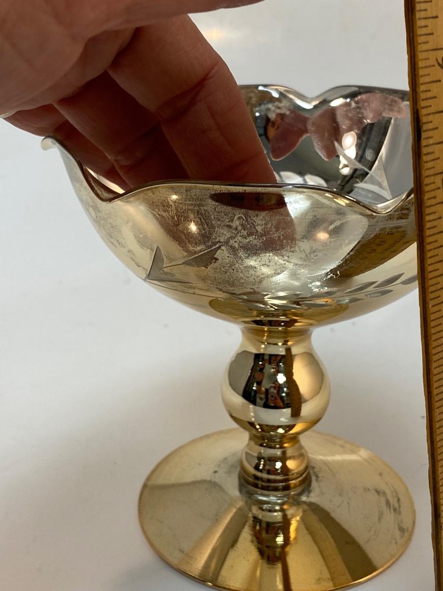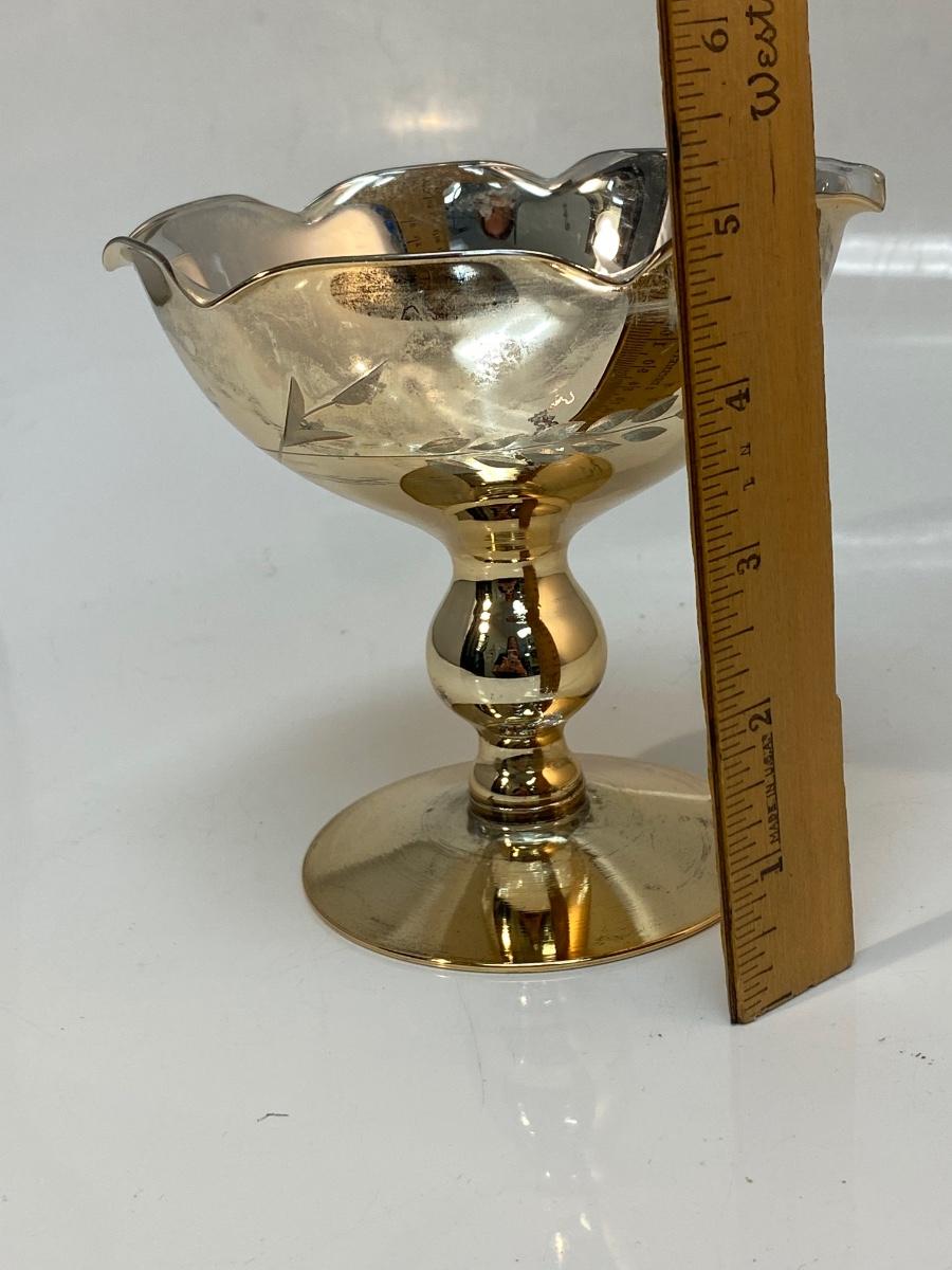 Vintage Gold Tone Lusterware Glass Compote Pedestal Candy Dish with Wheat Pattern. In vintage condition. Gold luster outer with silver tone inside, there is some wear to finish in spots but no chips. Displays nice and does have great shine. About 5" tall.