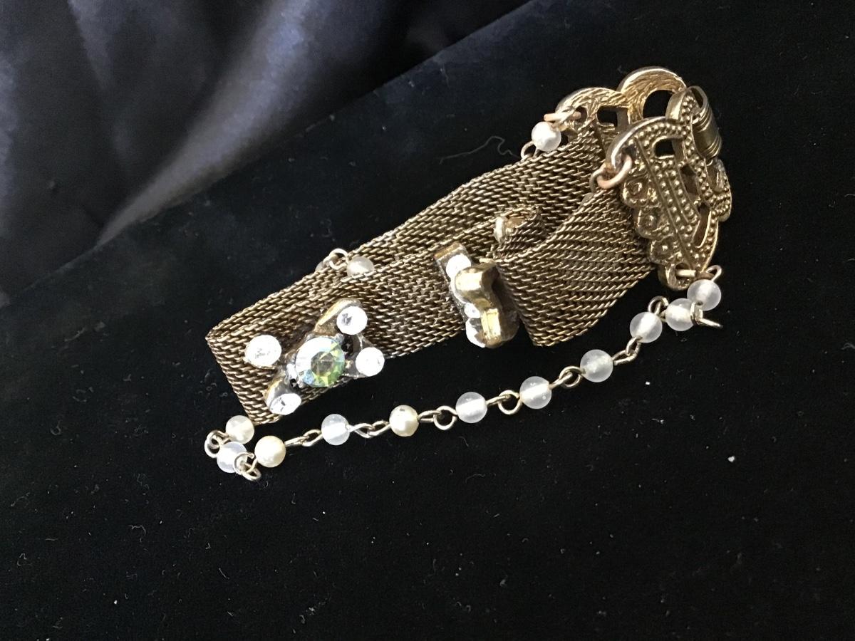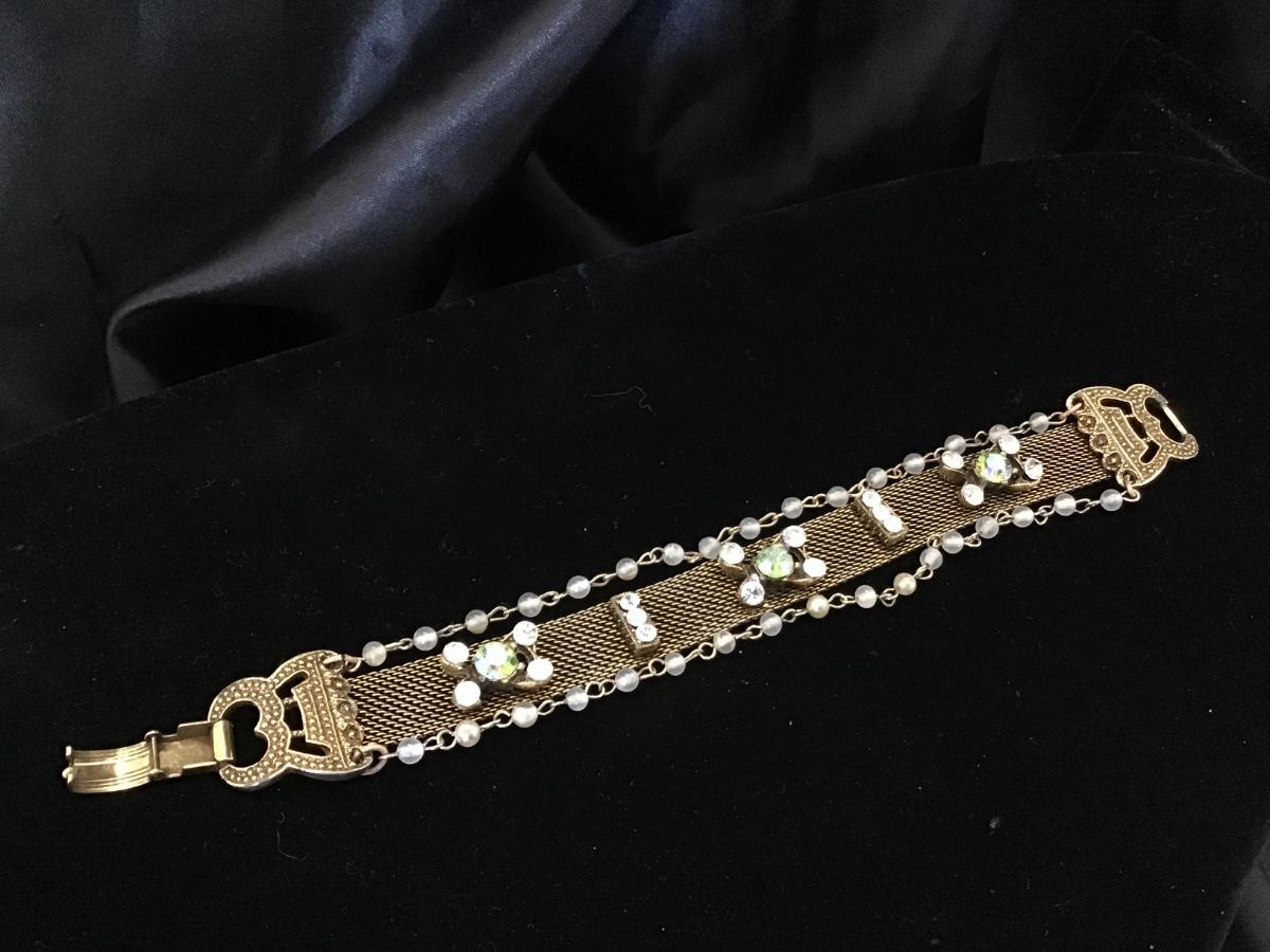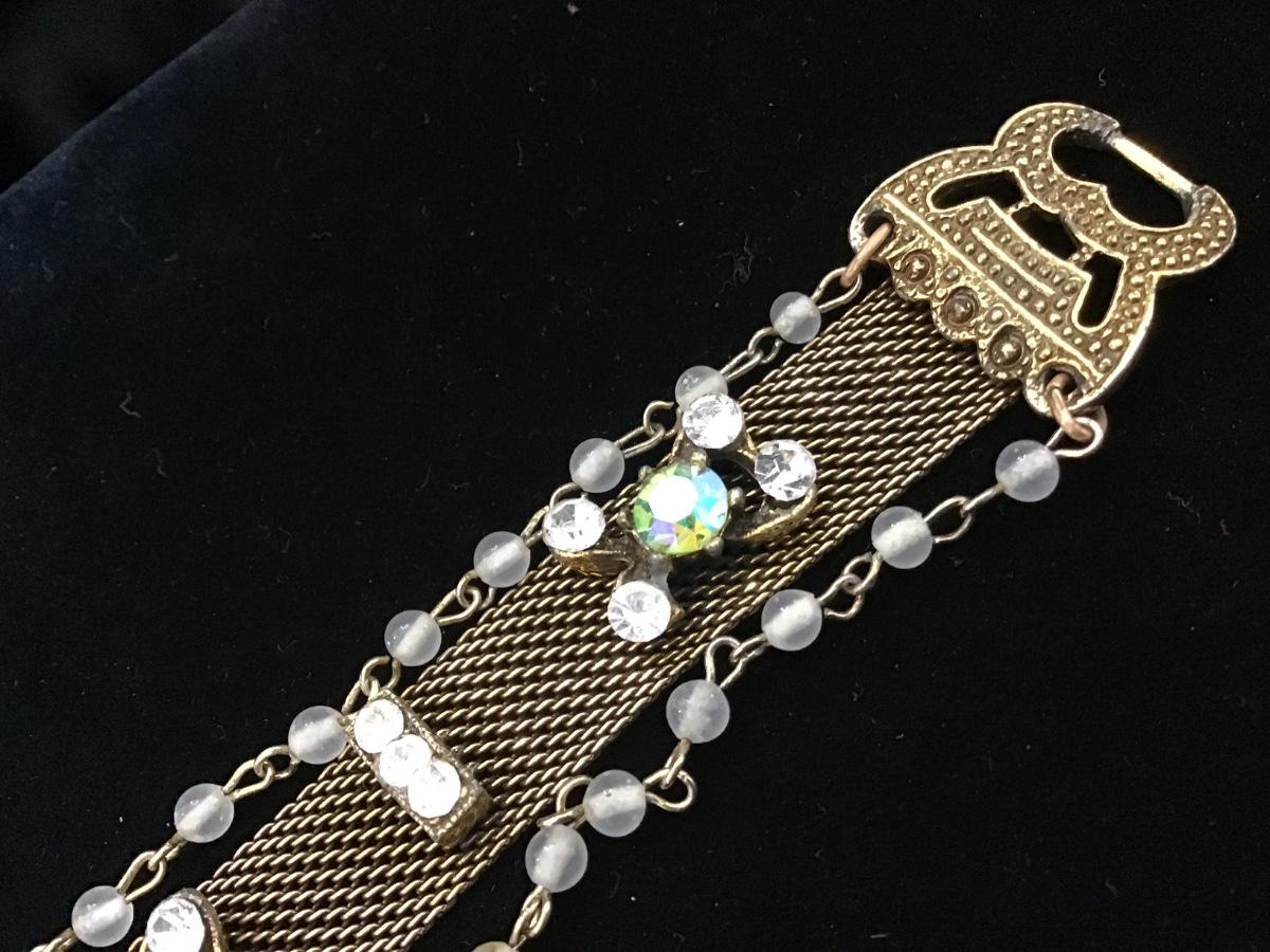 Vintage Gold Tone Mesh, Rhinestone, Victorian Revival Bracelet