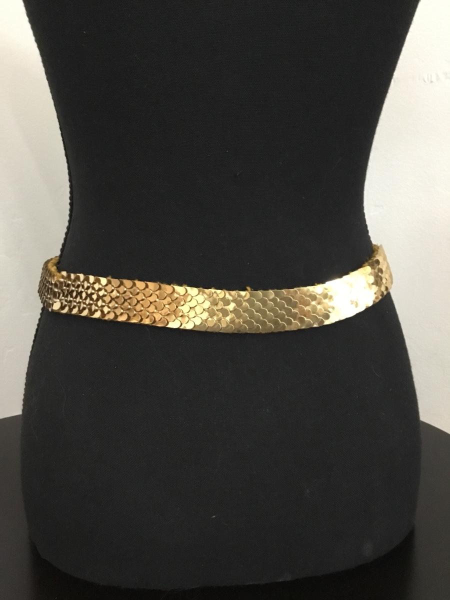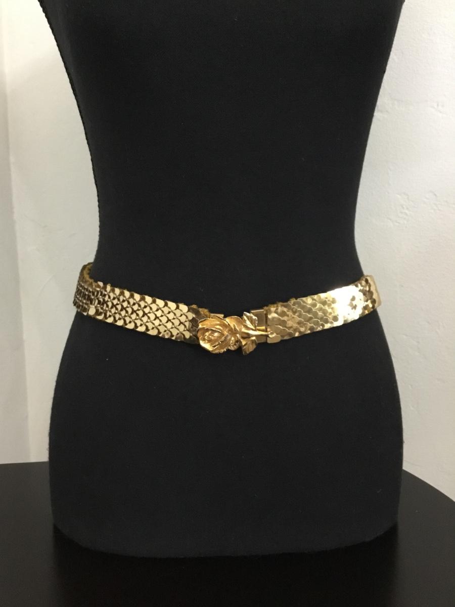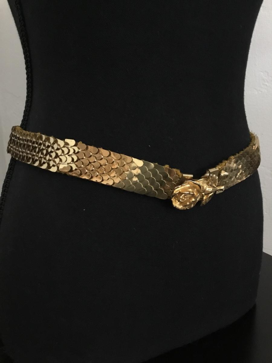 Vintage Gold tone, metallic belt with fish, scale, design, and flower clasp