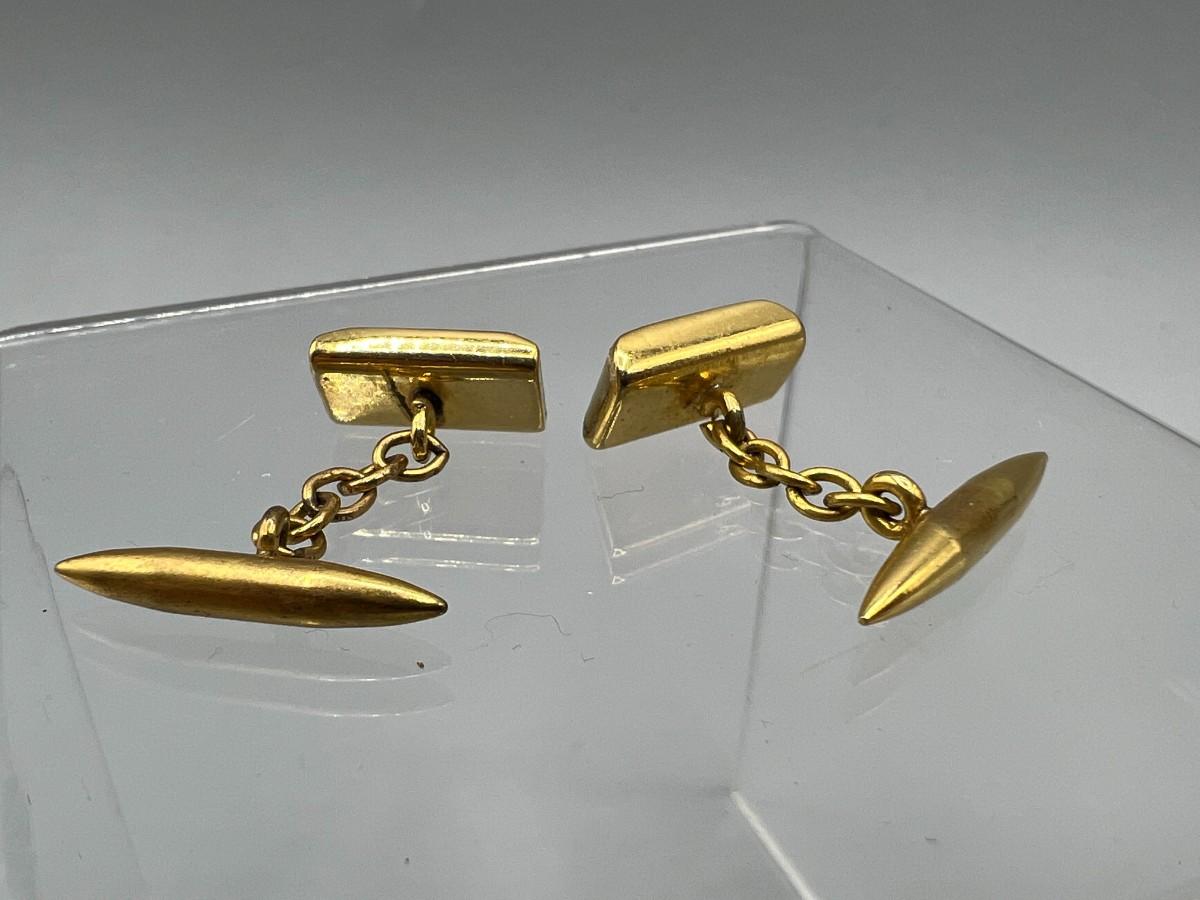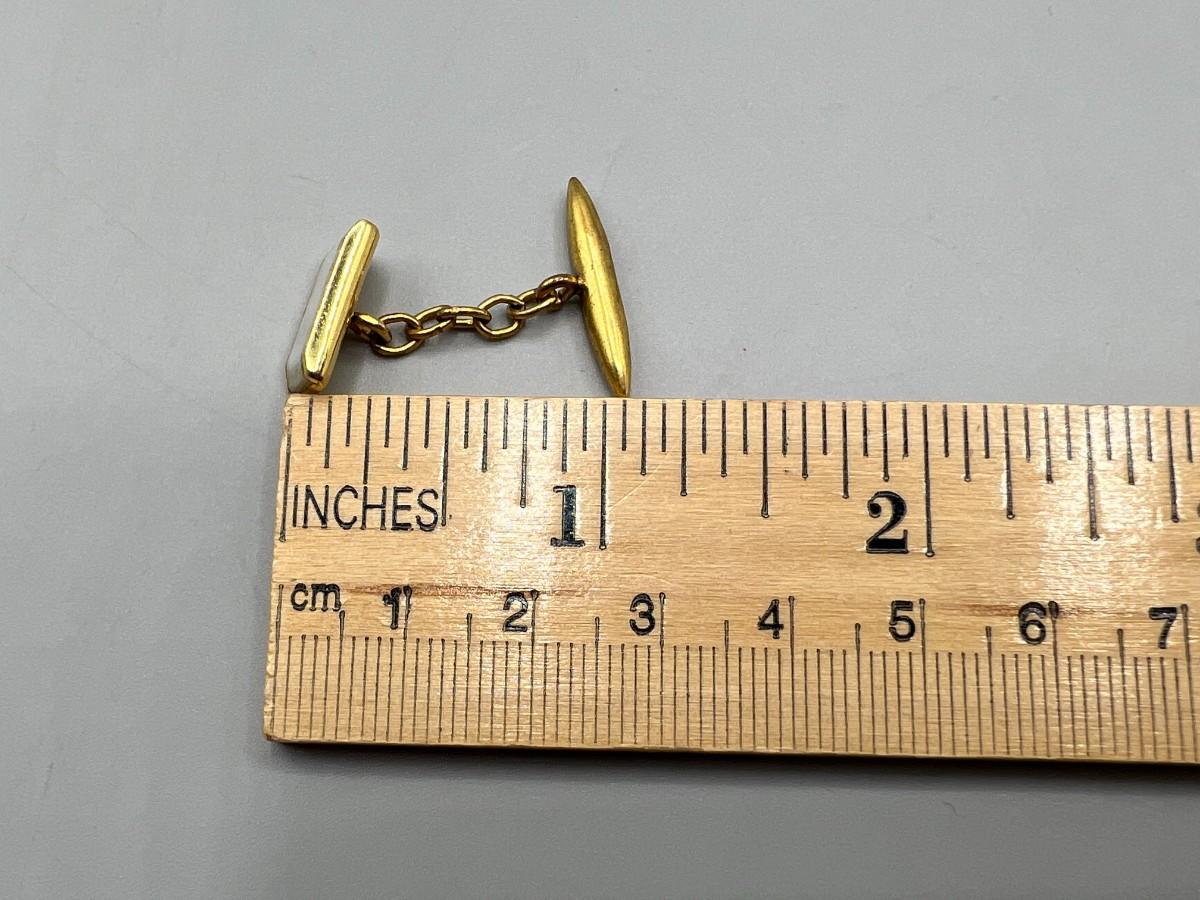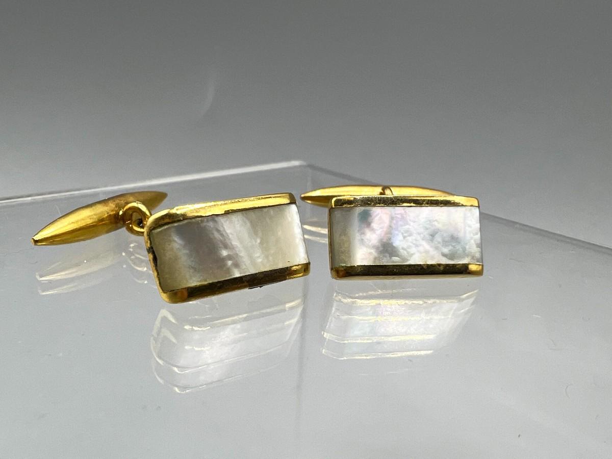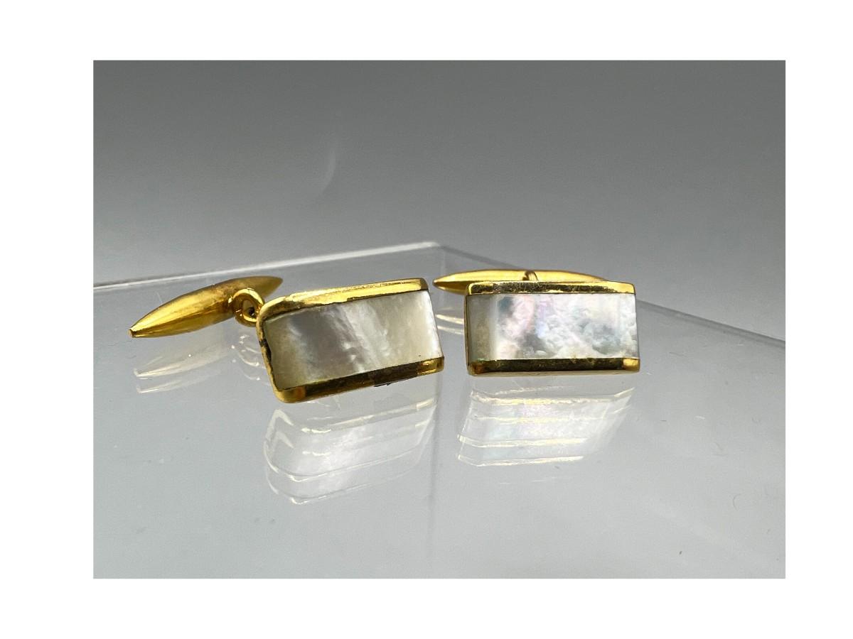 Pair of vintage bright gold tone metal and mother of pearl cuff links. Good vintage condition.