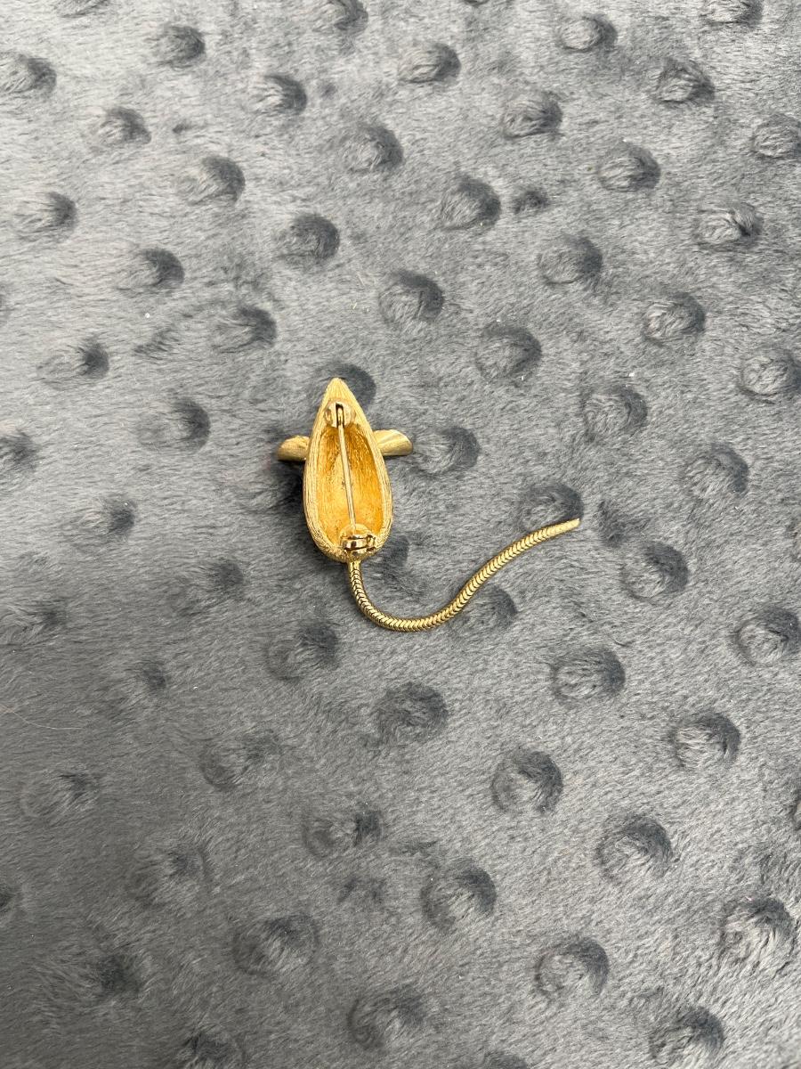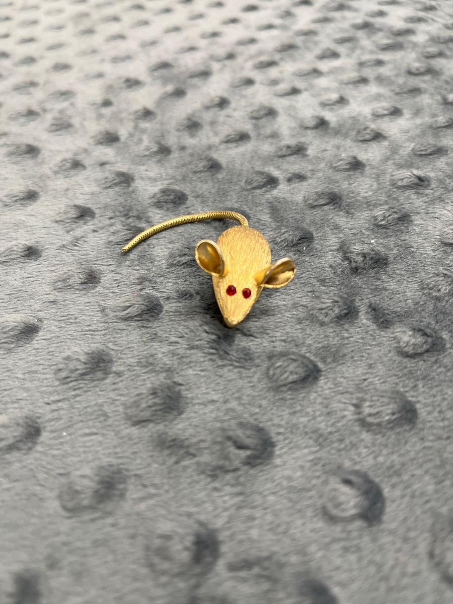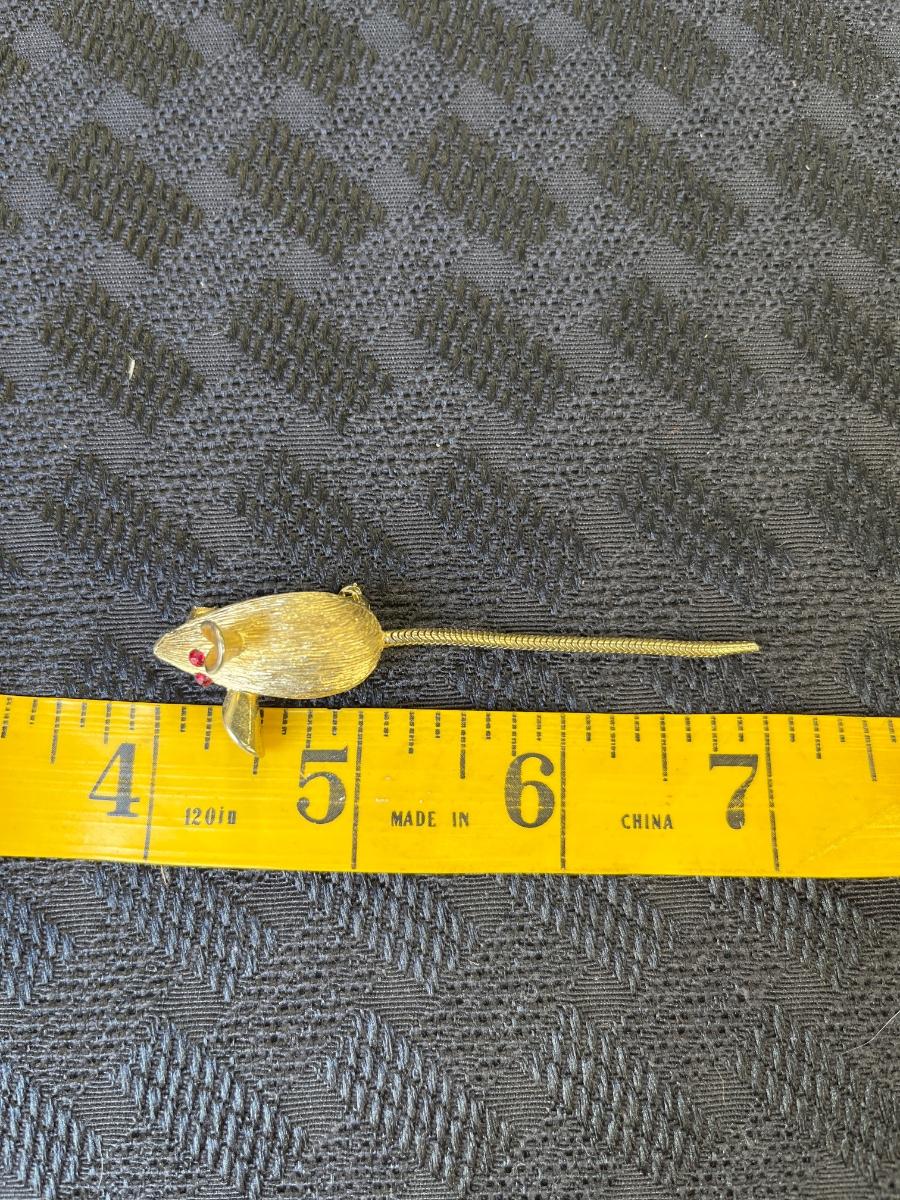 Vintage gold tone mouse with red crystal eyes brooch