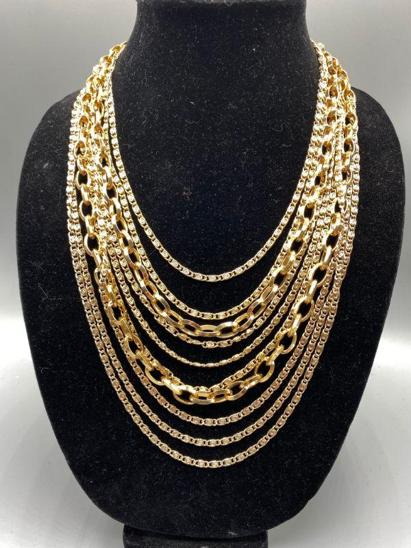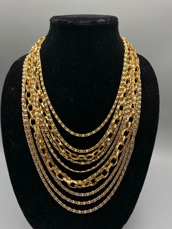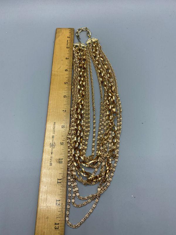Great multistrand vintage necklace. Gold tone textured metal chain, two different links. Strands lay at different lengths. Dress up or down with this statement piece. Hook closed.