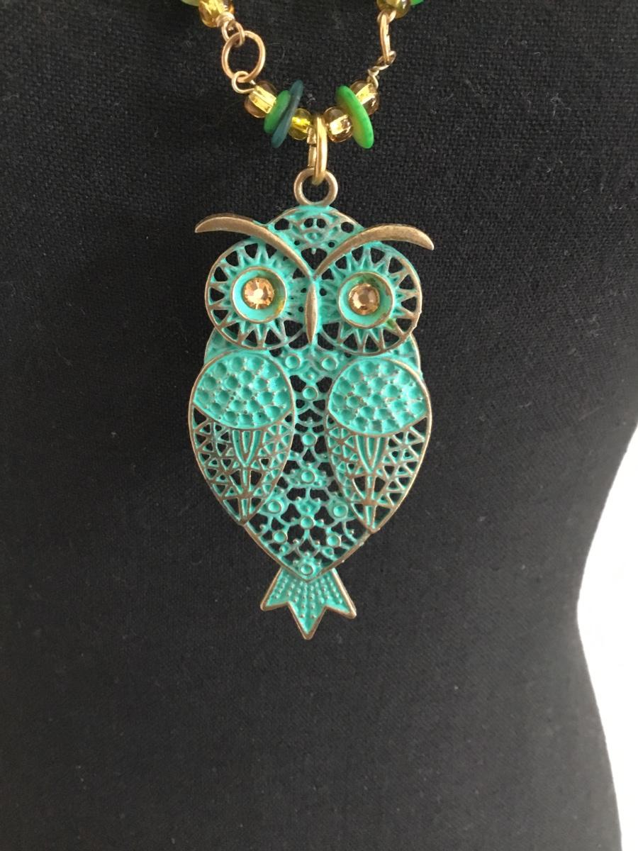 Vintage, gold tone, owl pendant green patina, embellishment , Beautiful stone and green glass beaded necklace with toggle clasp