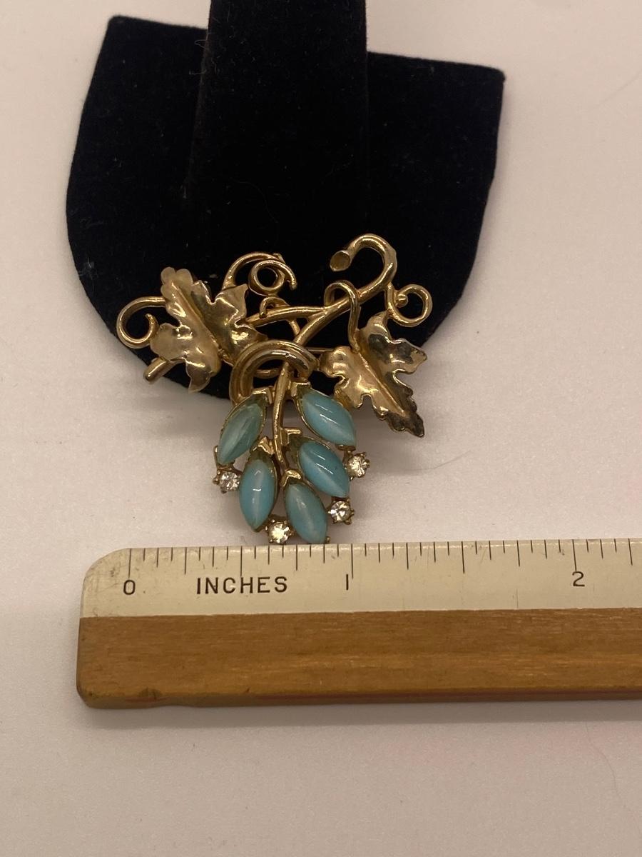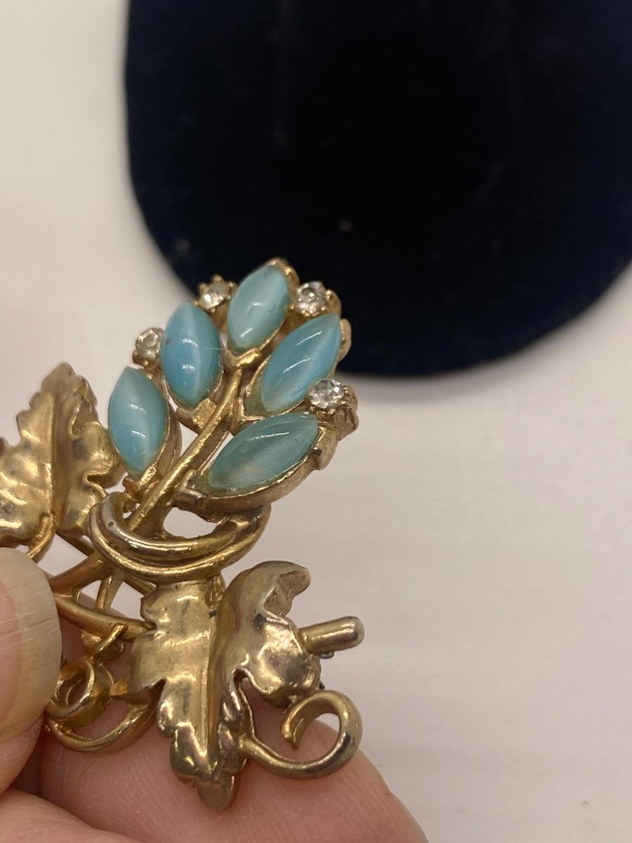 Vintage Gold Tone Pale Blue Cabochon & Rhinestone Pin Brooch. Blue cabochons have a cat's eye swirl look to them. In good condition.
