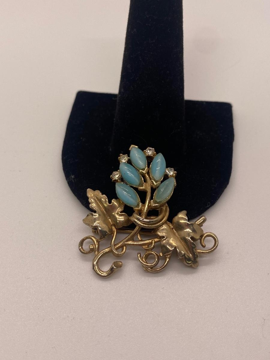 Vintage Gold Tone Pale Blue Cabochon & Rhinestone Pin Brooch