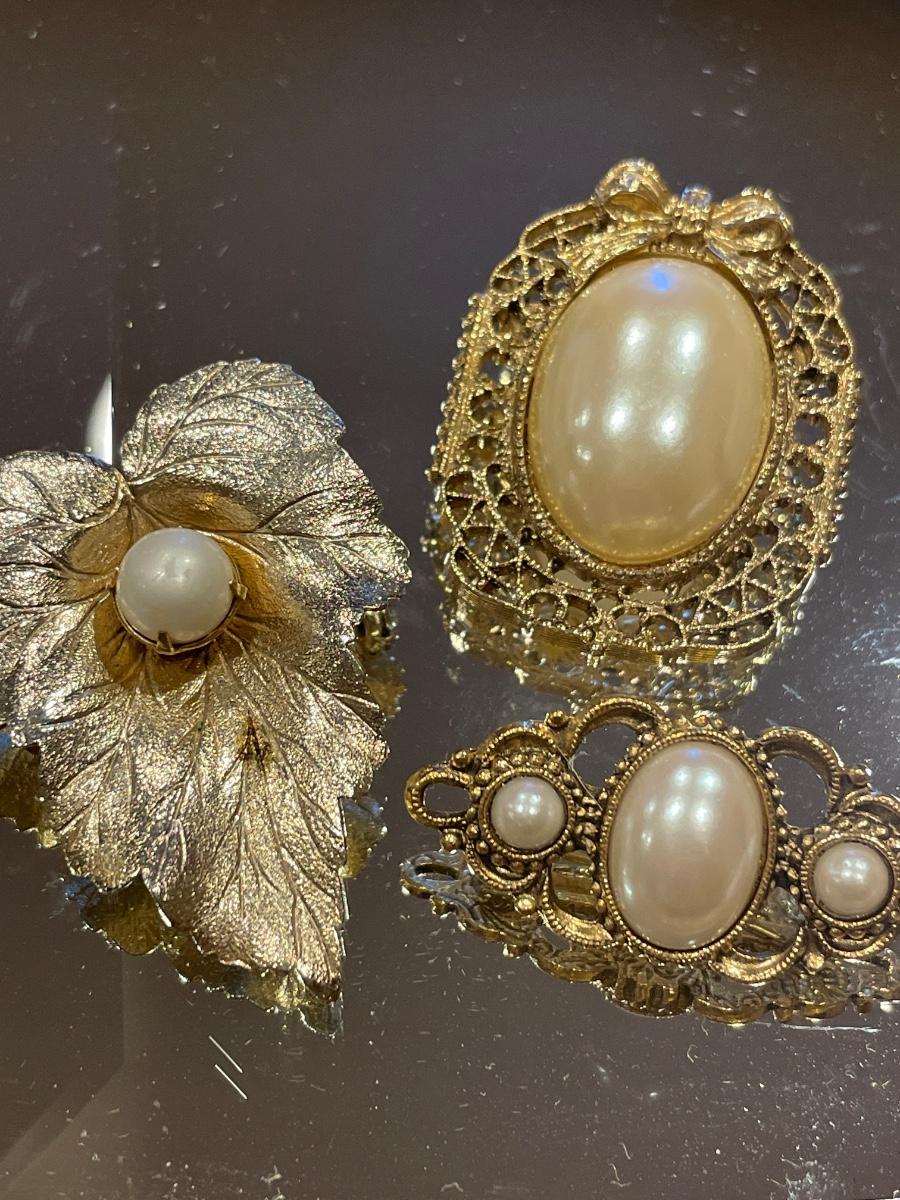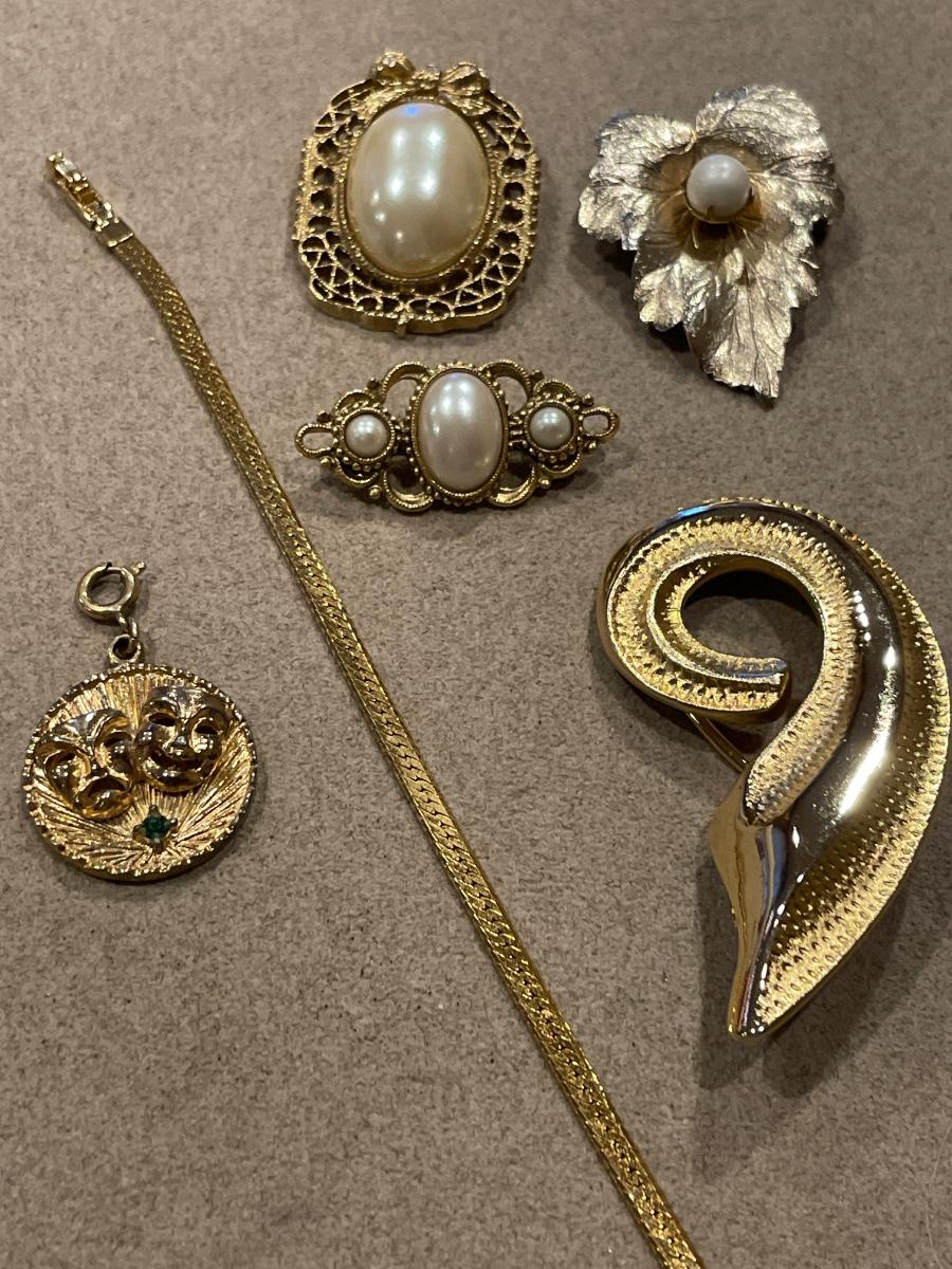 Vintage gold tone pins, scarf clip and bracelet