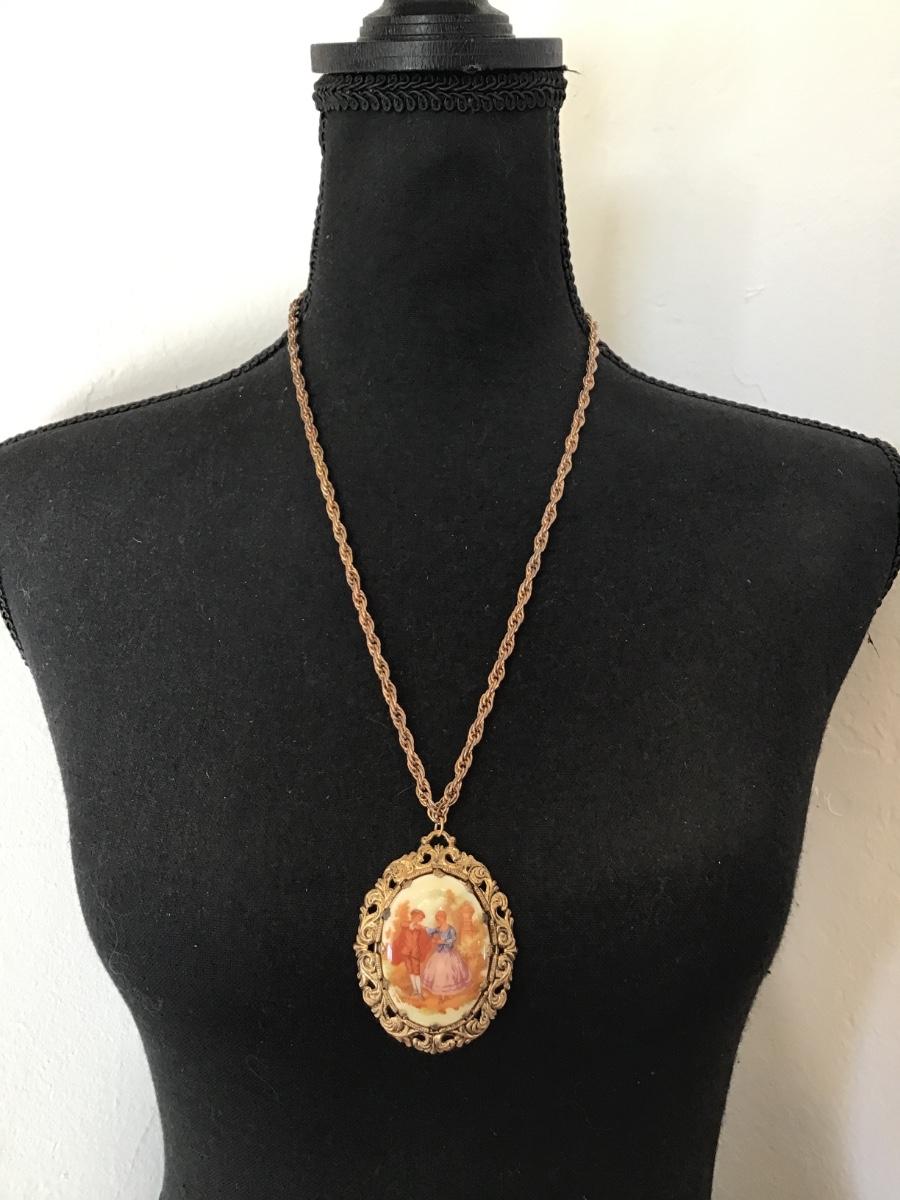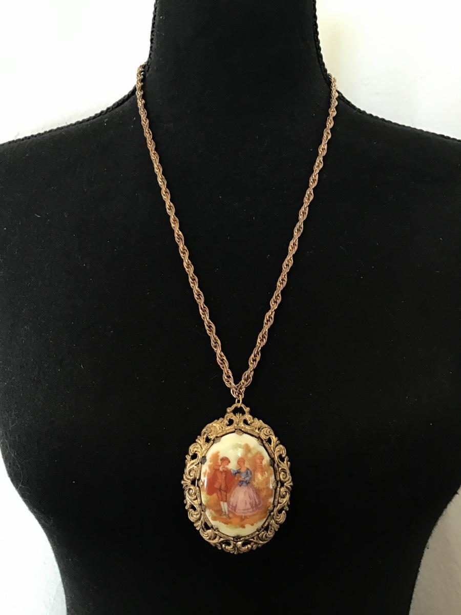 Vintage, gold tone, porcelain cameo, large statement, necklace