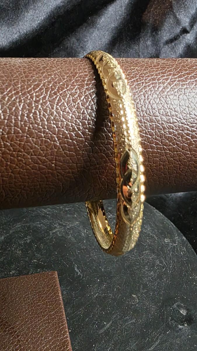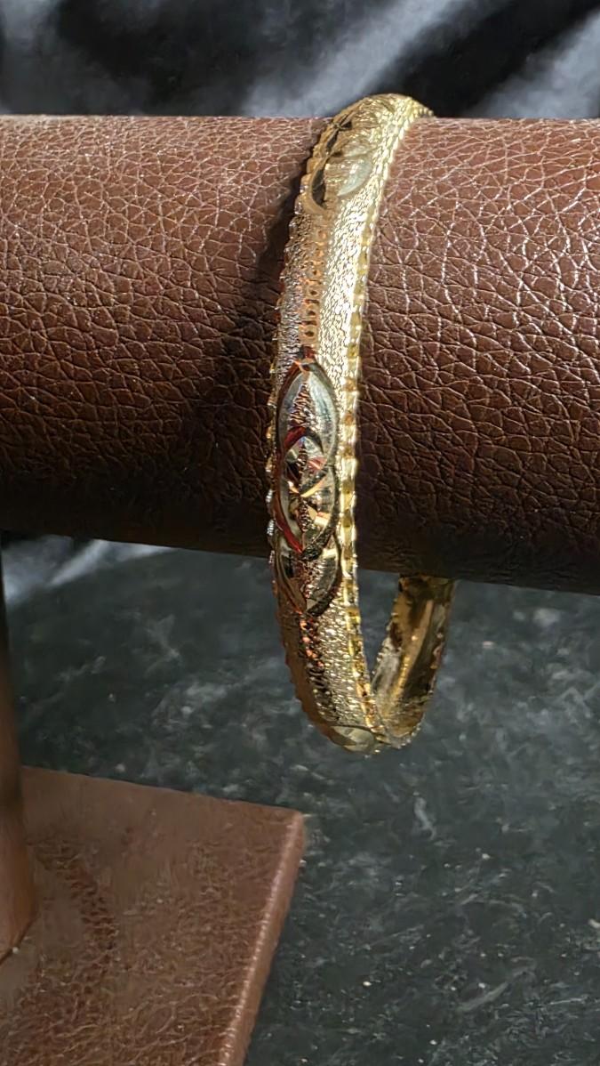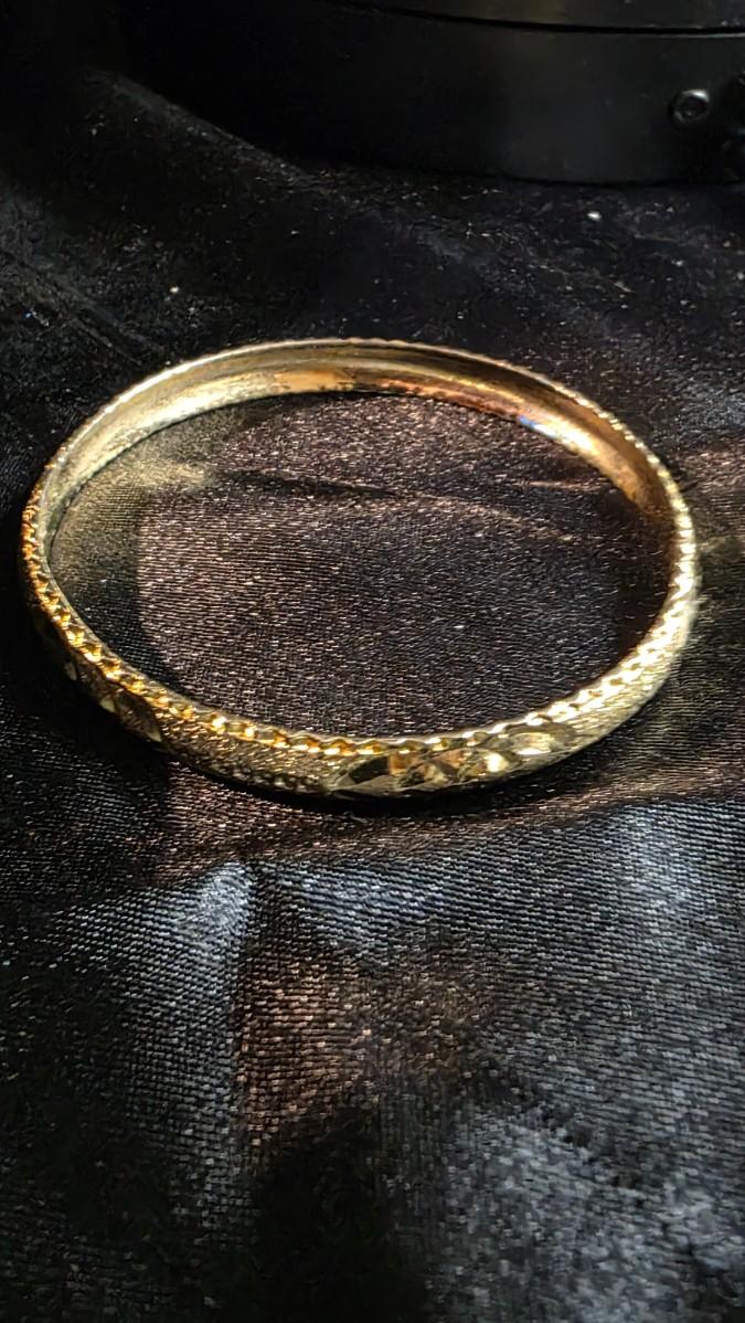 Vintage Gold Tone Textured Bangle Bracelet - Hammered Finish with AB Rhinestone Oval Accent