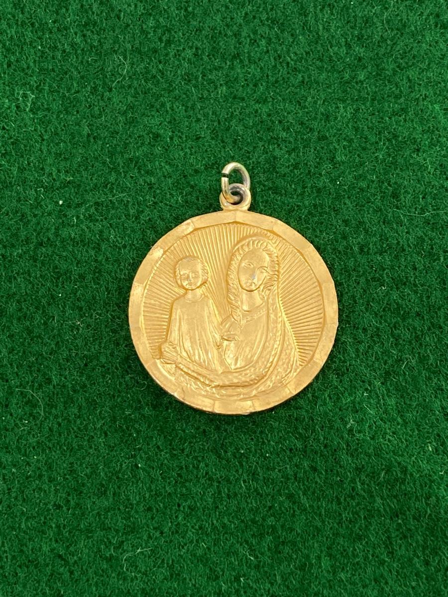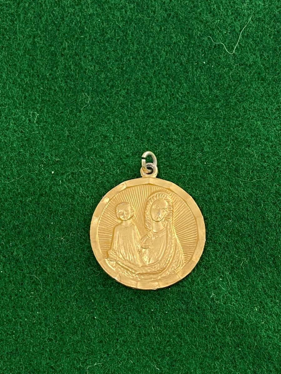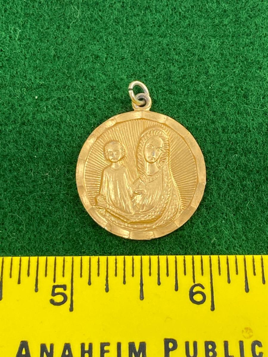 Vintage Gold Tone Virgin Mary & Child Round Pendant Charm. Made in Germany. No gold marks. About 1" size.