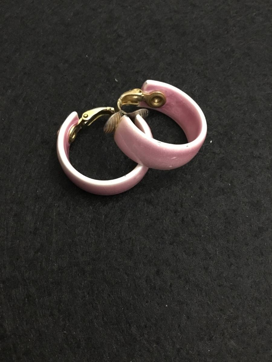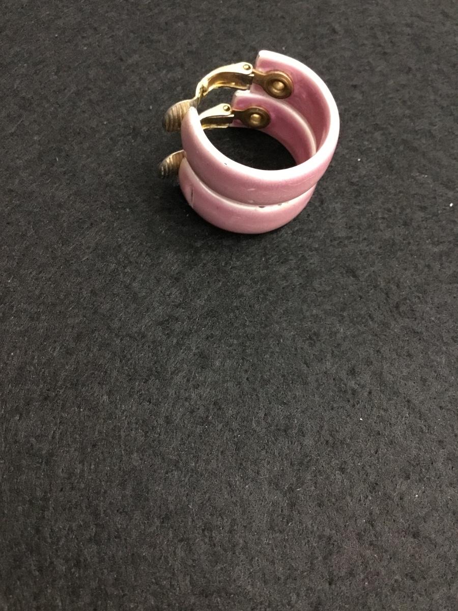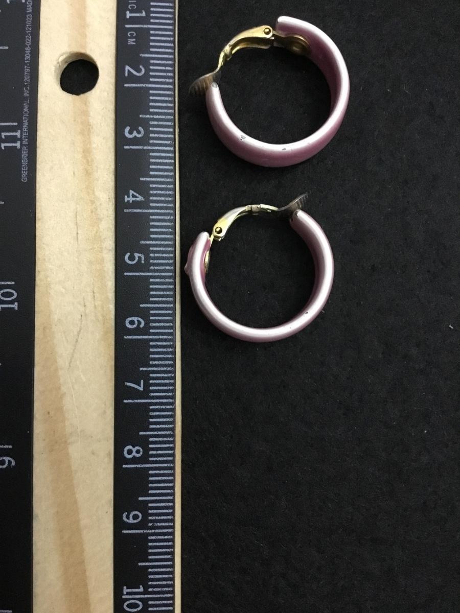 Vintage, gold, toned, baby blush shimmery, pink enameled hoop clip on earrings