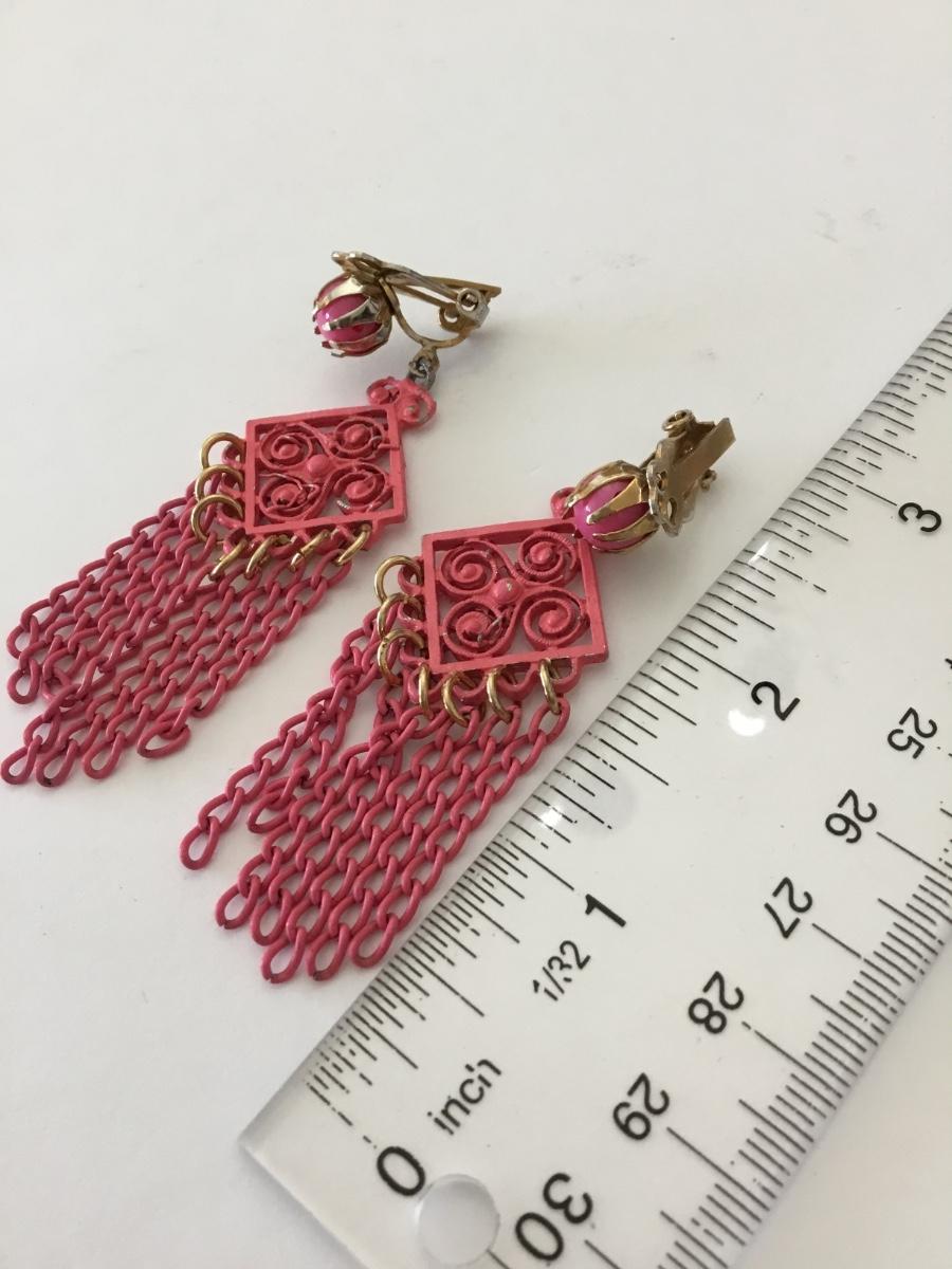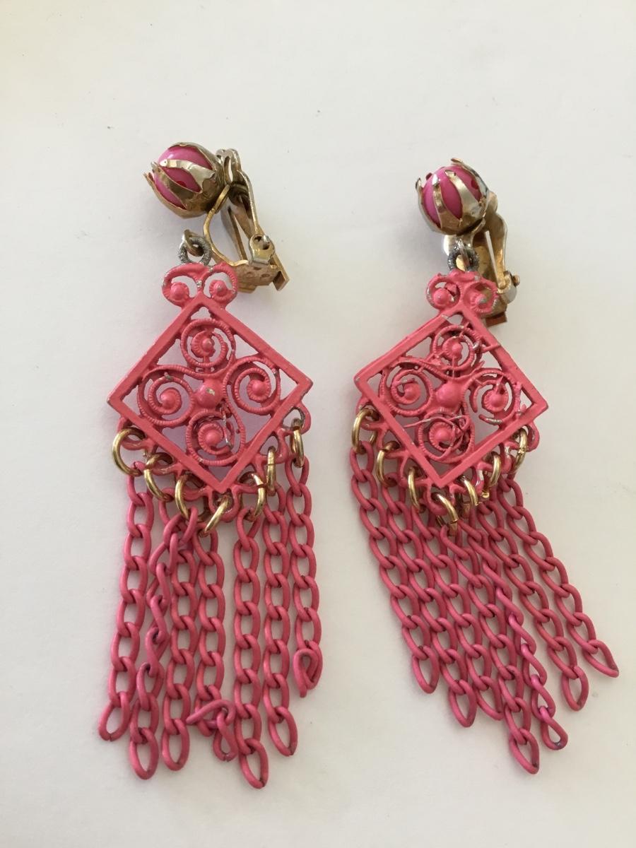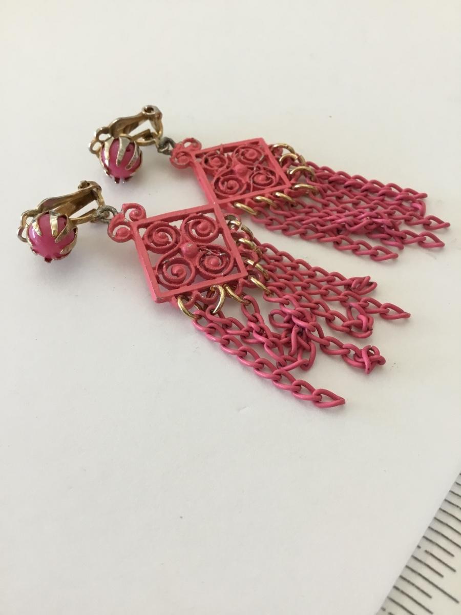 Vintage gold, toned enamel pink clip on tassel dangle earrings