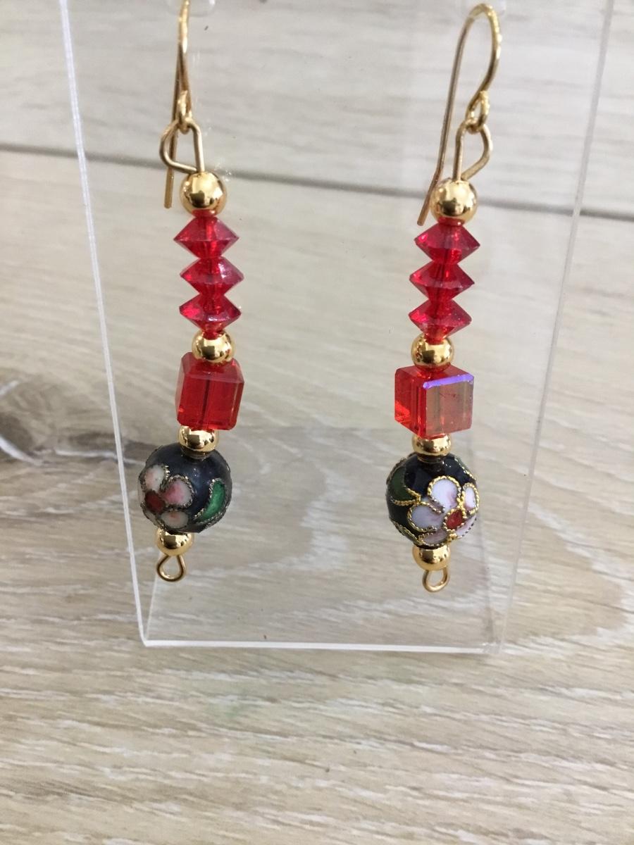Vintage Gold toned, red crystal & cloisonné enamel drop Dingle earrings