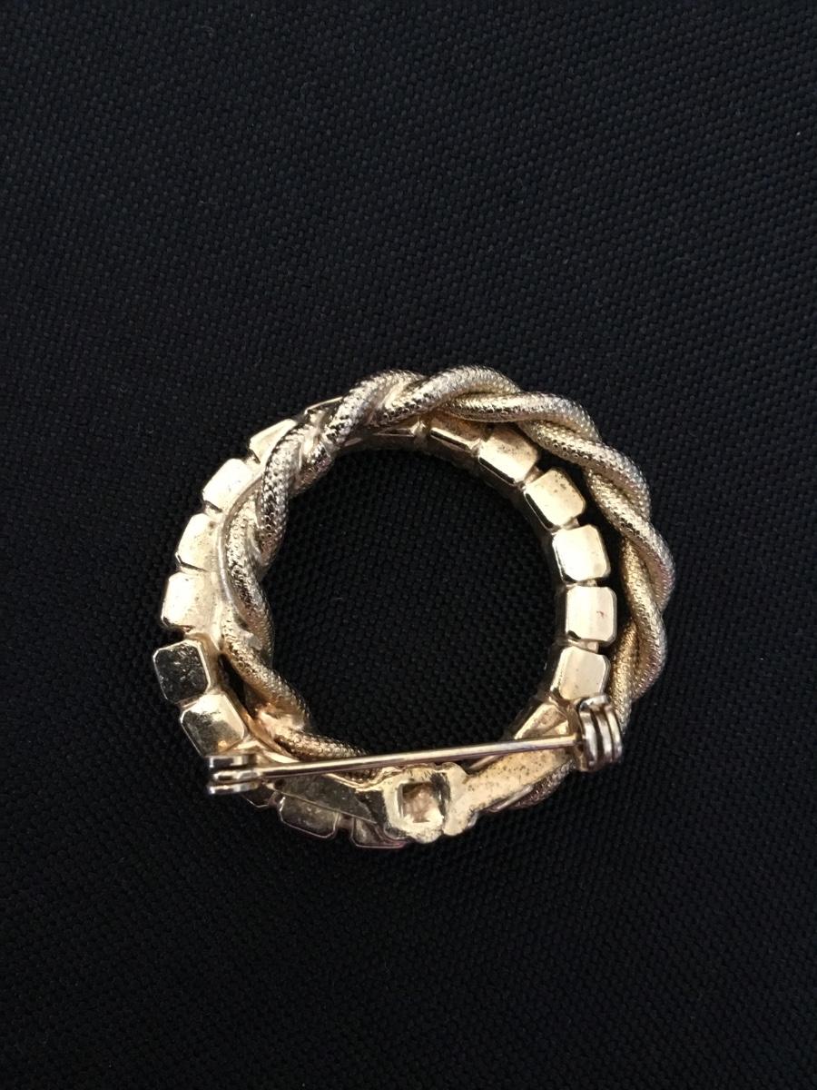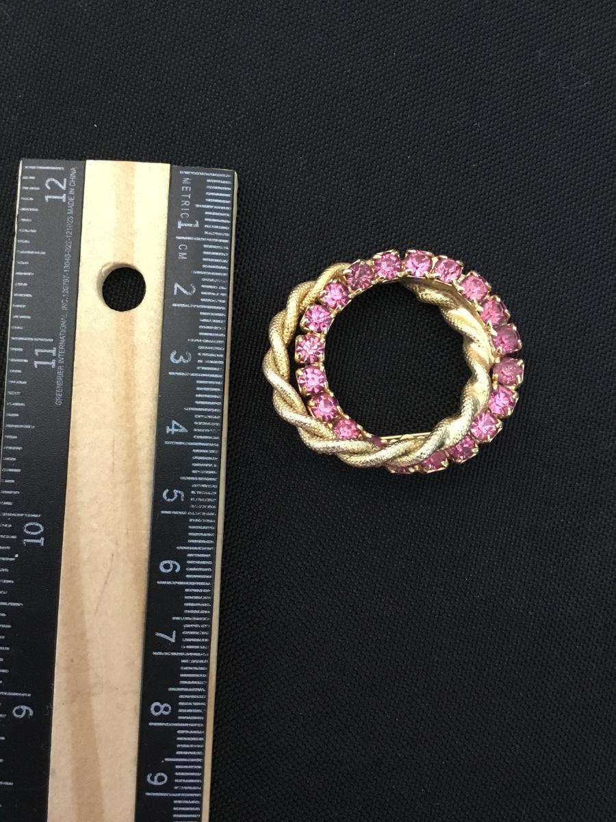 Vintage gold toned , twisted robe double circle, pink rhinestone brooch