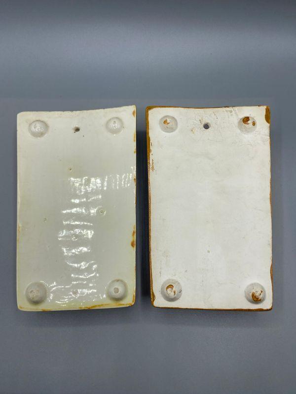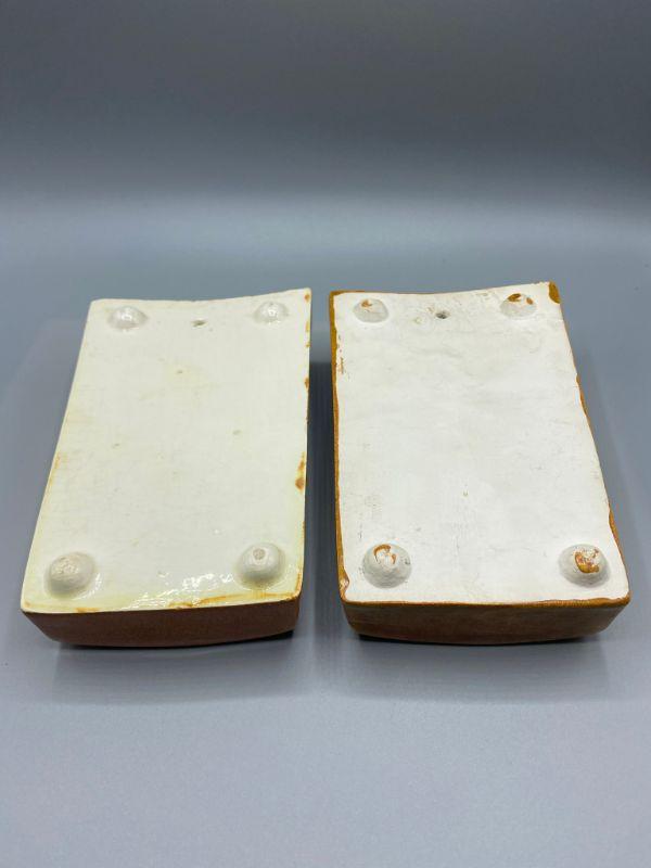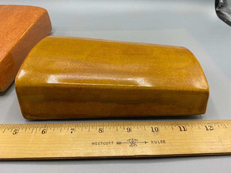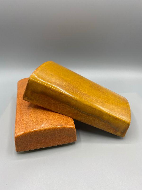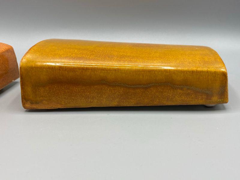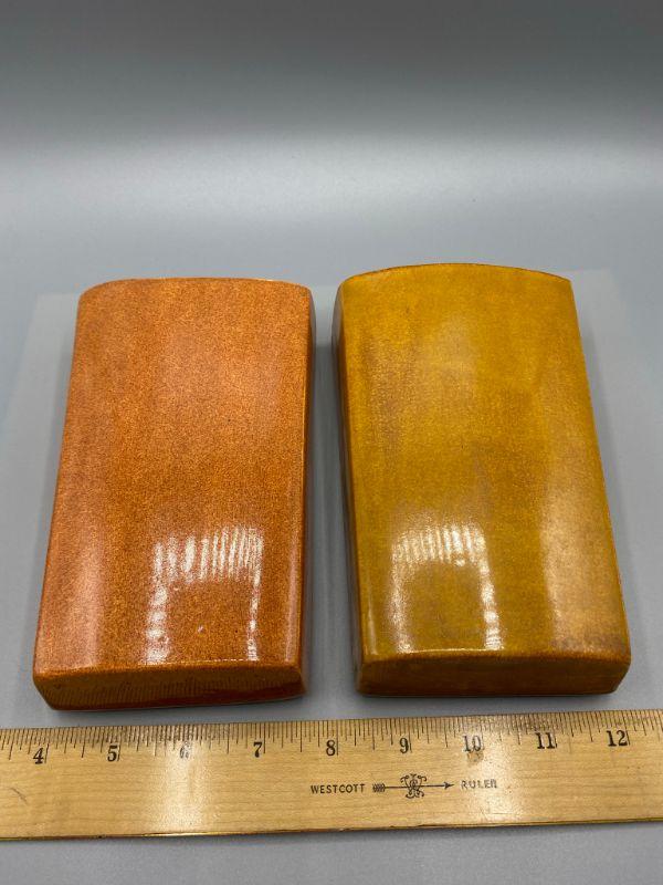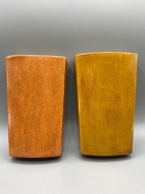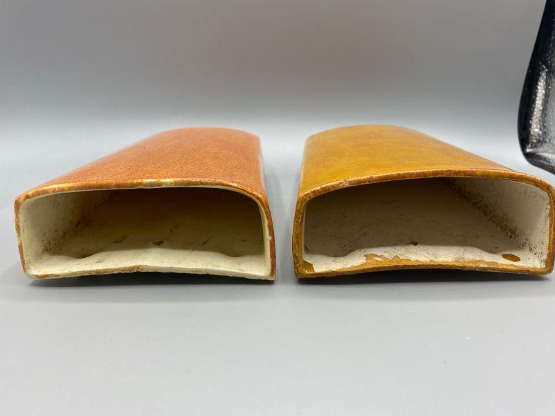 Pair of vintage wall pockets. Narrow wall vases. One has a yellow gold finish, the other is a bit more orange colored. Good condition. About 7" length. Unmarked.