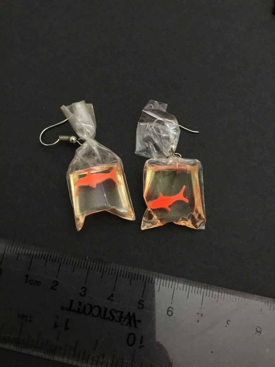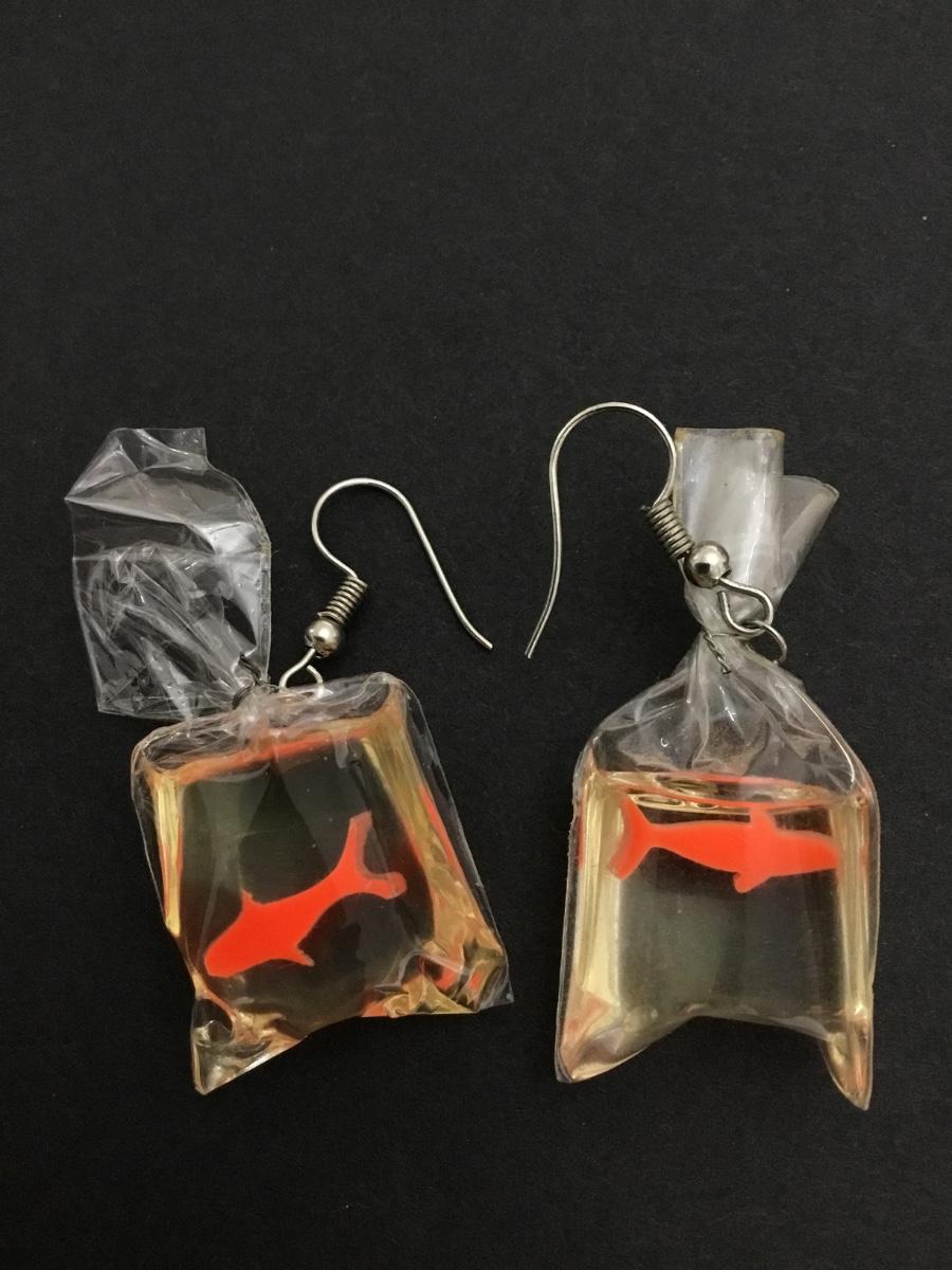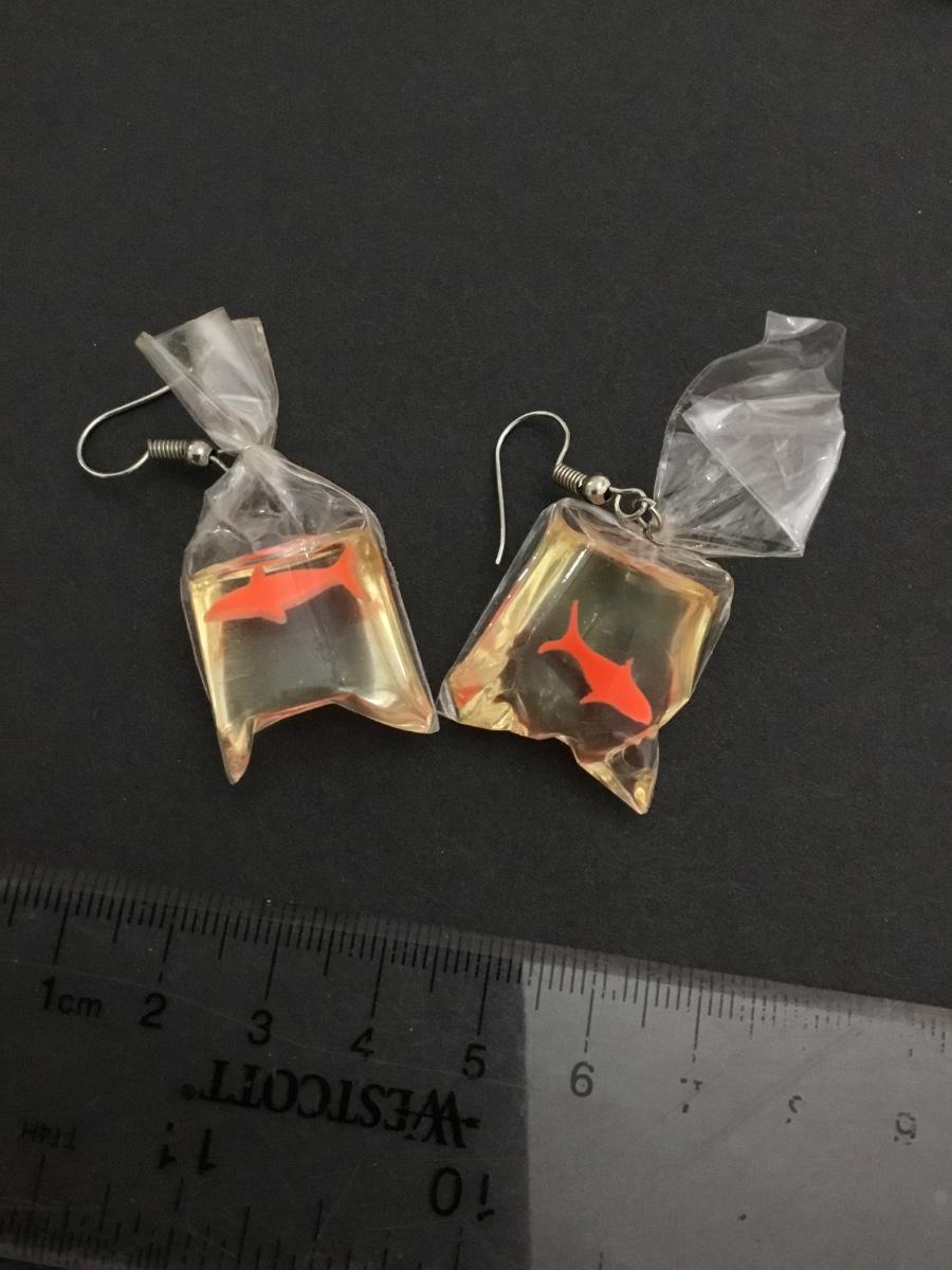Vintage, goldfish, and a water bag, resin dingle cellophane novelty earrings