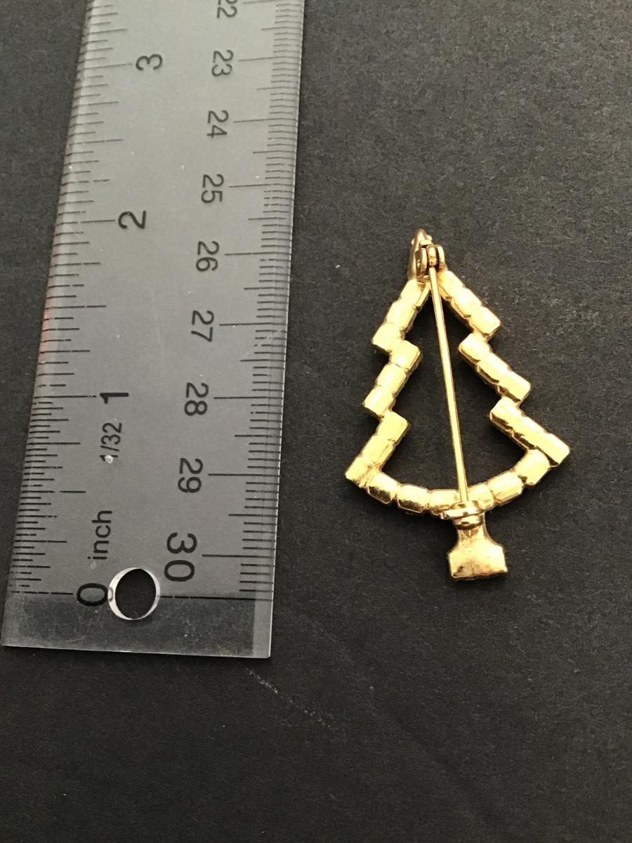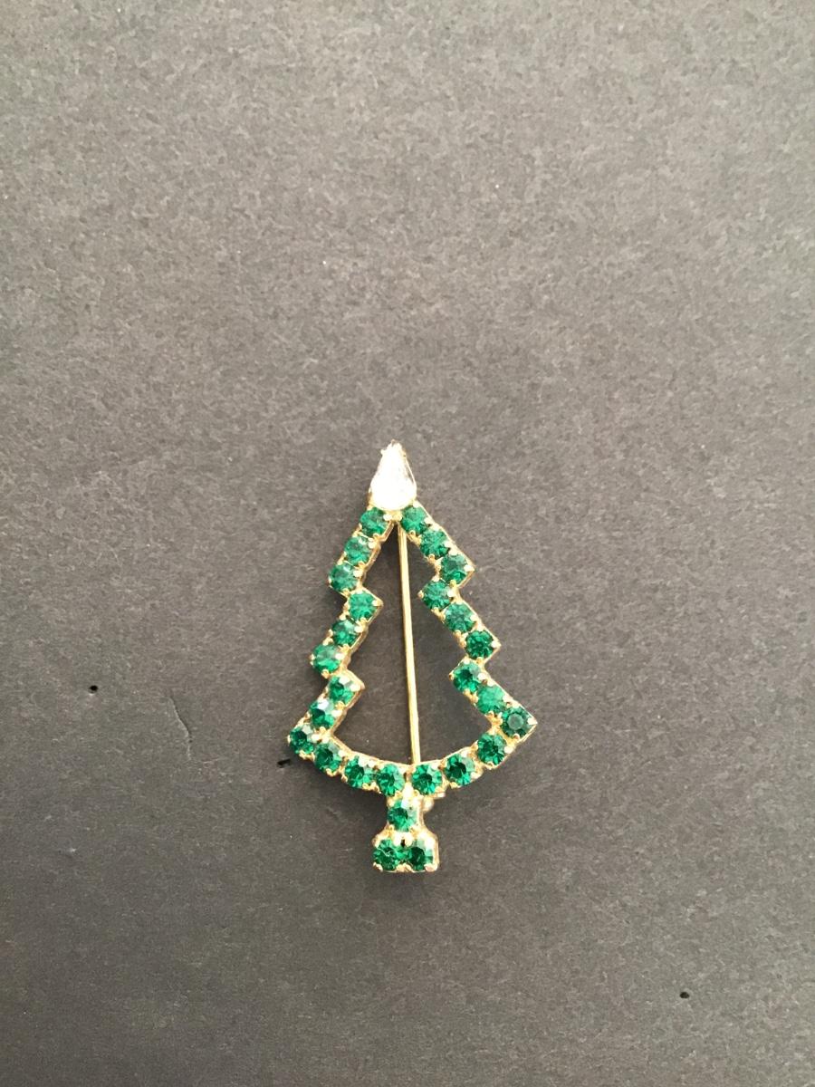 vintage goldtone Christmas tree brooch with green rhinestone. Please see attached photos.