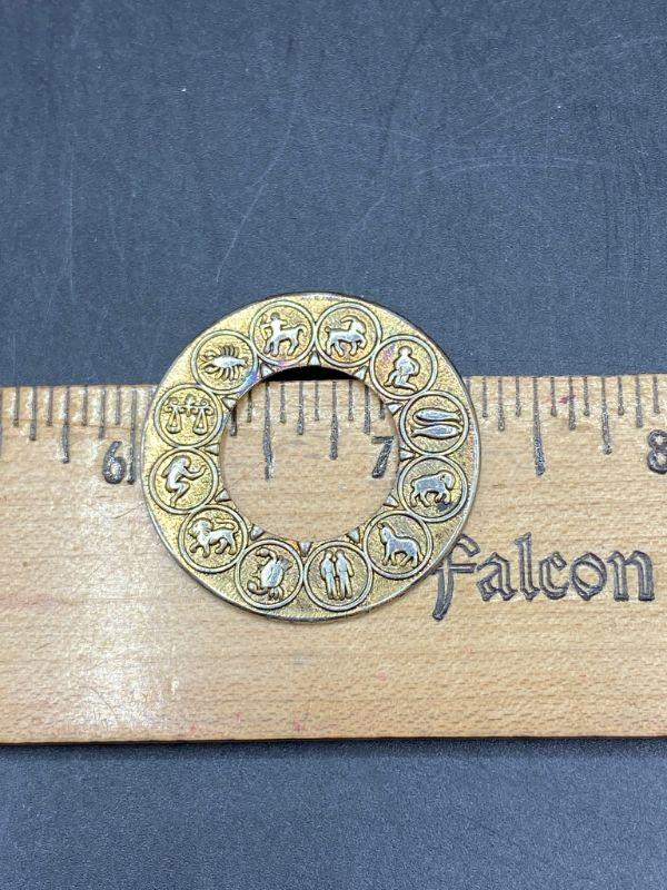Vintage goldtone circle astrology themed pin. Has images of all the horoscope signs around it. About 1.25" size.