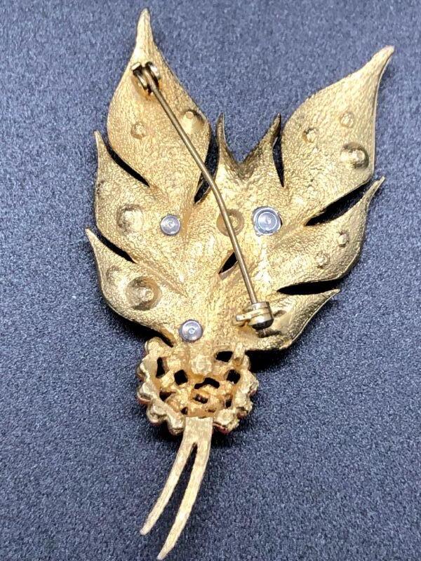 Vintage goldtone leaf brooch. Goldtone setting with white enamel and coral cabochon accents. Good condition.