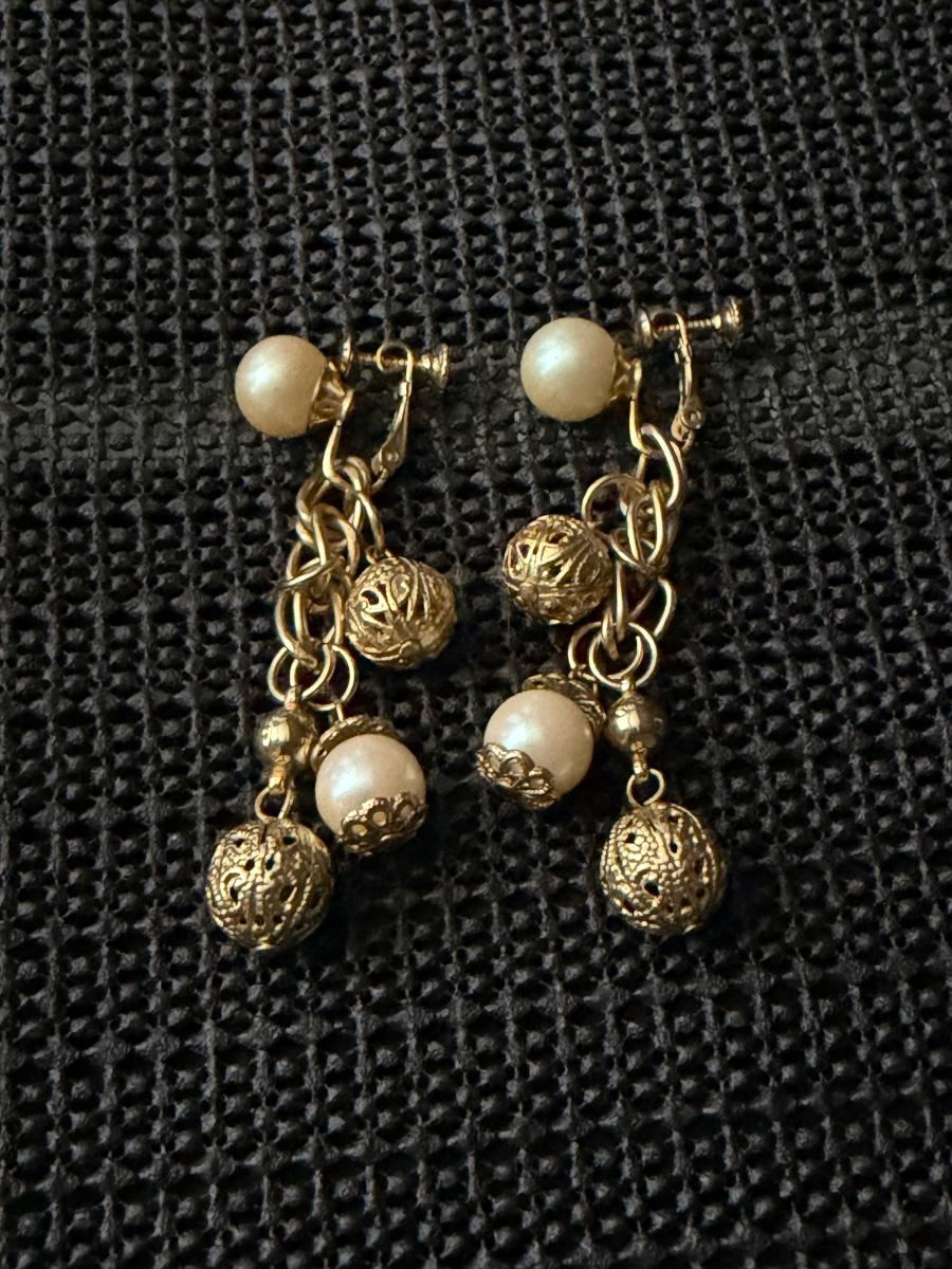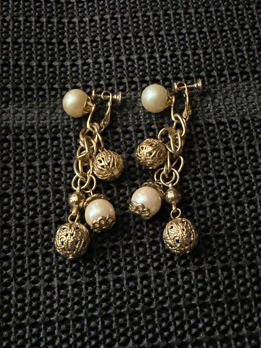 Vintage gold-tone dangle and drop screw-back earrings with faux pearls and filigree balls.