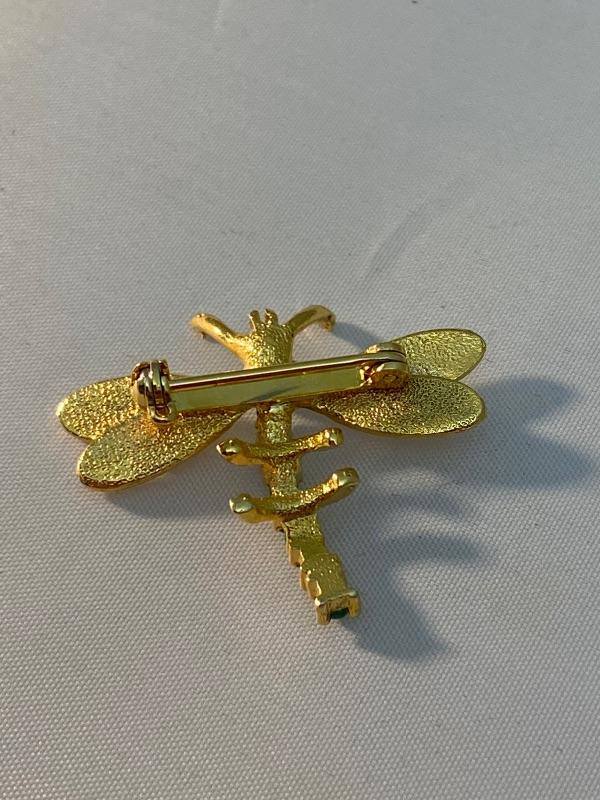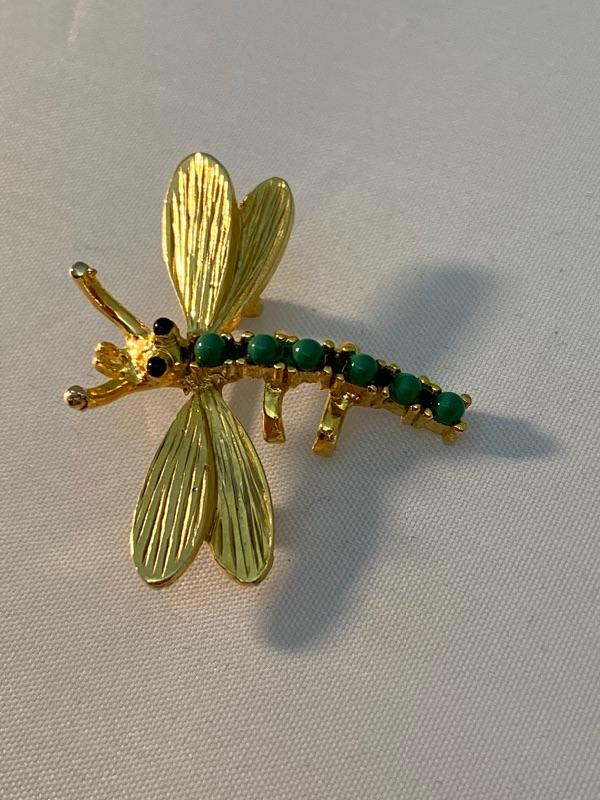 Vintage Dragonfly Pin. Brushed goldtone metal with green cabochon dots along its body. Black eyes. About 1".