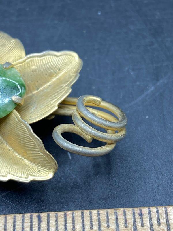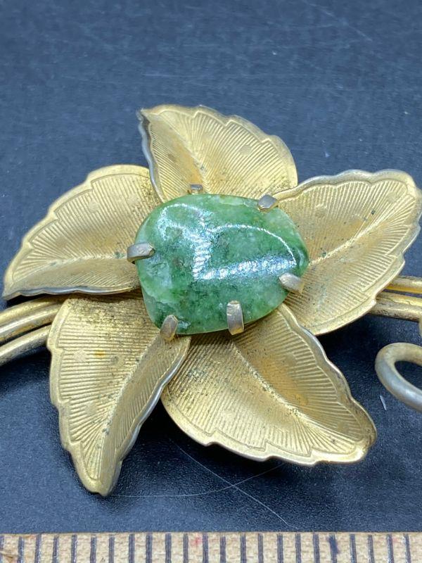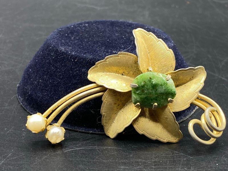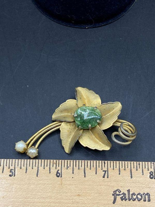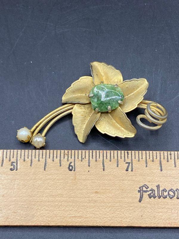 Vintage goldtone flower pin. Flower has a green flecked polished stone center and faux pearls. There is some discolor to the metal, unsure how clean it may get. About 2.5" size.