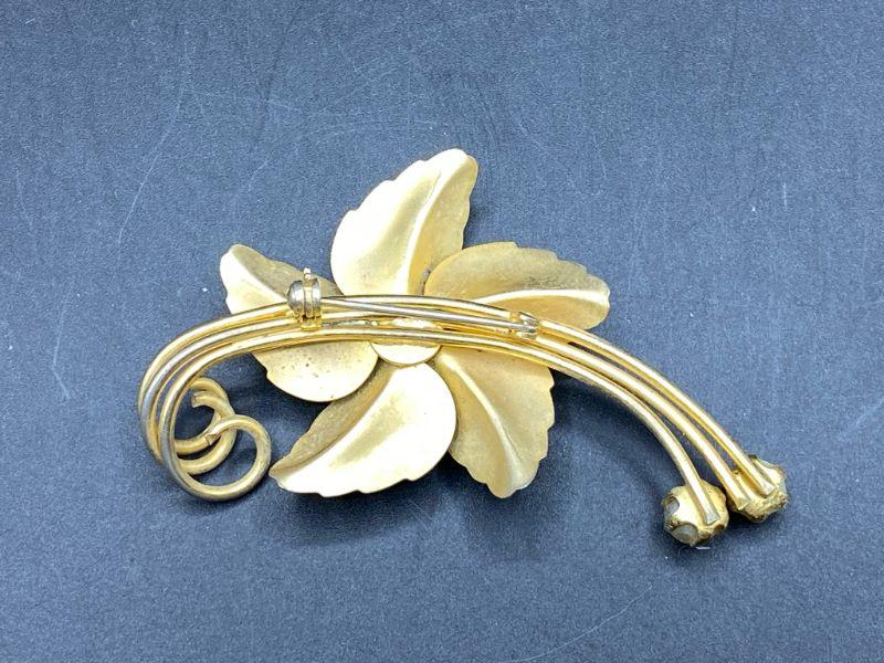 Vintage Goldtone Floral Brooch Green Stone Faux Pearls