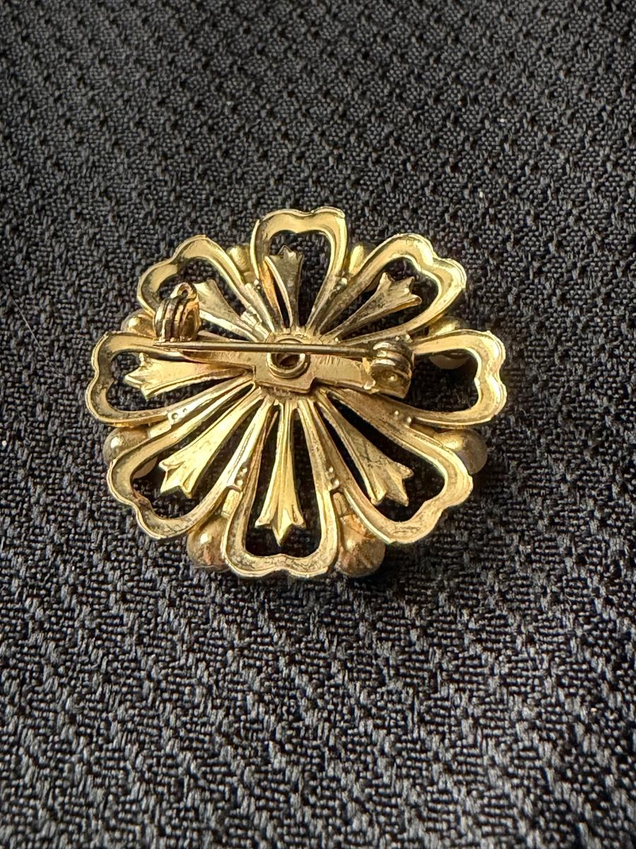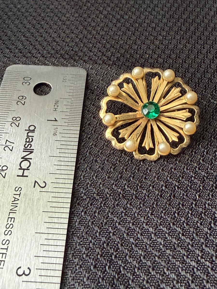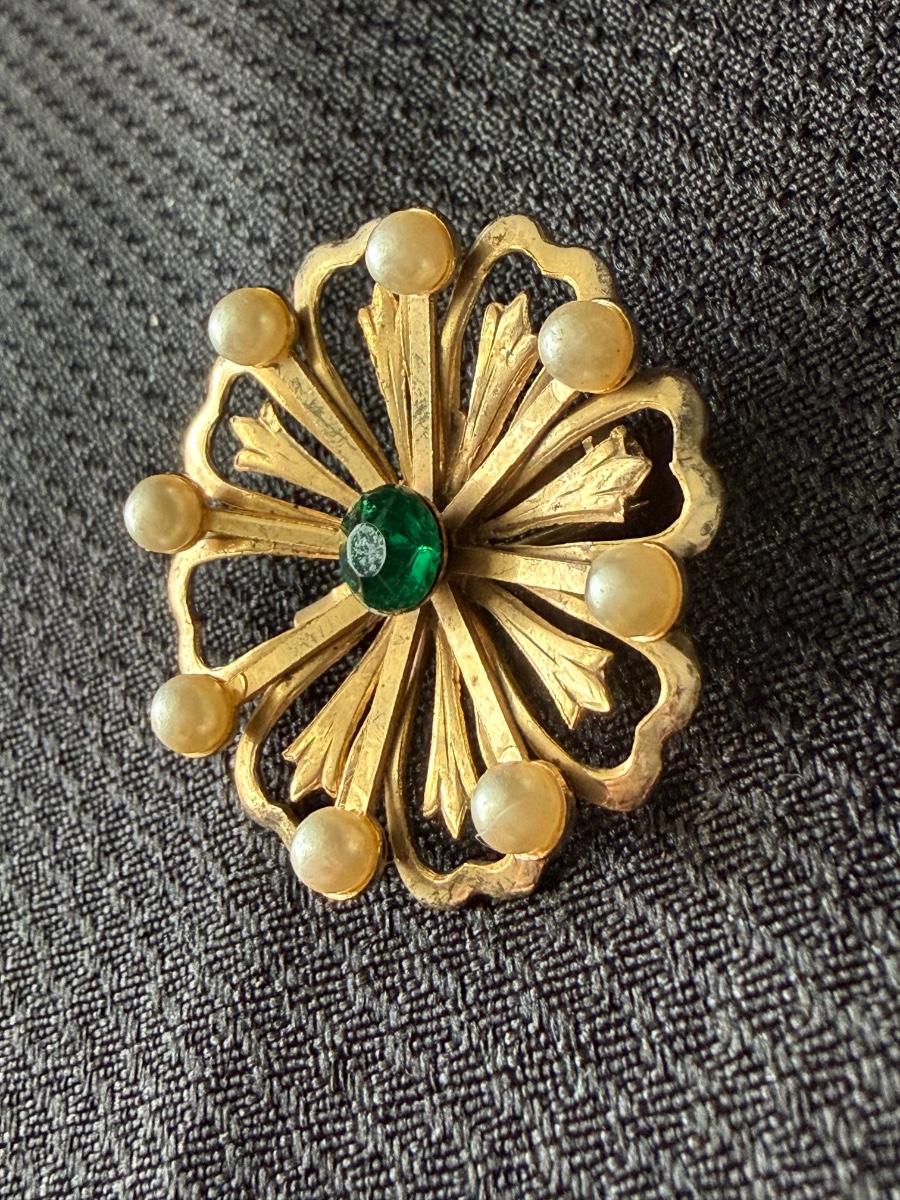 vintage gold-tone floral brooch with a central green rhinestone and faux pearls.