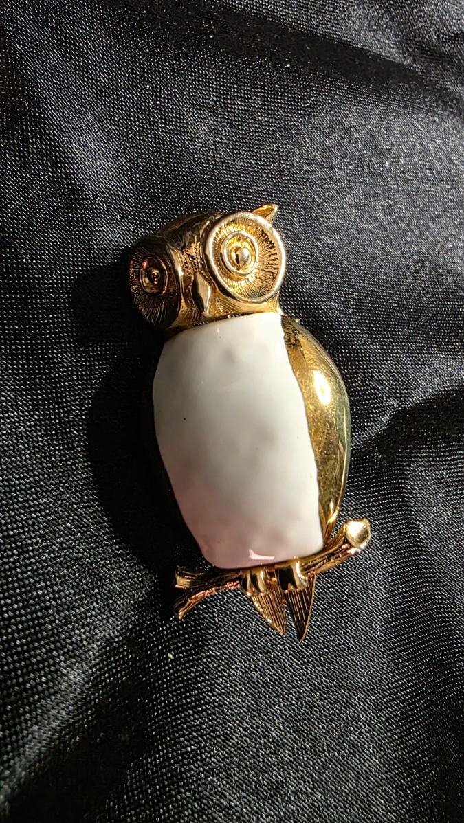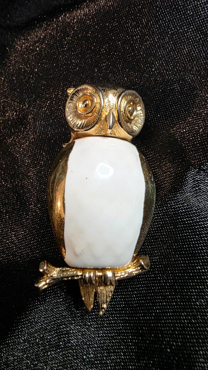Vintage Gold-Tone Owl Brooch with White Enamel Body – Charming Mid-Century Style