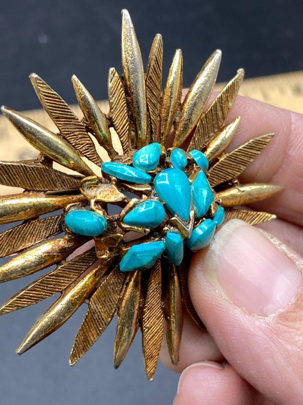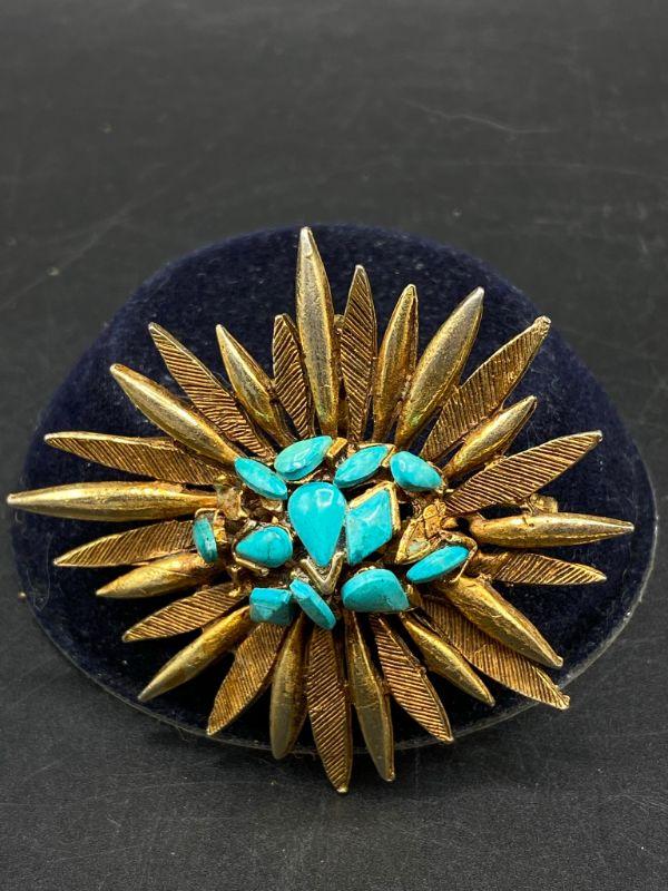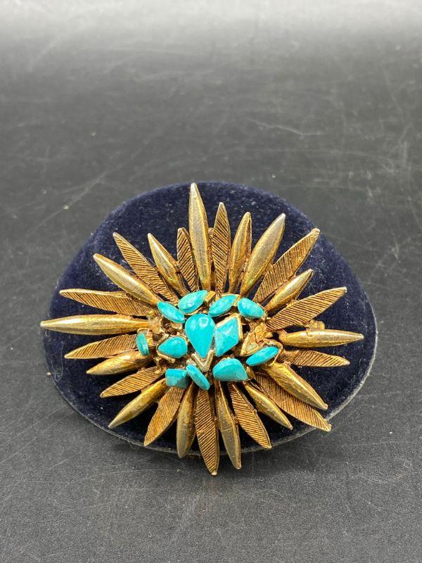 Vintage goldtone starburst pin. Textured pattern. Small faux turquoise set in the center. Light discoloration. It looks like it is missing a couple stone pieces, but looks good as is. Measures about 2.5".