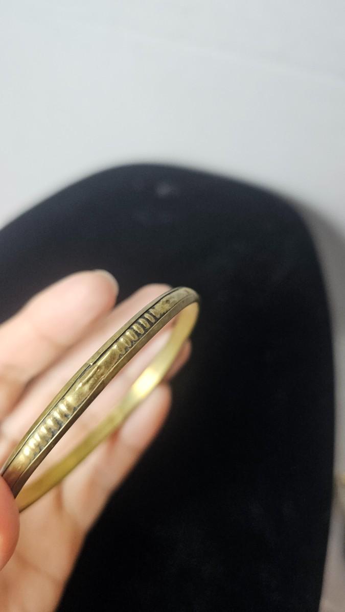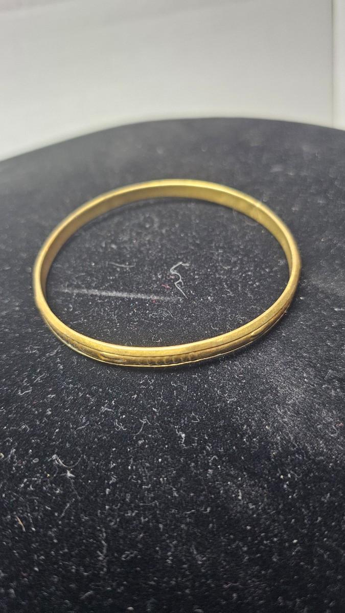 This vintage bangle bracelet features a warm gold-tone finish with a clean, structured silhouette accented by evenly spaced raised stud detailing along the exterior. The design balances simplicity with subtle edge, making it an easy everyday piece that layers effortlessly with other bangles or stands confidently on its own.
