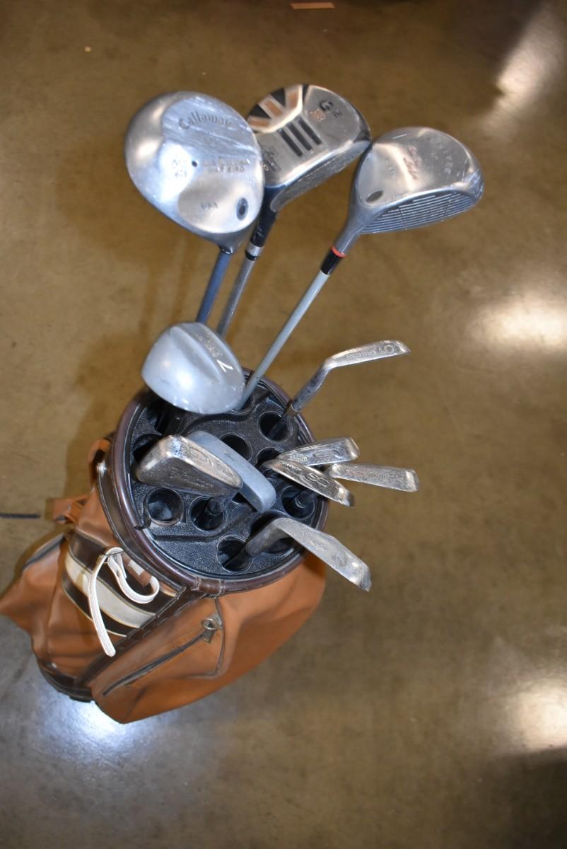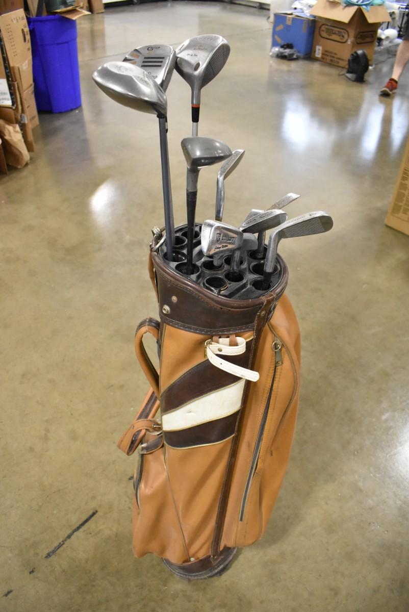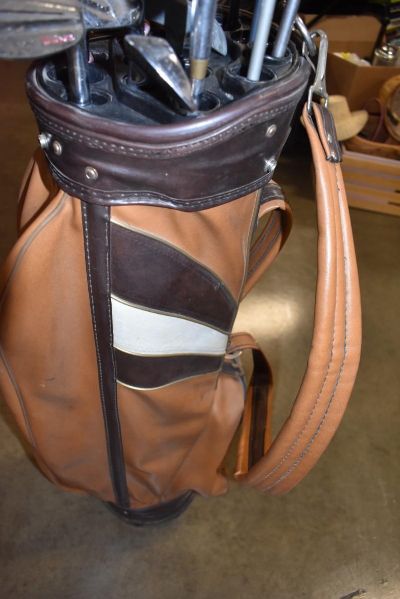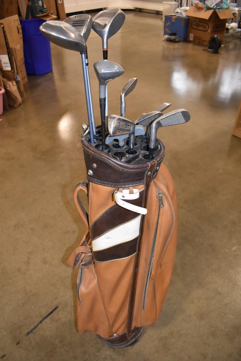 Vintage Golf Bag with 11 golf Clubs. Tan/Brown