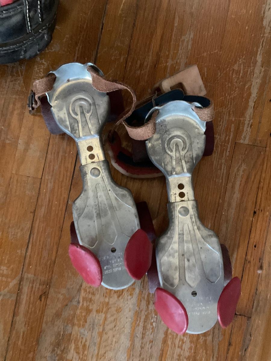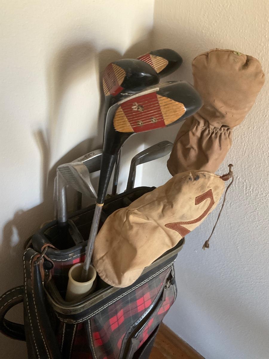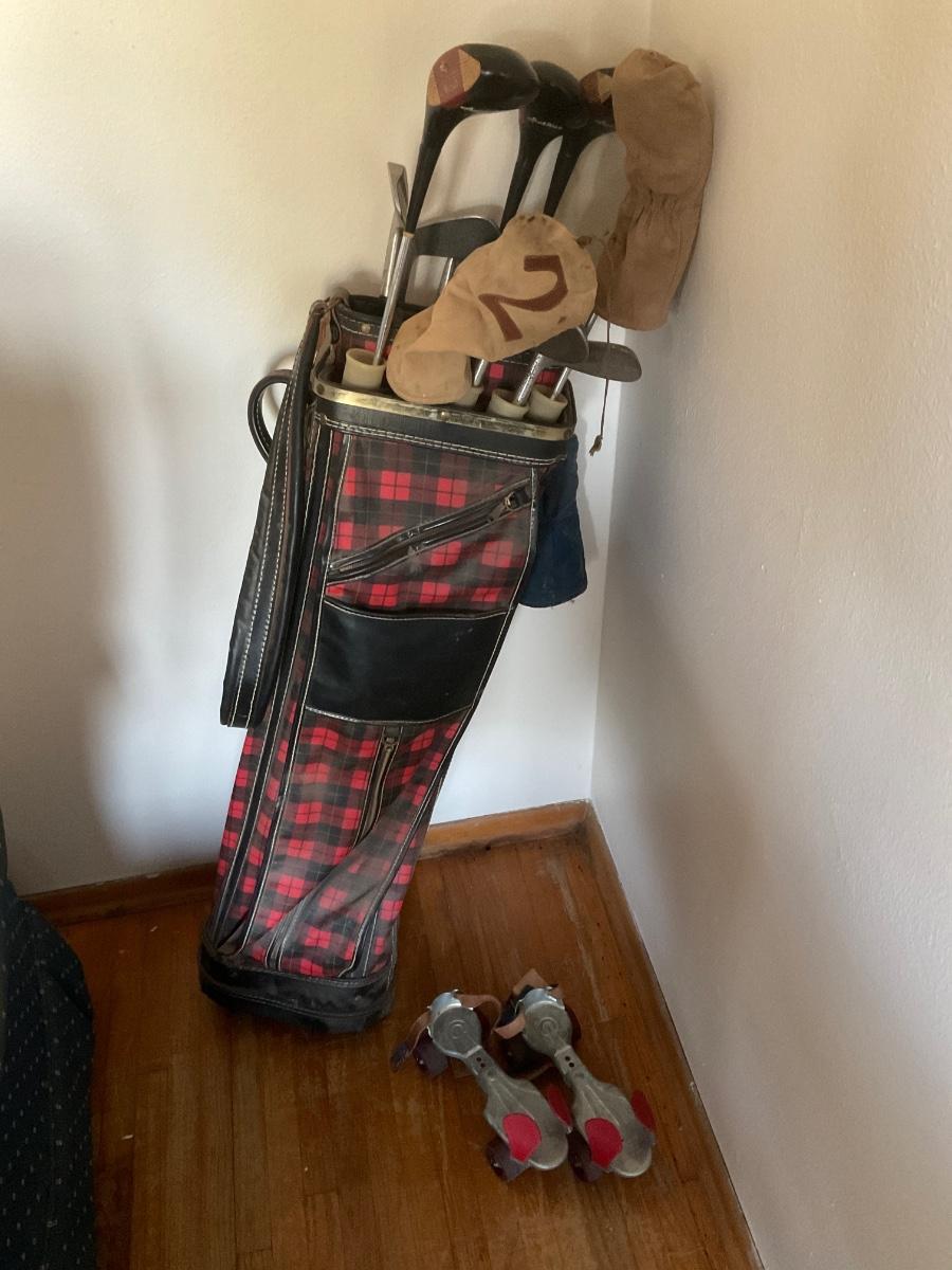 Vintage golf clubs and rollerskates