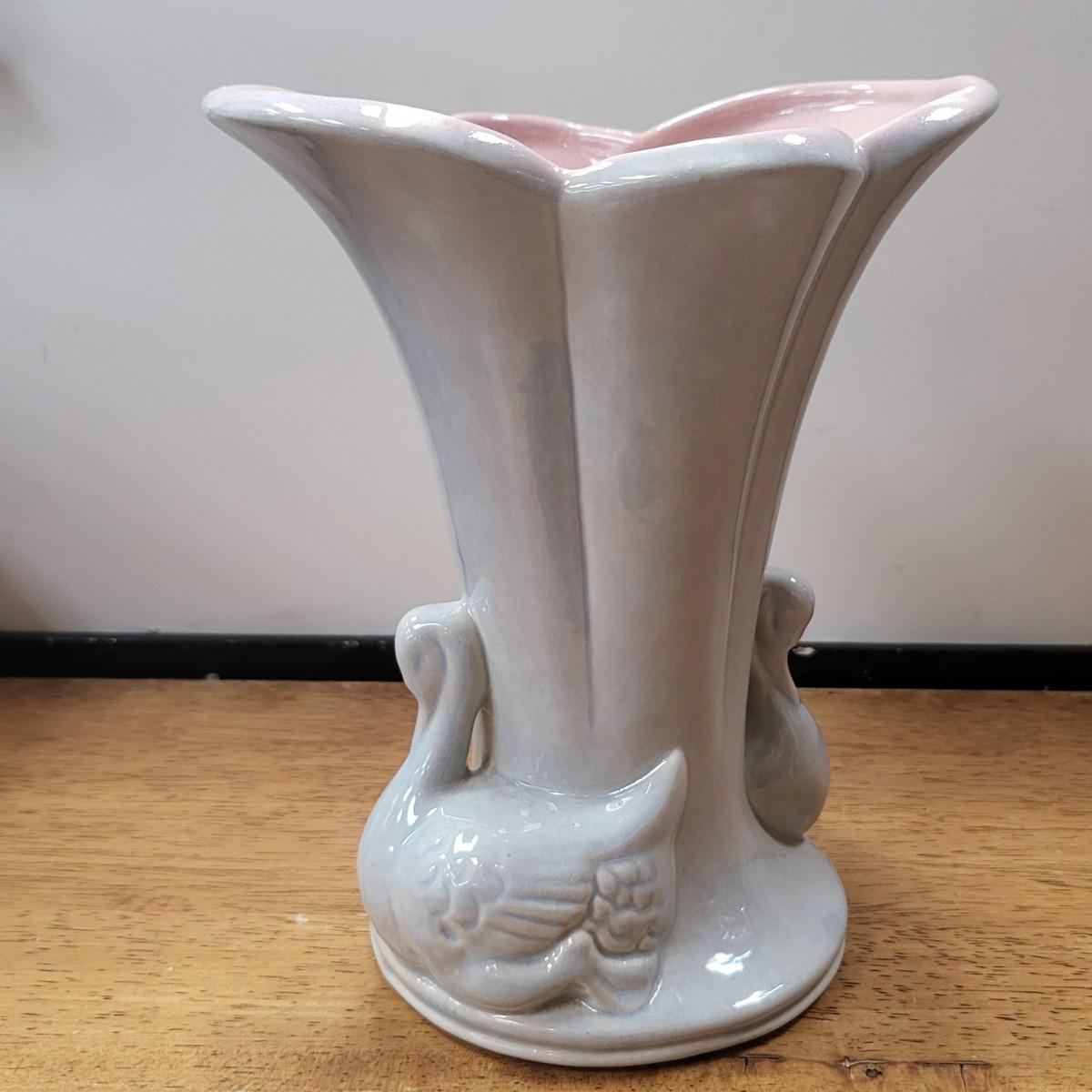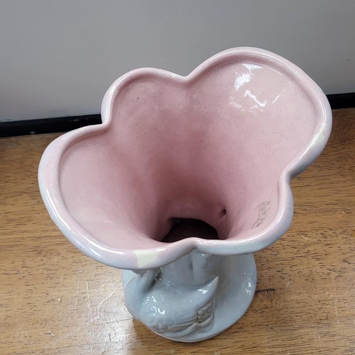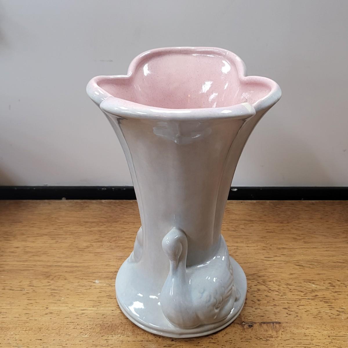 Grey glazed exterior, double swans base, and pink glazed inside. No chips, cracks or breaks but appears a small spot where it did not glaze during manufacturing. Measures 8" tall x 6.75" wide x 5.5" deep.