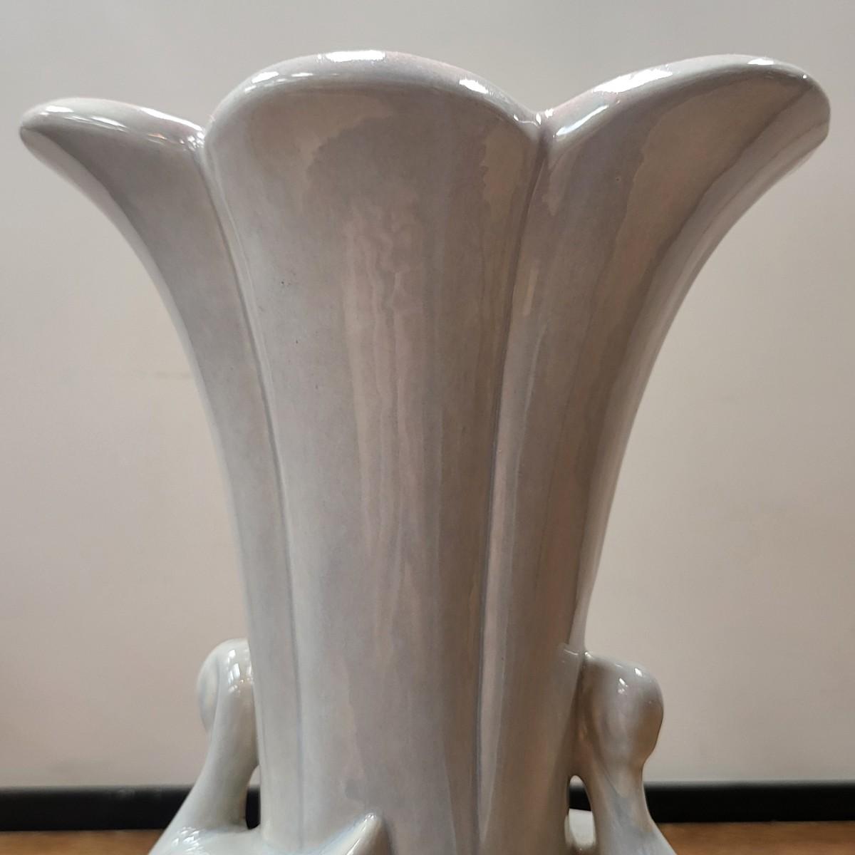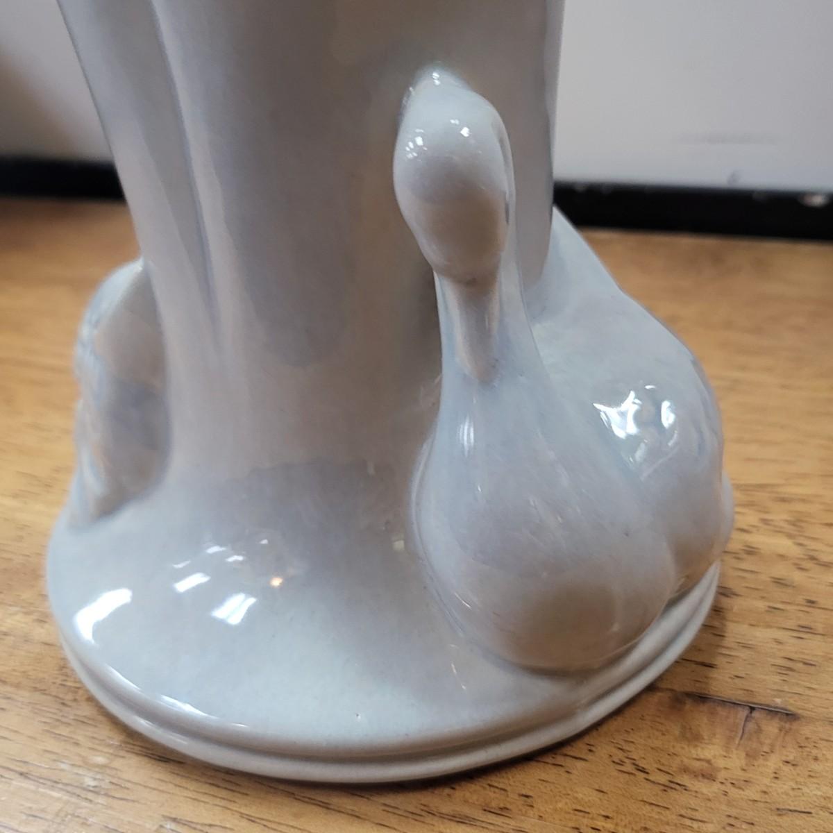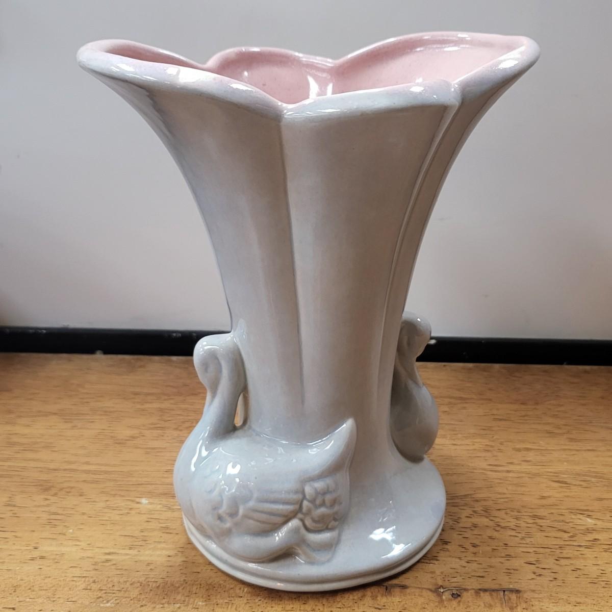 Grey glazed exterior, double swans base, and pink glazed inside. No chips, cracks or breaks but appears a small spot where it did not glaze during manufacturing. Measures 8" tall x 6.75" wide x 5.5" deep.