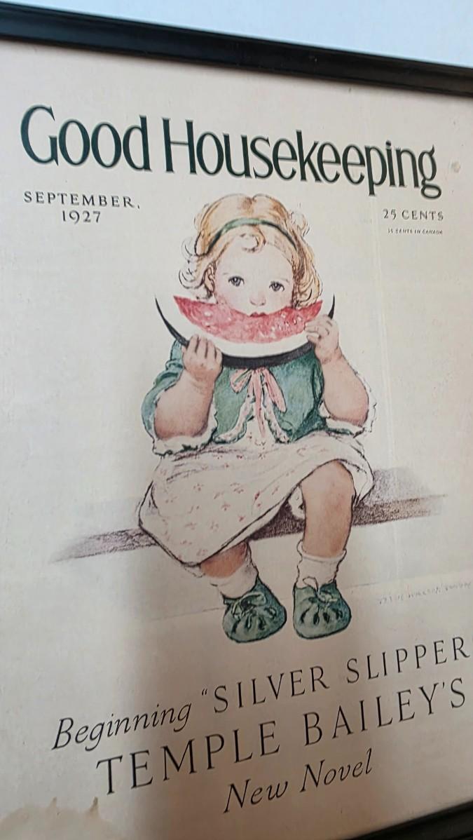 This charming framed art piece features a reproduction of the September 1927 Good Housekeeping magazine cover, one of the publication’s most recognizable early illustrations. The artwork depicts a young child seated and enjoying a slice of watermelon, an image that captures the warmth, innocence, and nostalgic Americana of the late 1920s. The original cover also announces the debut of “Silver Slippers,” Temple Bailey’s novel, grounding the piece firmly in its historical moment.