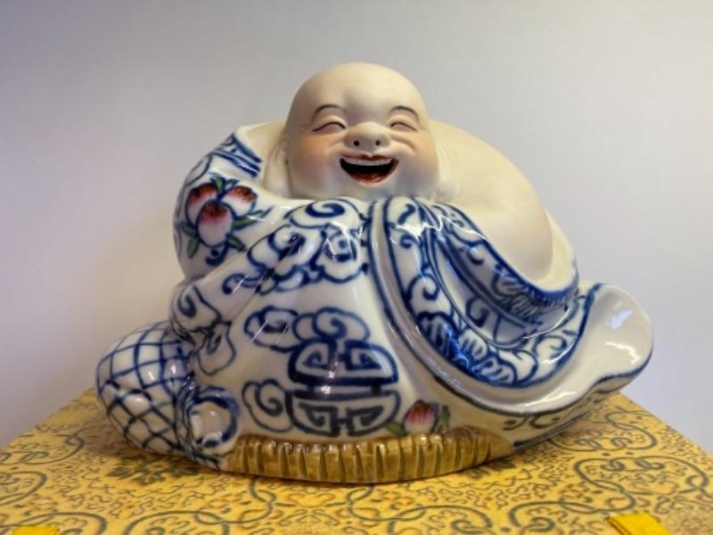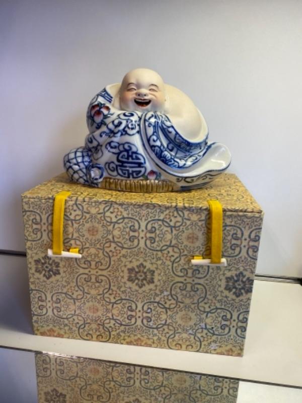 Vintage c. 1970s/80s porcelain classic symbol of wealth and good fortune - the Laughing Buddha. Marked as pictured, mint condition, large 8 x 5”, box is 6.5 x 6.