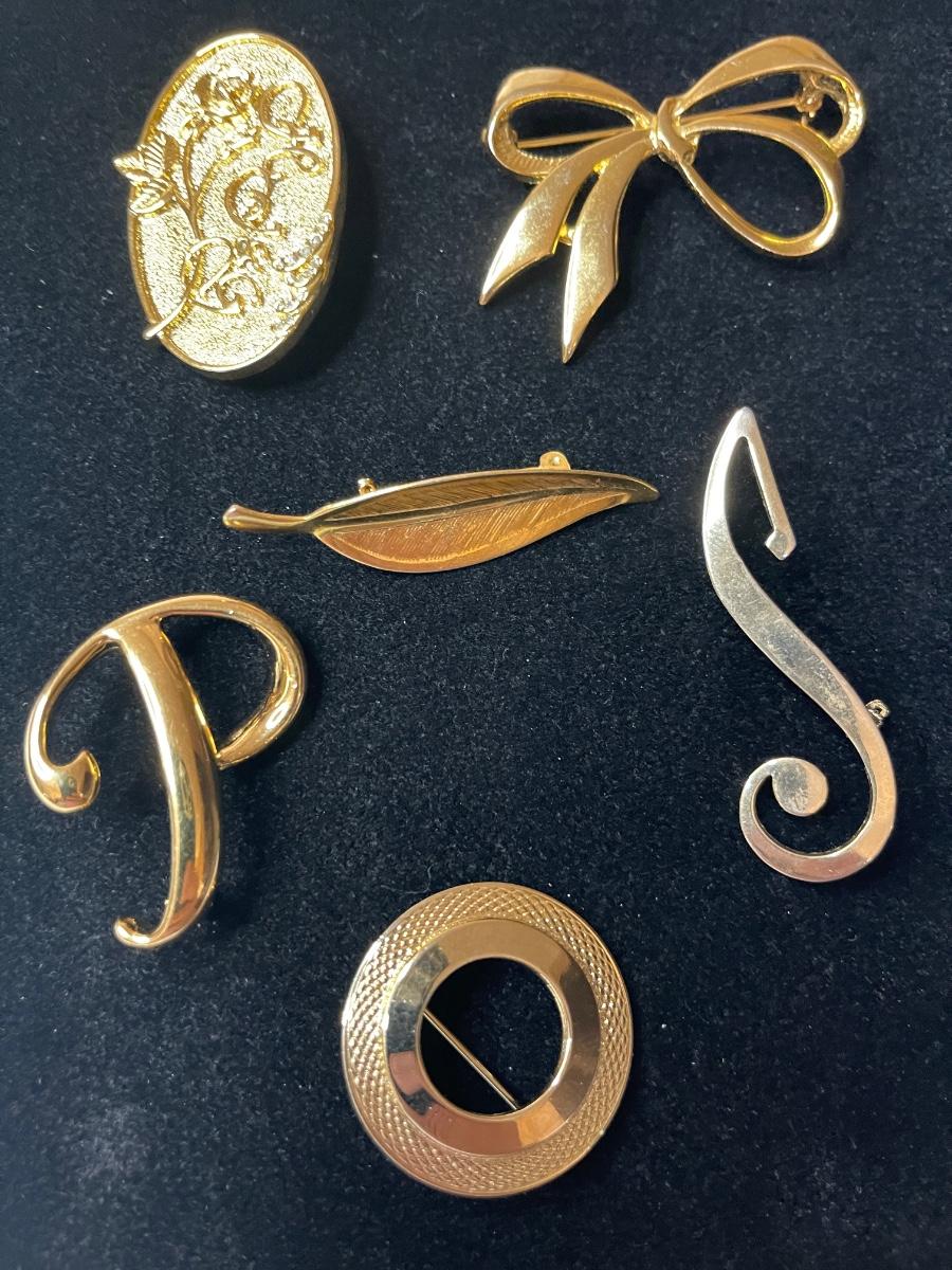 6 vintage brooches all in a gold tone! A good variety for all occasions.