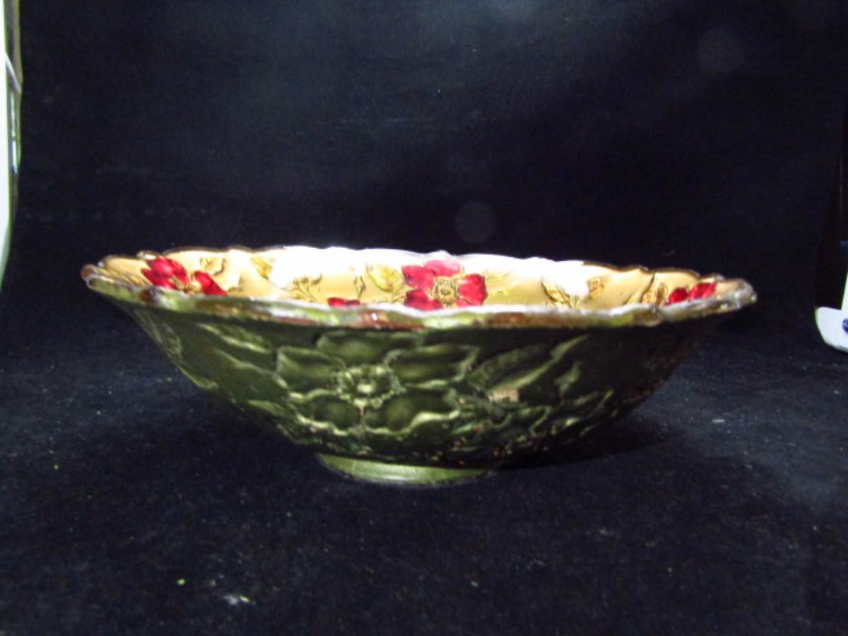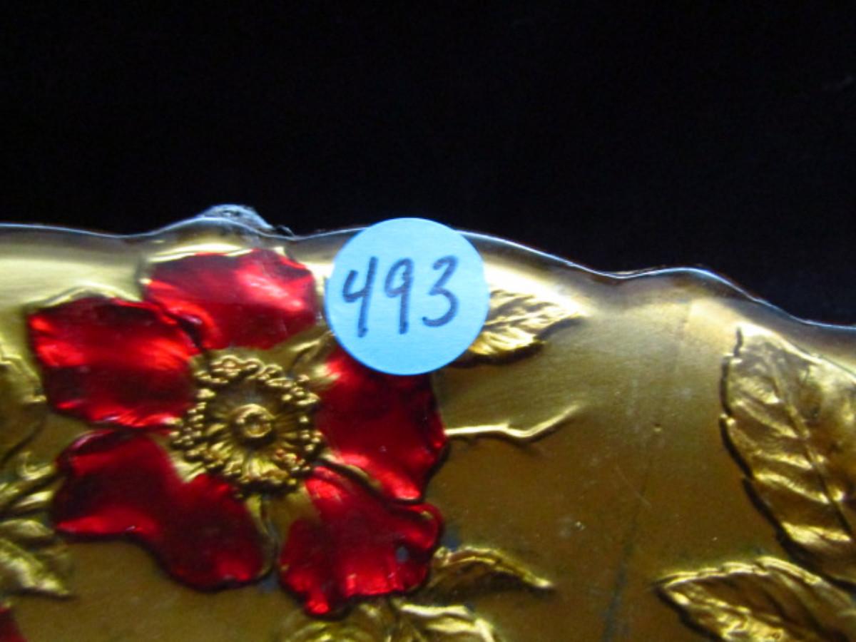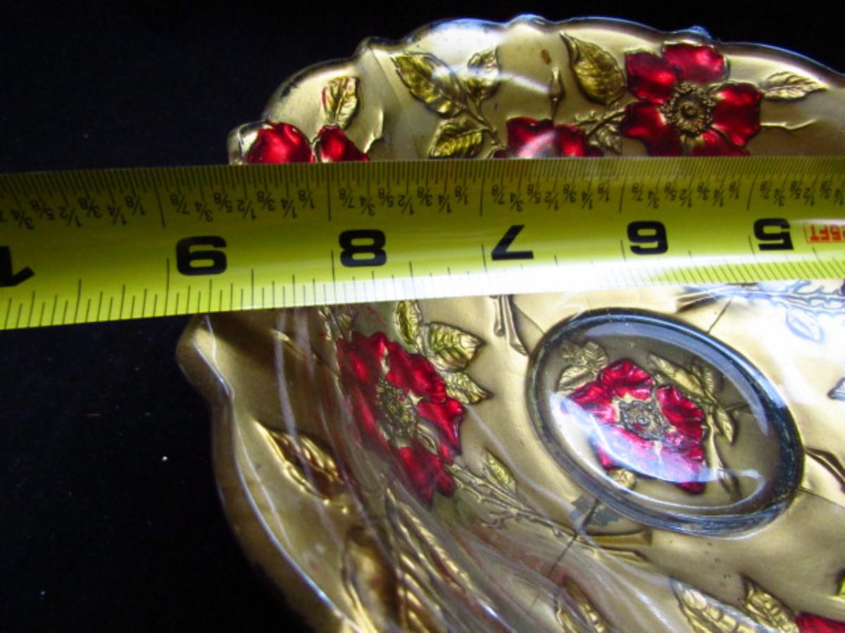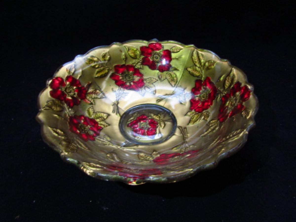 Vintage Goofus Glass Bowl- Gold with Roses- Approx 9" in Diameter (#493)