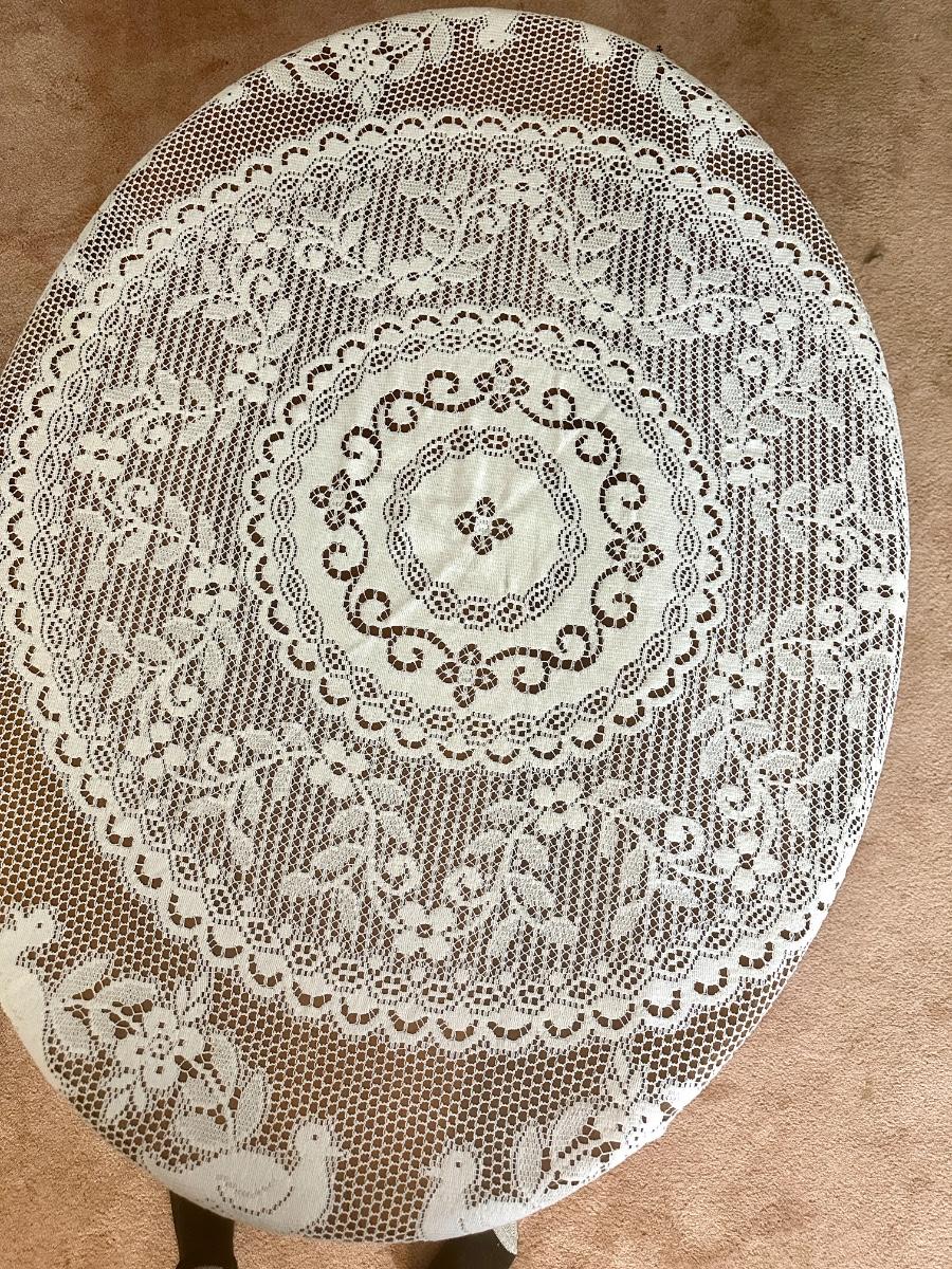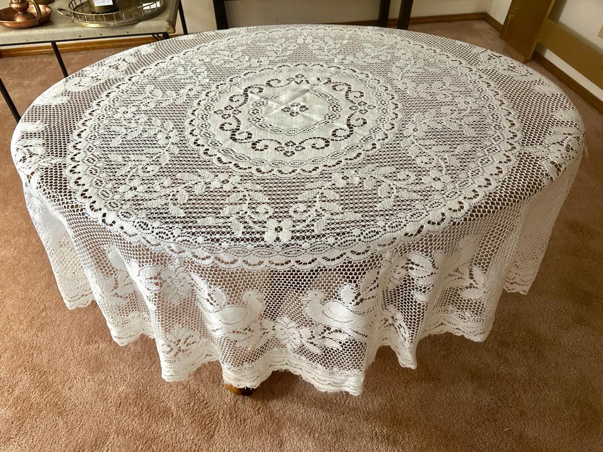 Show stopping crocheted lace tablecloth for round table with a bird pattern. I believe the radius is approximately 68". (Table used is oval not round so skews design a bit.)