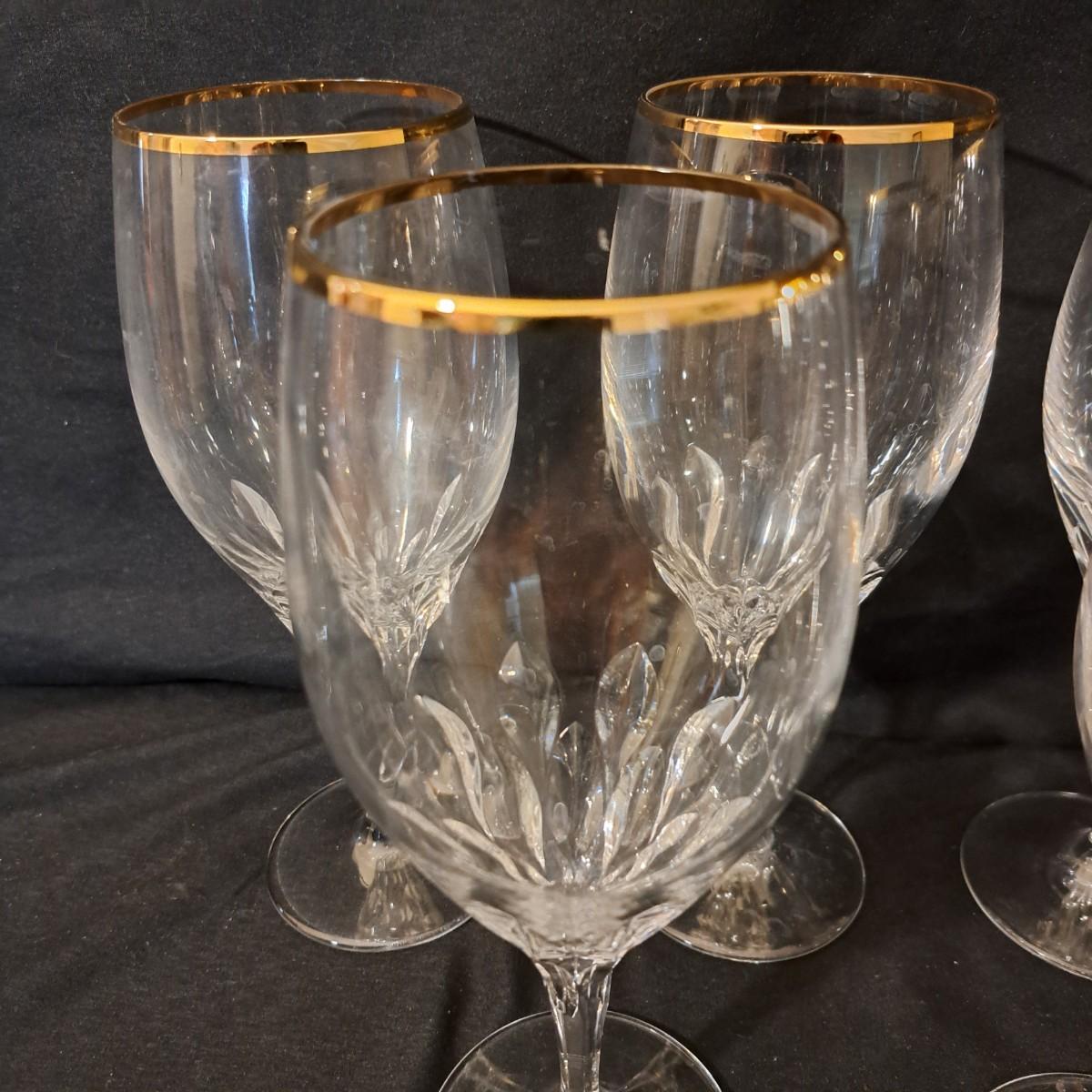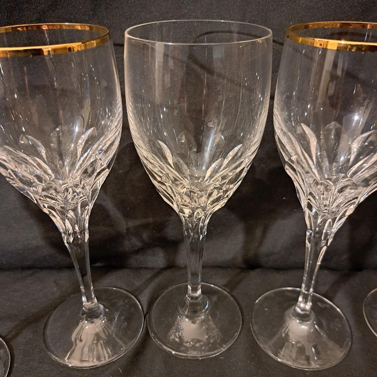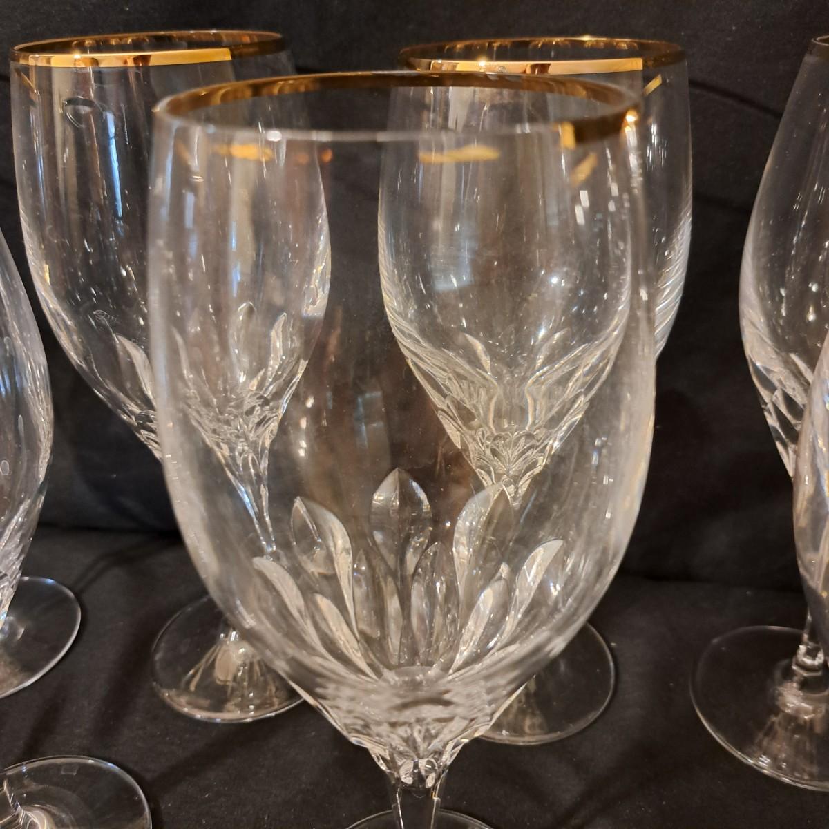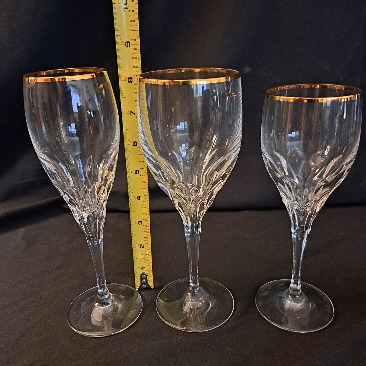Thirty-eight pieces of Gorham Diamond Gold Crystal stemware with 3 different sizes ranging from approximately 7.5"H to 8.5"H. Approximately six glasses have various degrees of worn gold rims; otherwise, all glasses appear to be good condition per their age with no chips to rims or bases. The GORHAM logo is etched at bottom of bases.