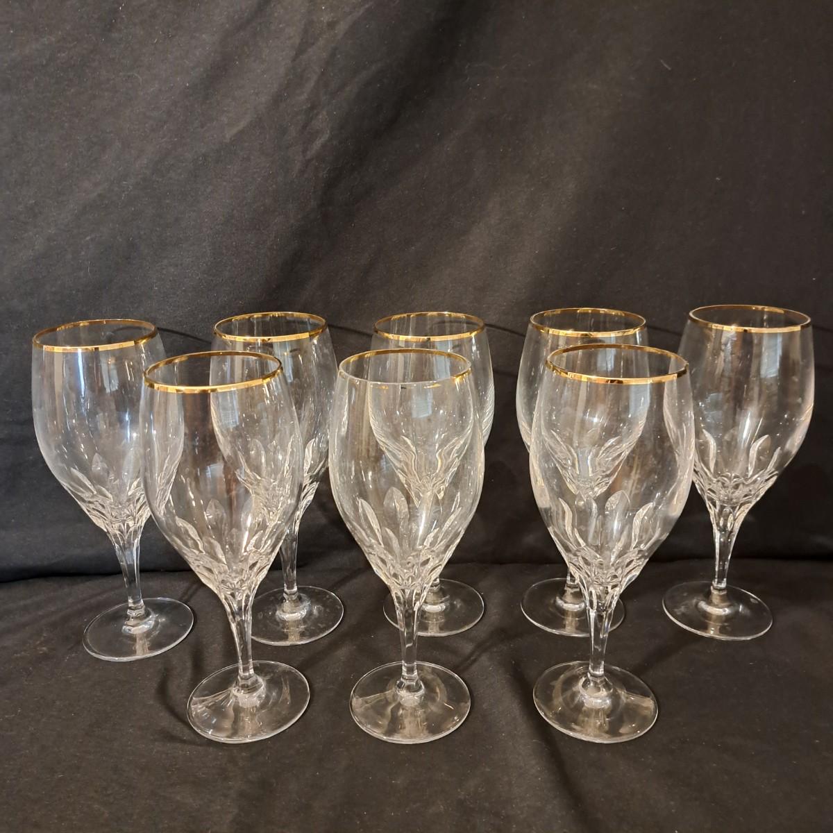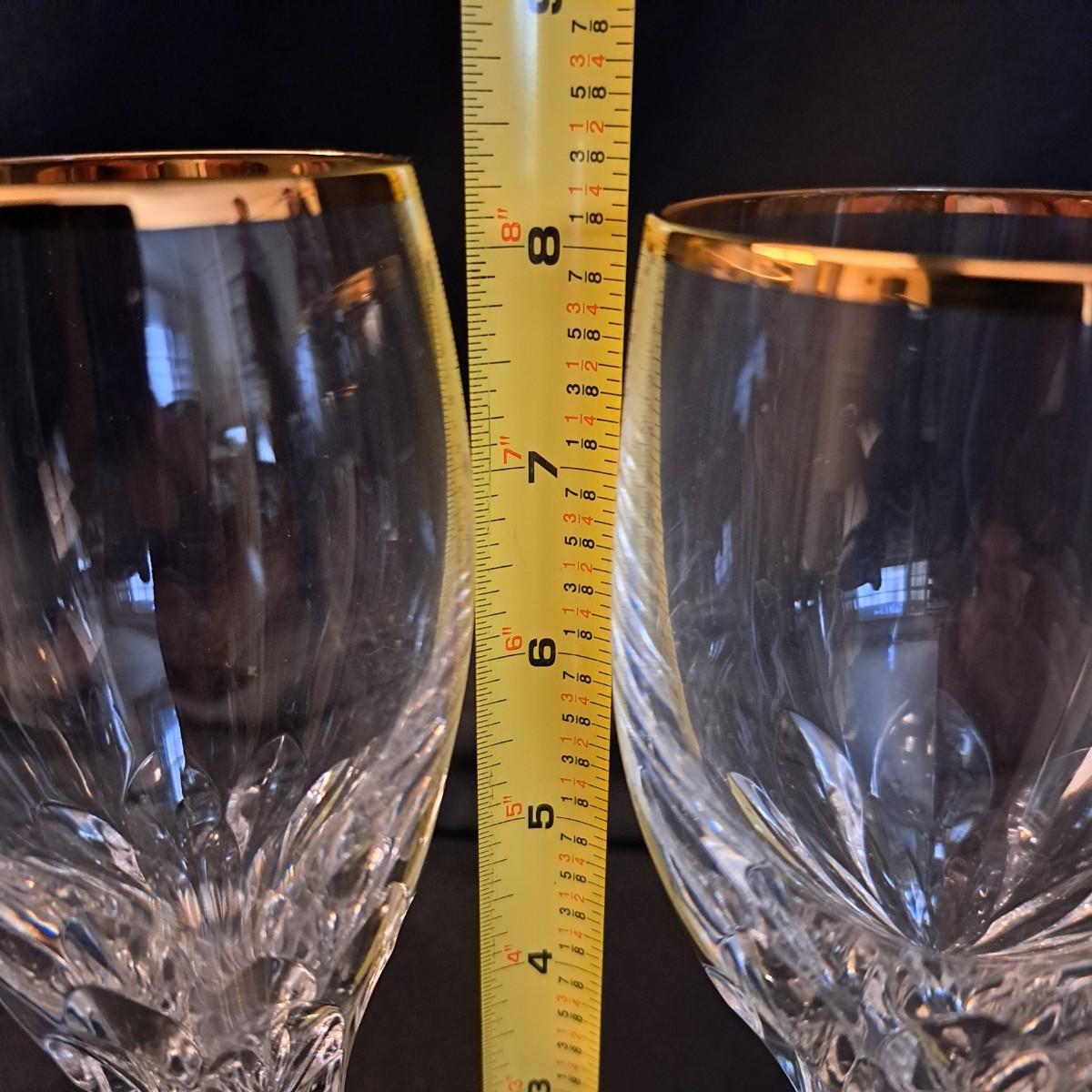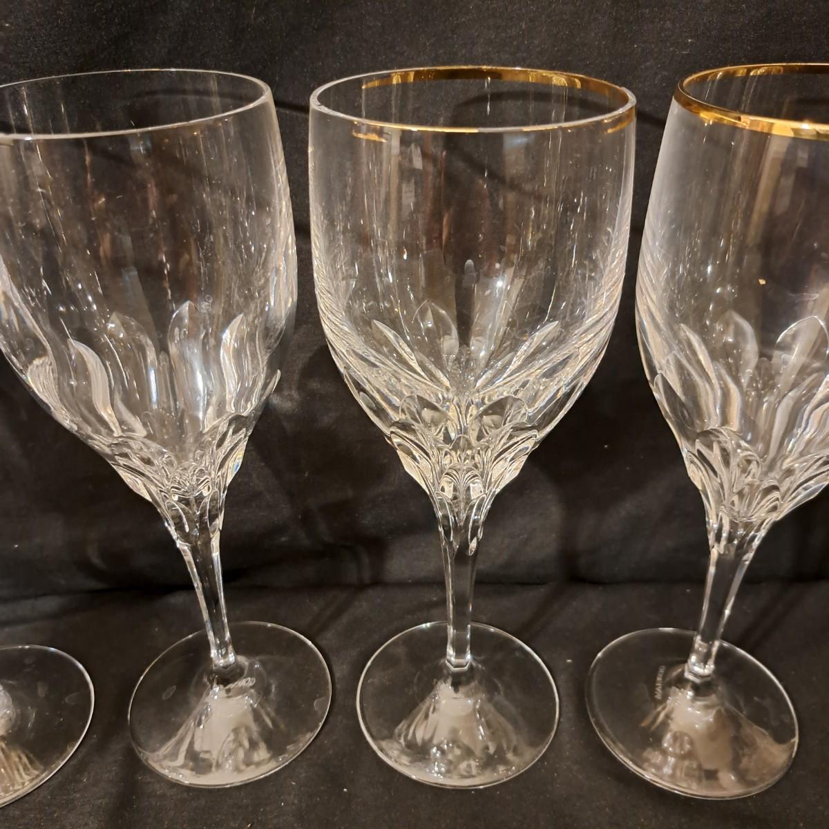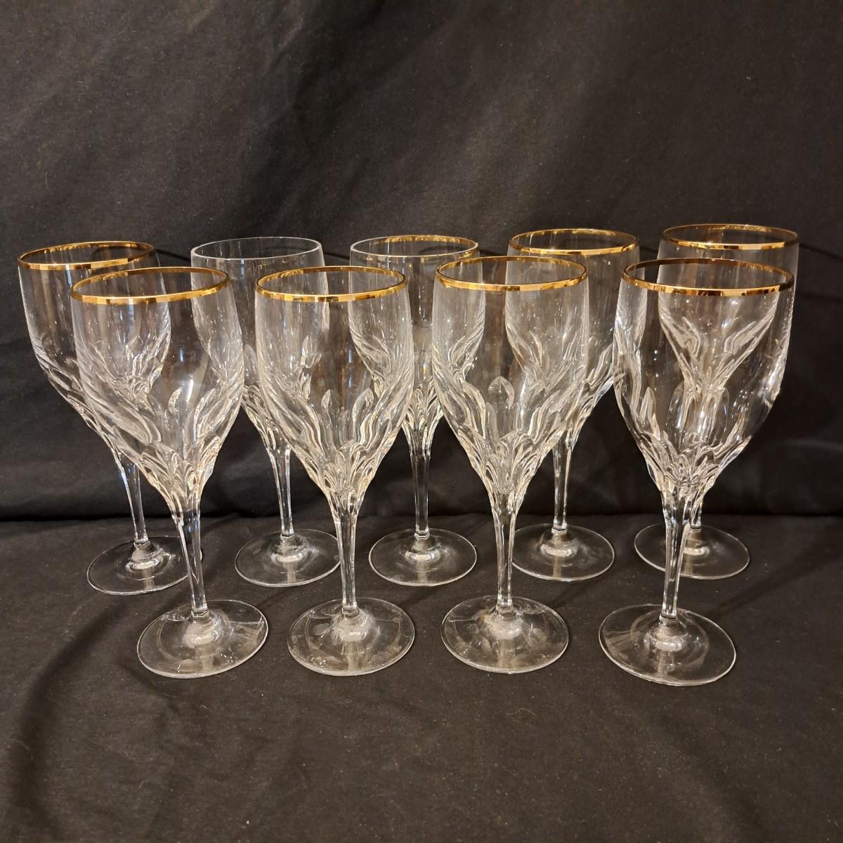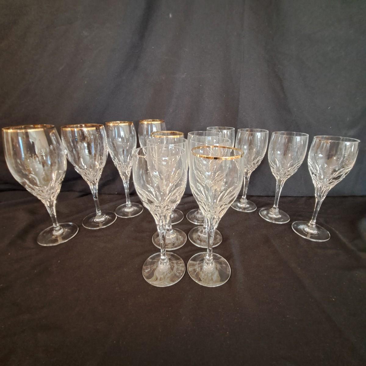 Thirty-eight pieces of Gorham Diamond Gold Crystal stemware with 3 different sizes ranging from approximately 7.5"H to 8.5"H. Approximately six glasses have various degrees of worn gold rims; otherwise, all glasses appear to be good condition per their age with no chips to rims or bases. The GORHAM logo is etched at bottom of bases.