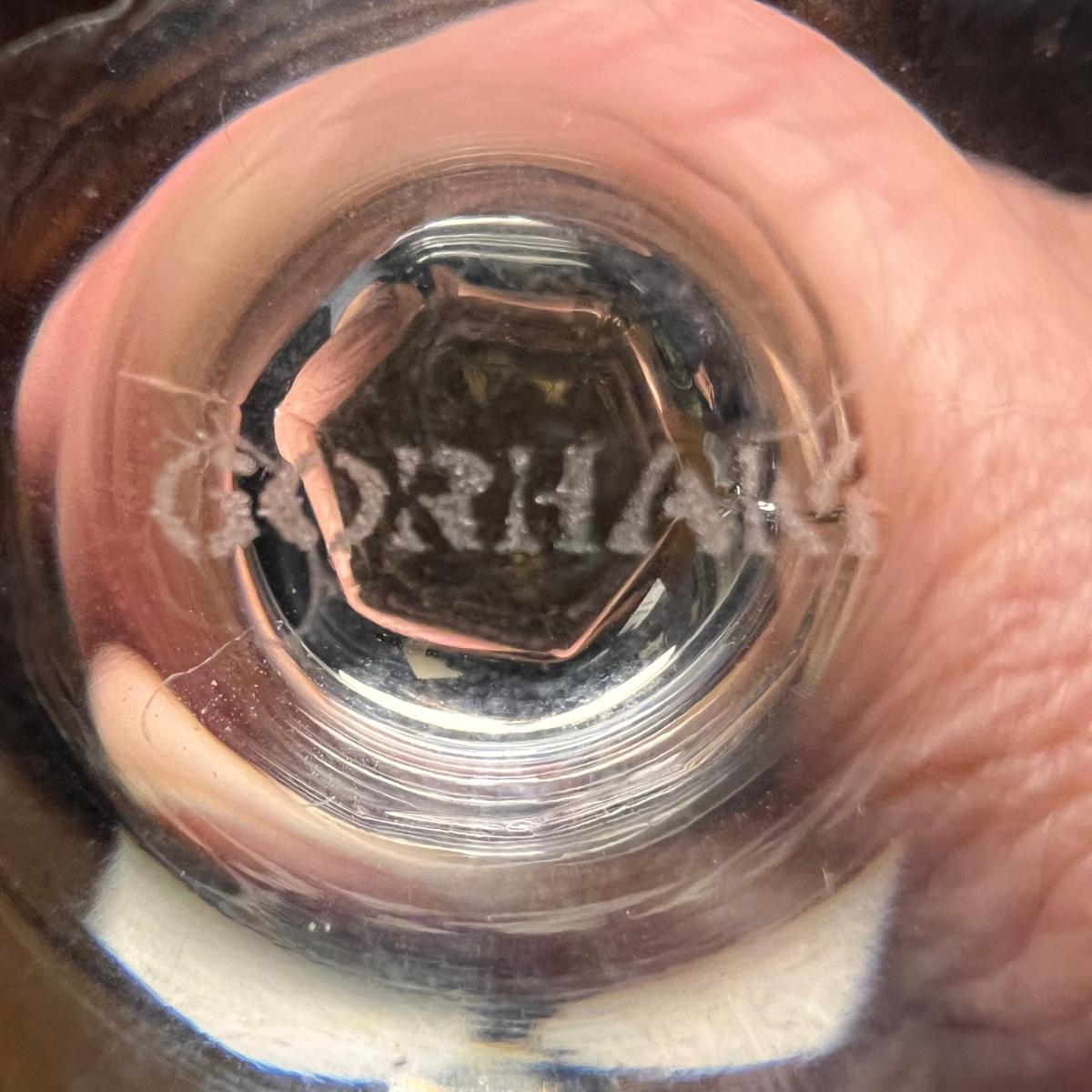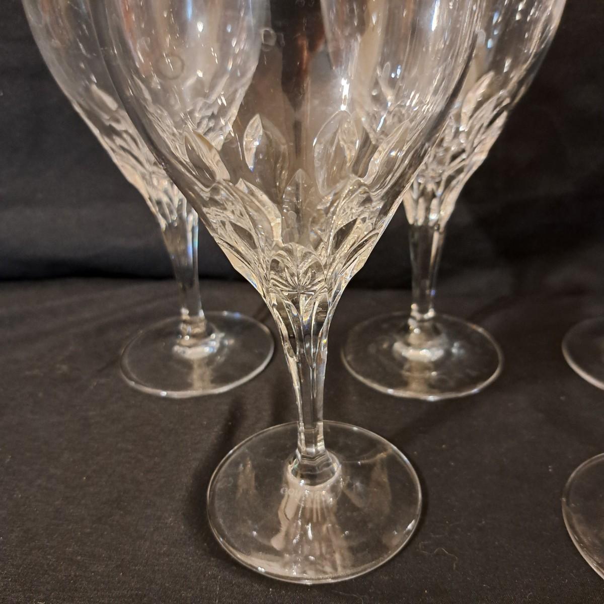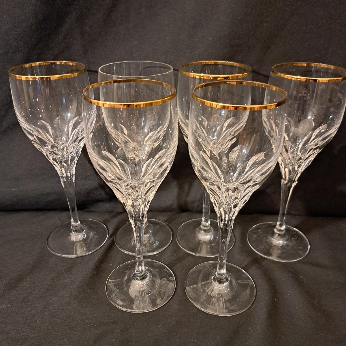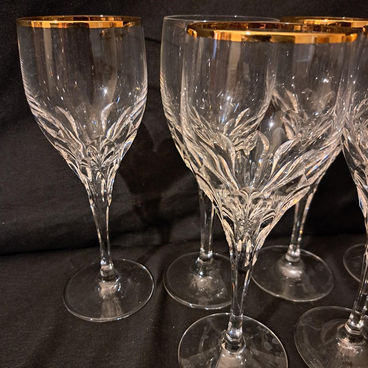 Thirty-eight pieces of Gorham Diamond Gold Crystal stemware with 3 different sizes ranging from approximately 7.5"H to 8.5"H. Approximately six glasses have various degrees of worn gold rims; otherwise, all glasses appear to be good condition per their age with no chips to rims or bases. The GORHAM logo is etched at bottom of bases.