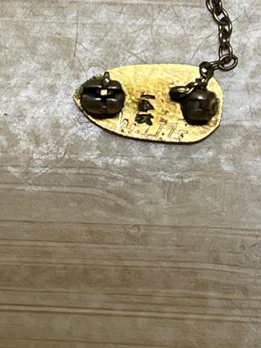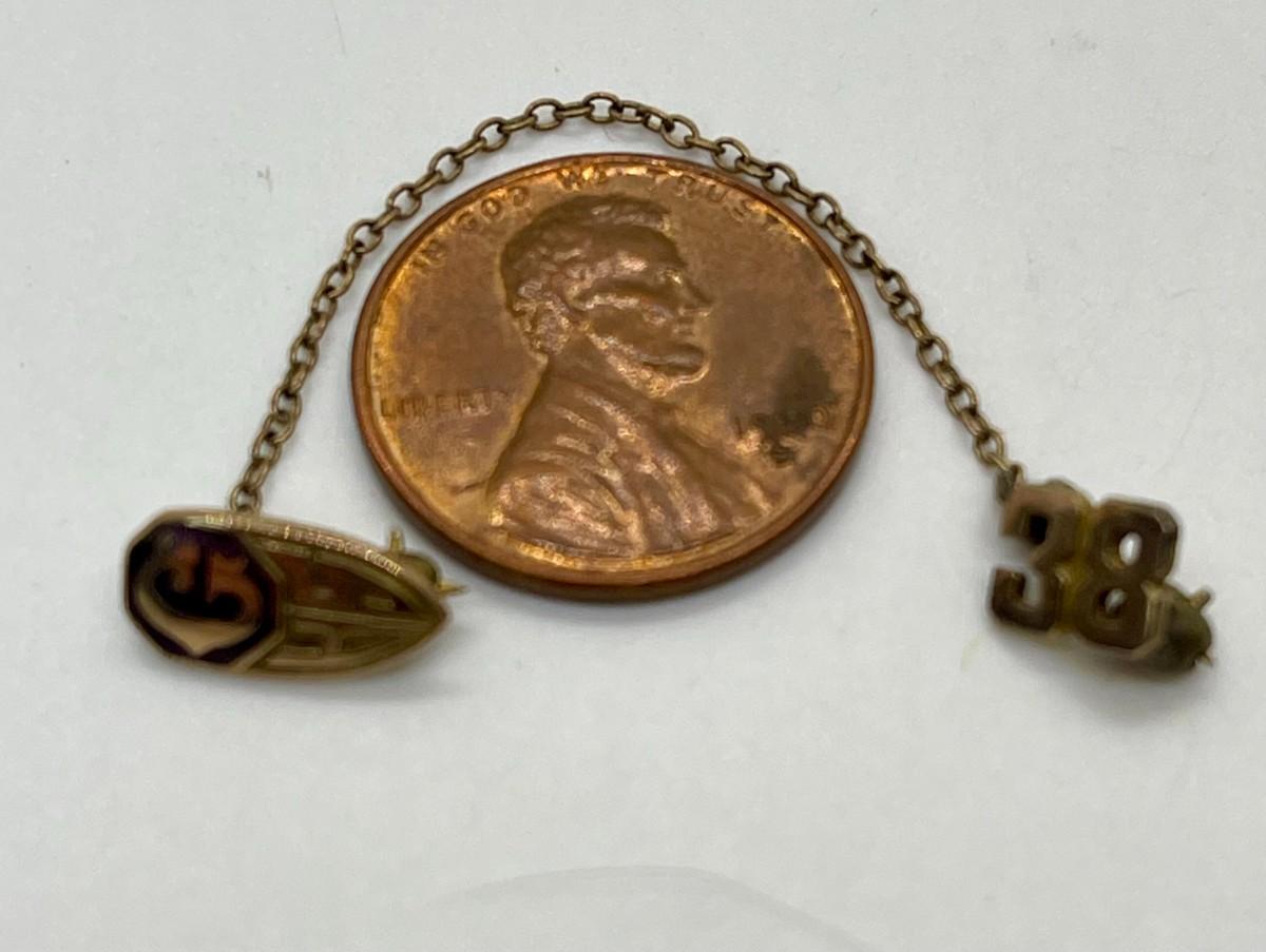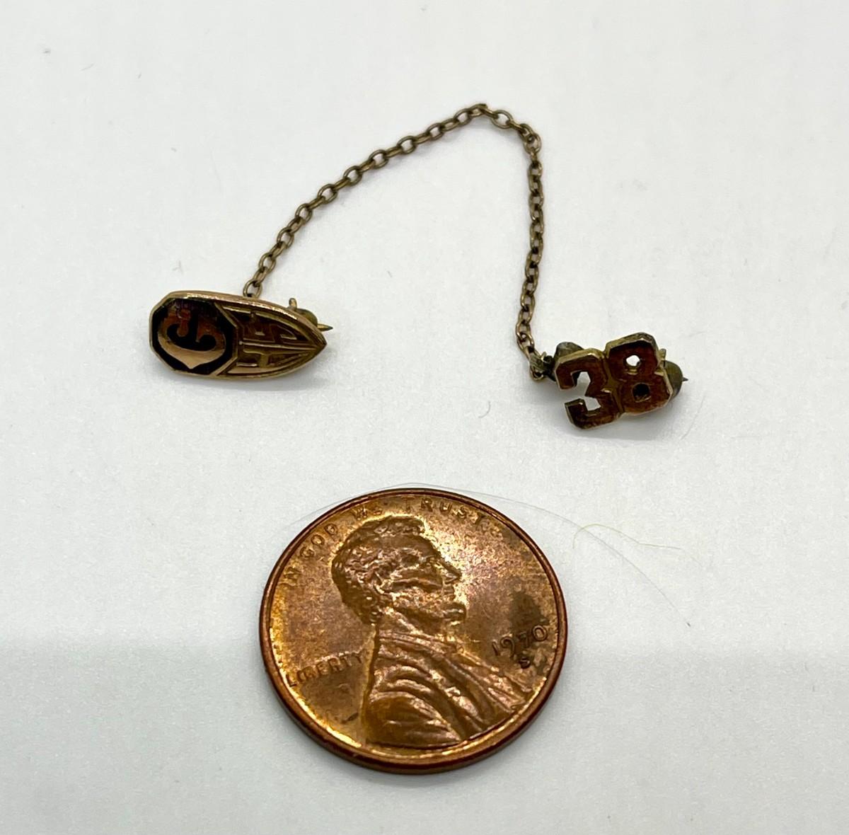 In good vintage condition. Logo pin marked 14K, "38" pin not marked