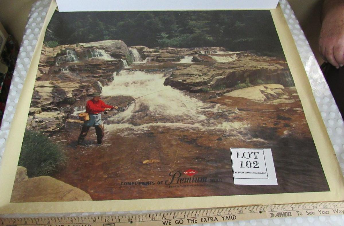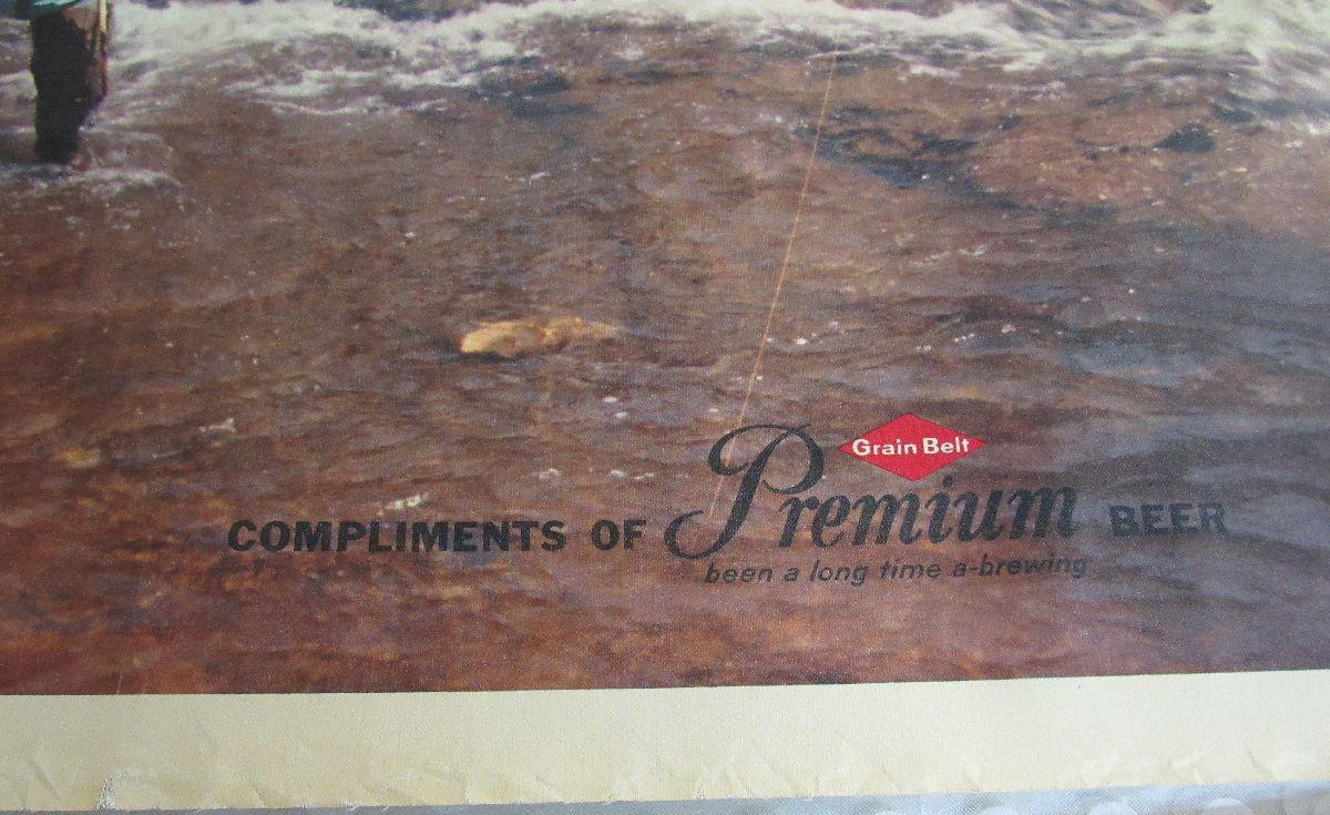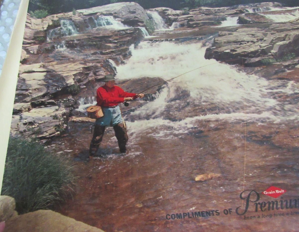 Vintage Grain Belt Beer Picture on Canvas, Man Fishing, Appr 26" x 33"