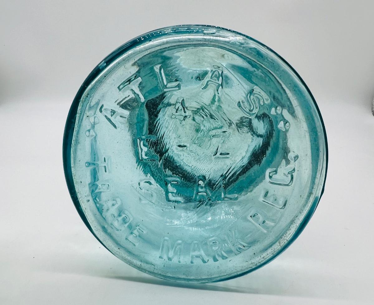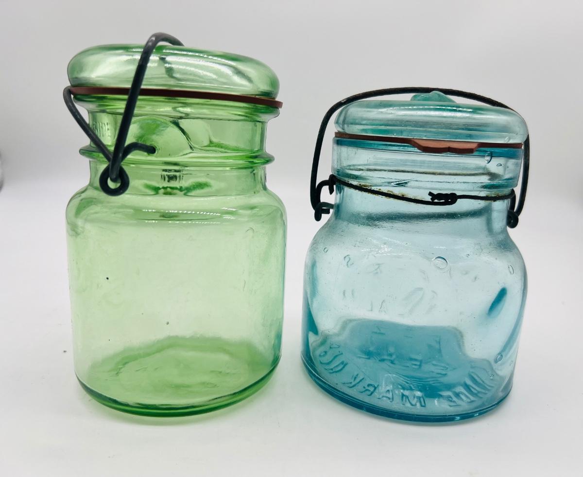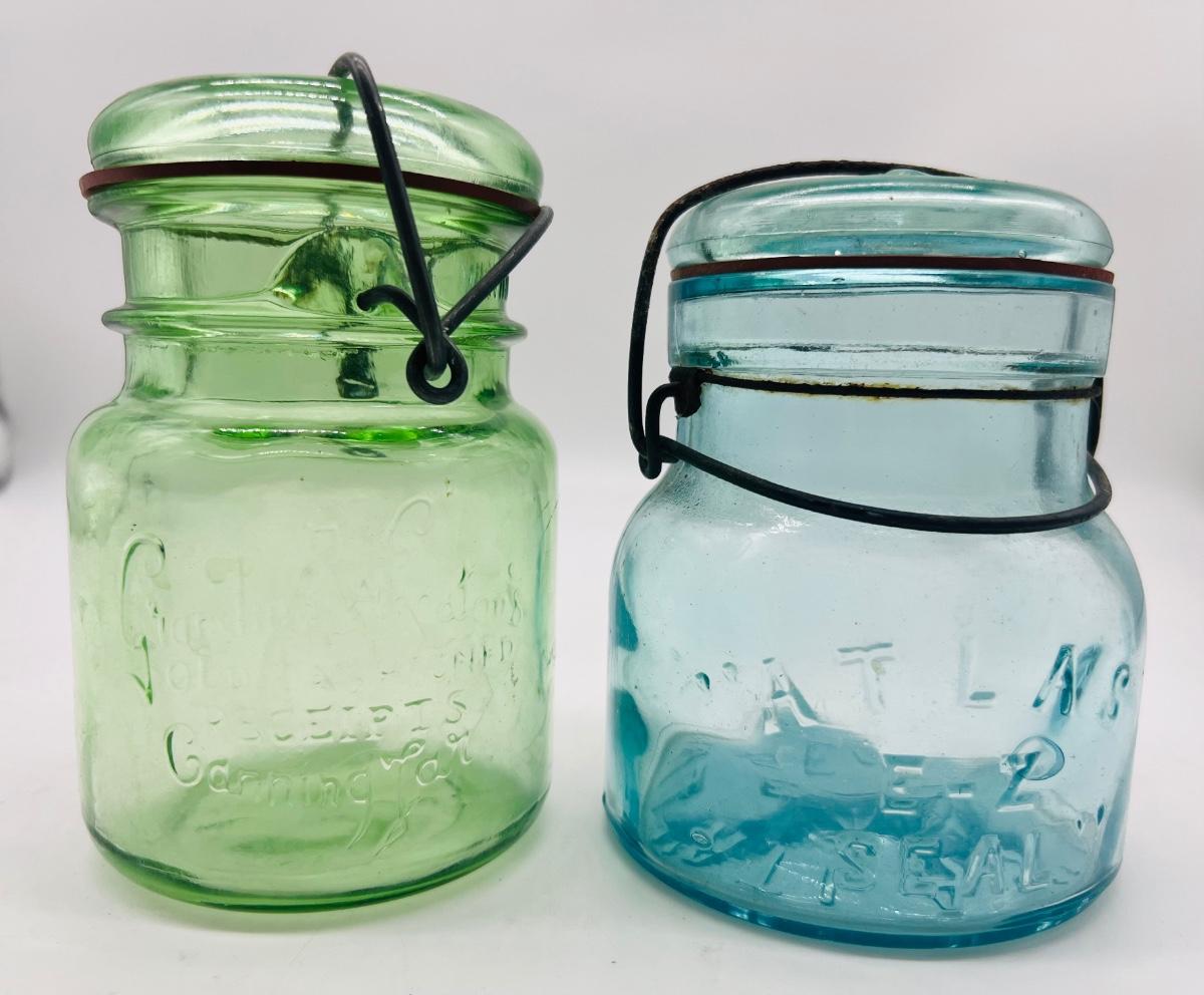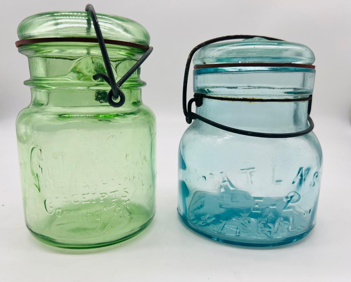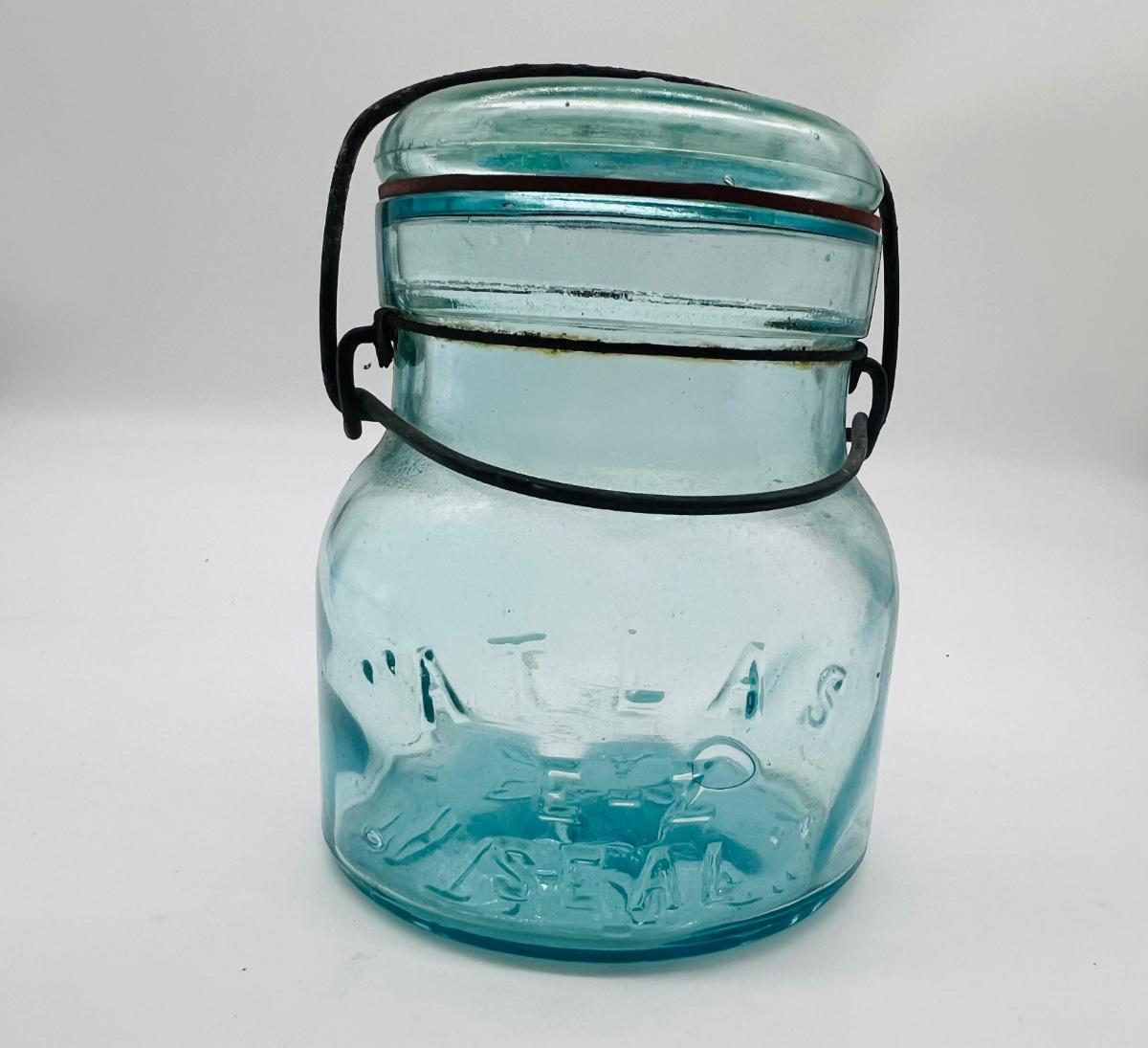 Fashioned Receipts canning jar with lid. Measures 5 1/2 inches tall. Blue ATLAS E-Z Seal #4 canning jar with lid. Measures 5 inches tall.