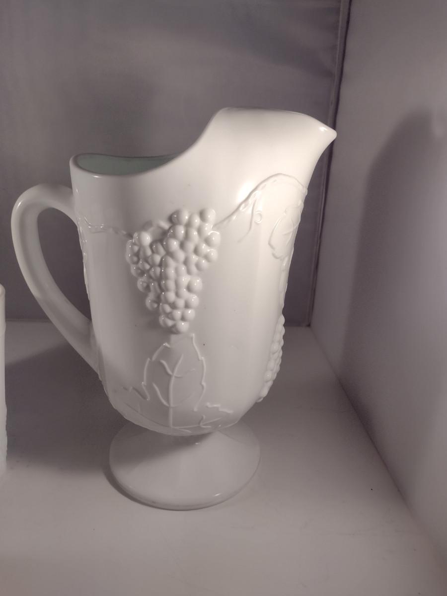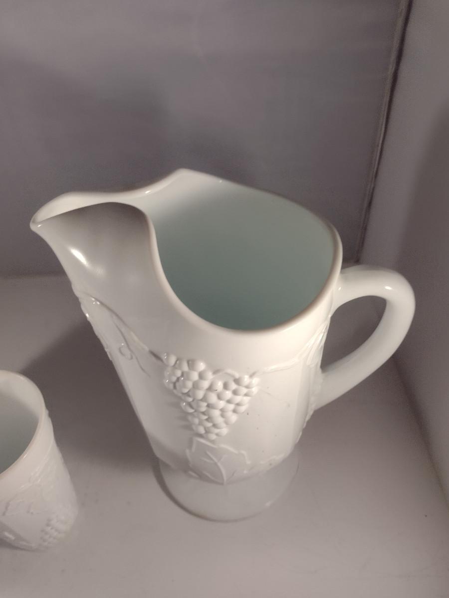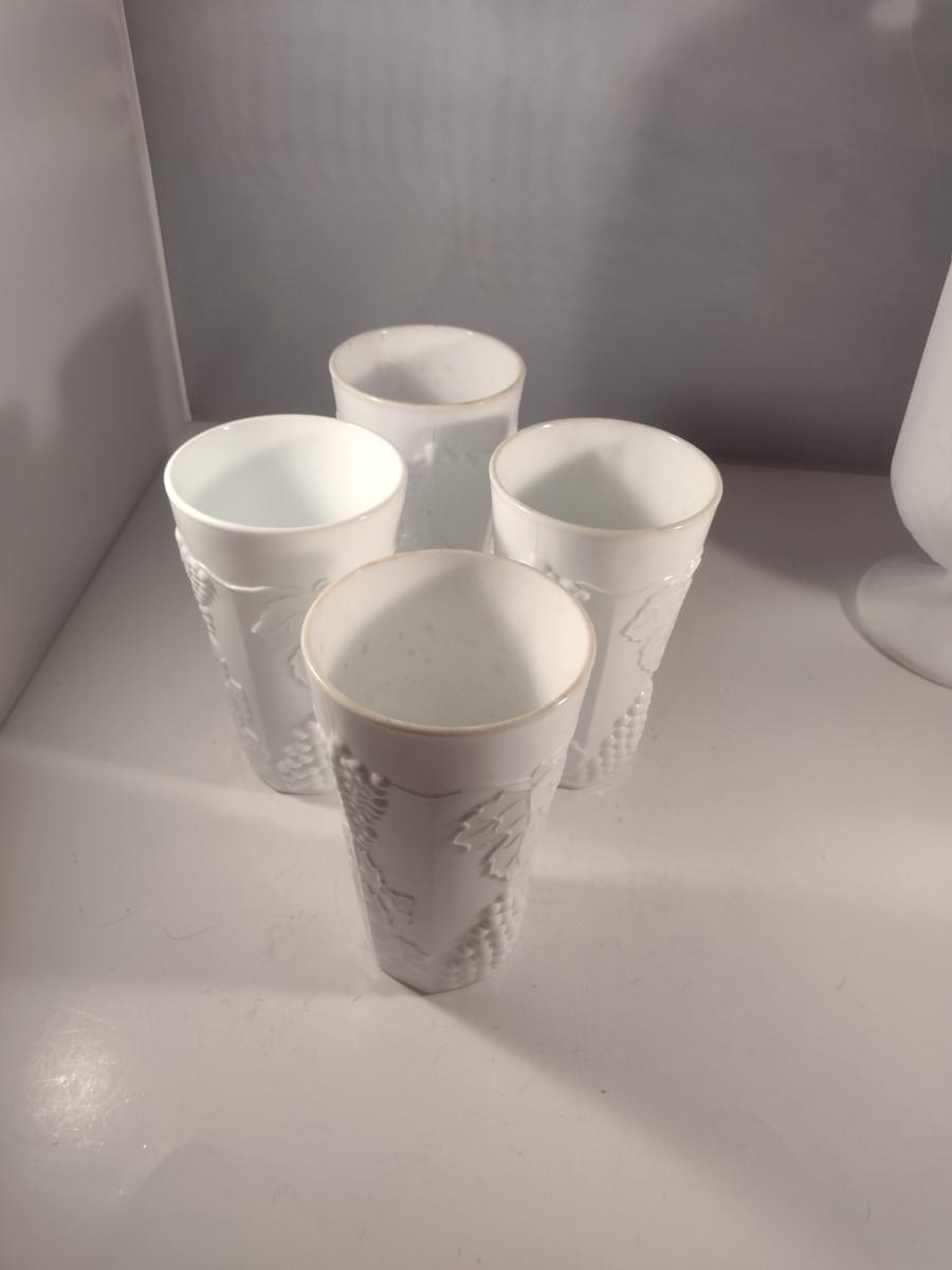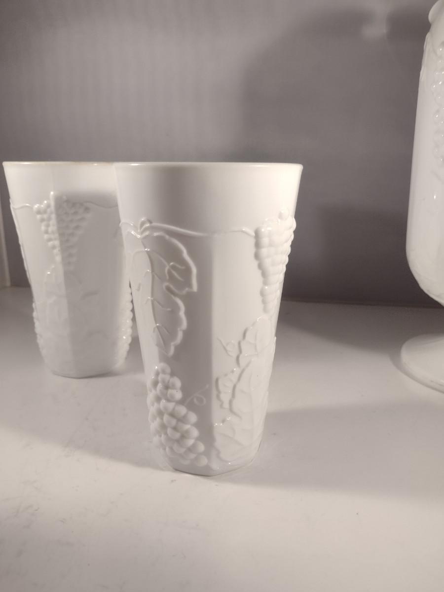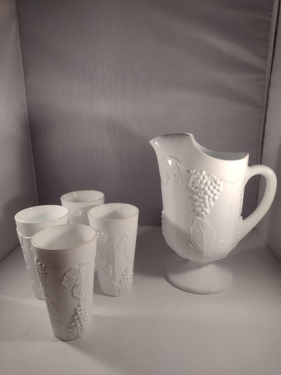 Vintage Grapes and Leaves Theme Milk Glass Pitcher and Four Glasses