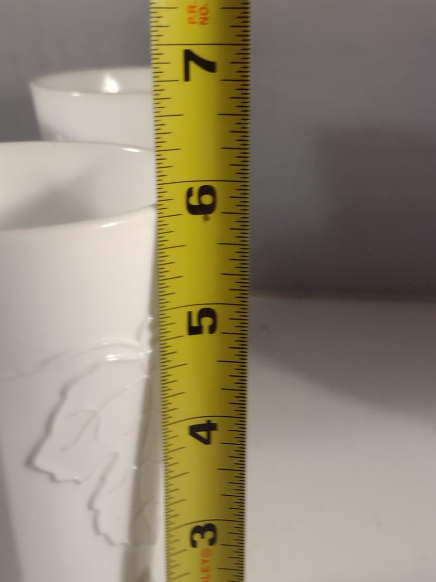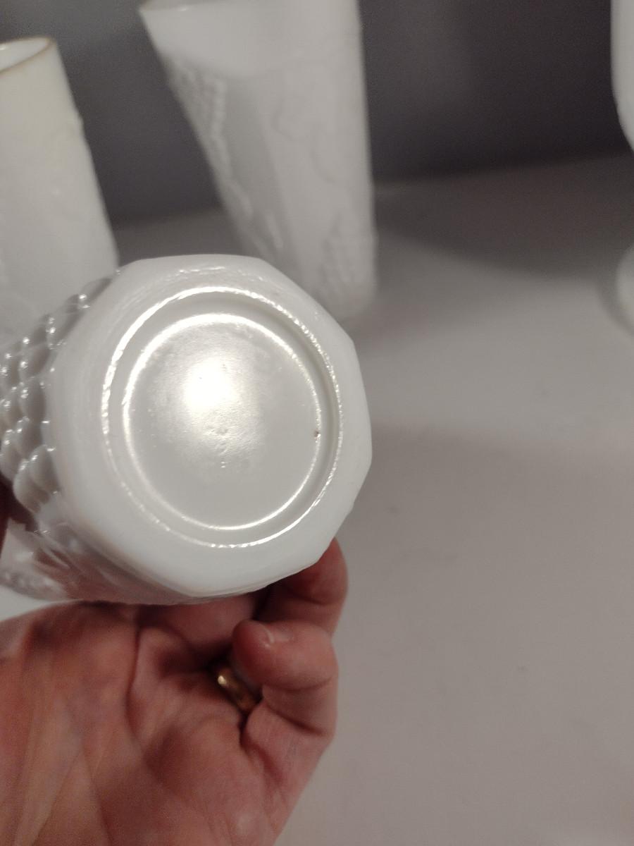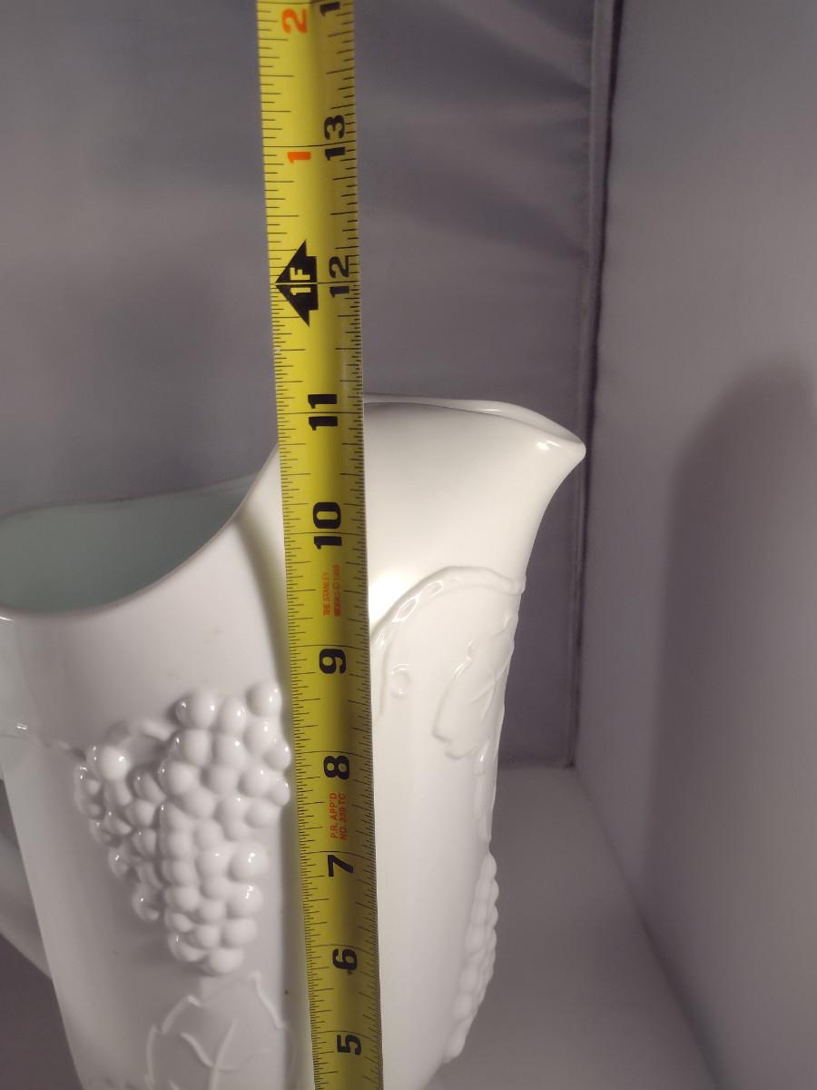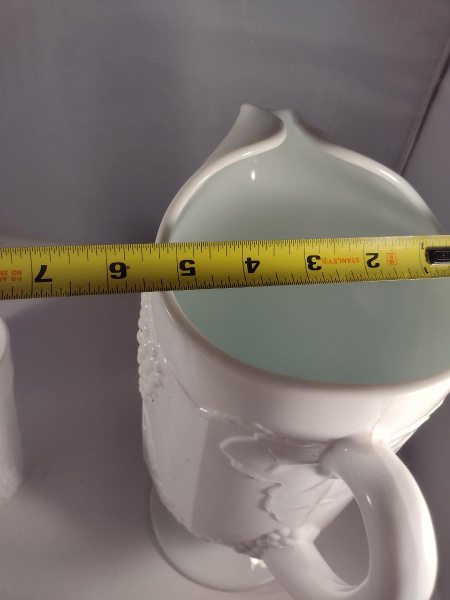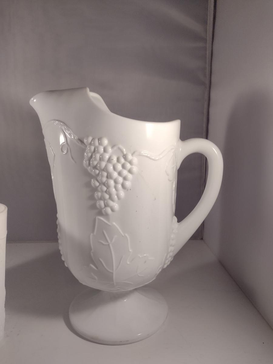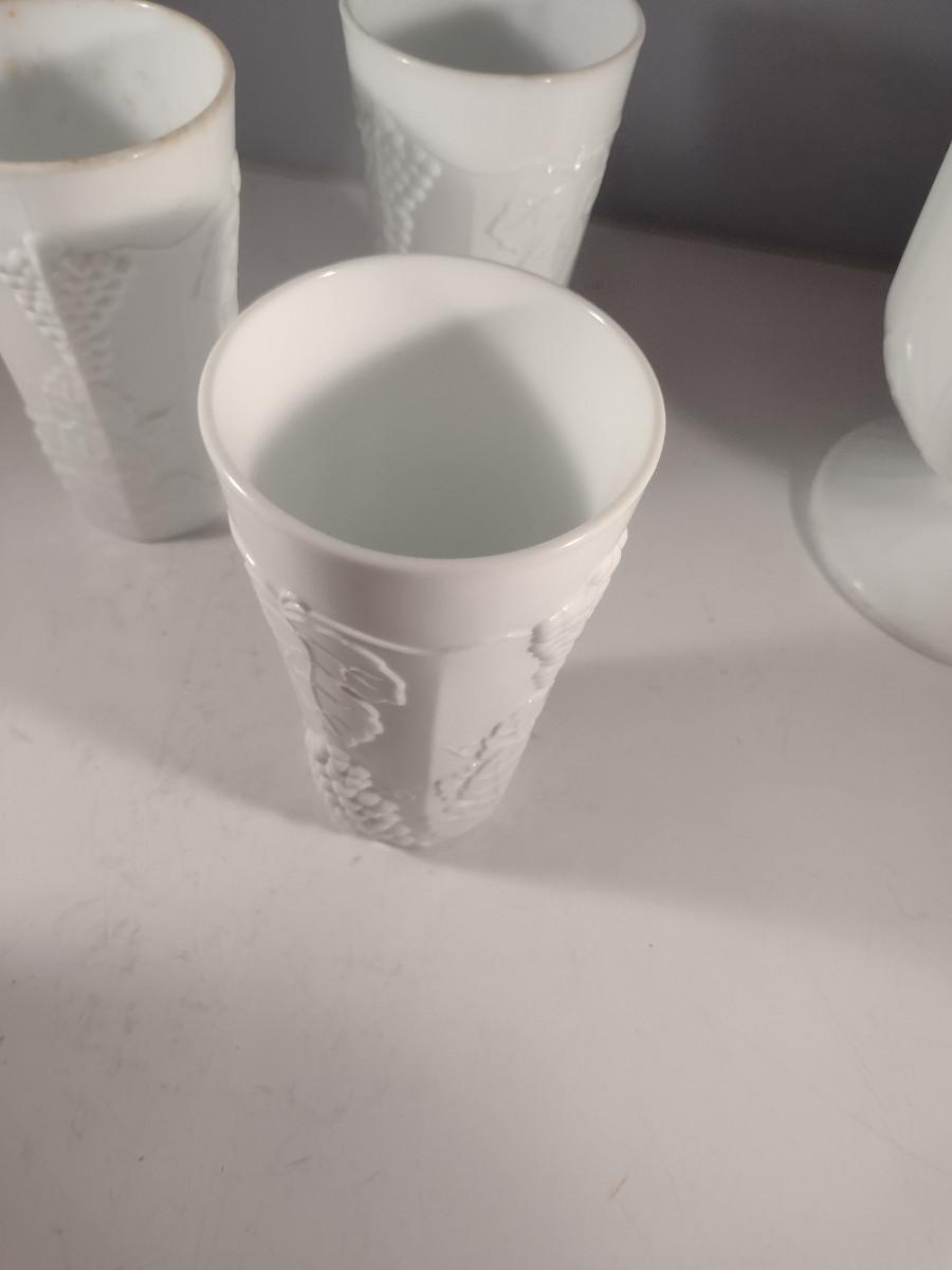 Vintage Grapes and Leaves Theme Milk Glass Pitcher and Four Glasses