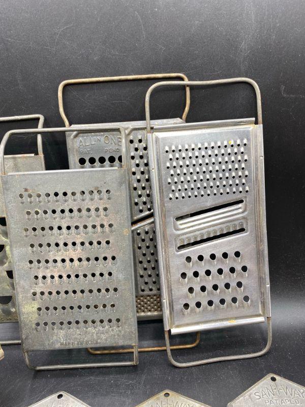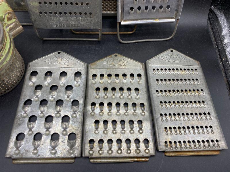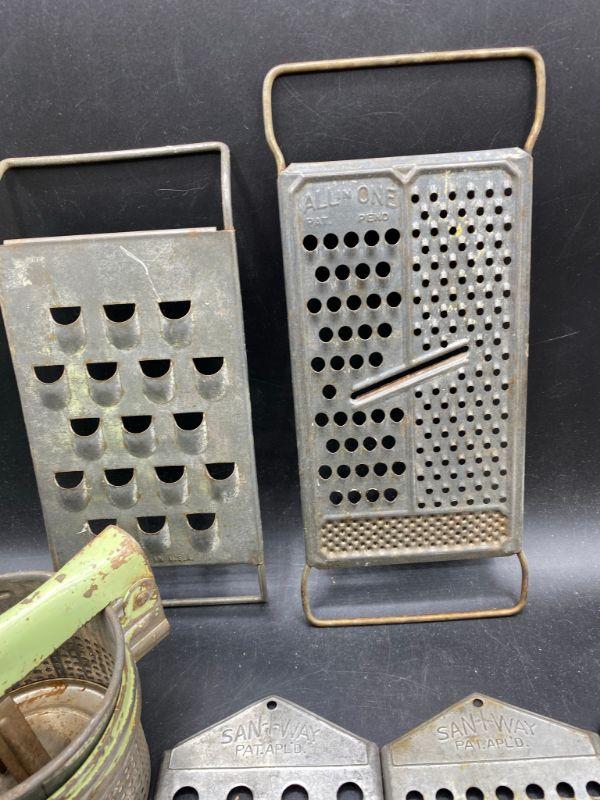 Vintage grater lot. 7 different graters, different shred size. The 3 laying down have a curved lip on flat end like they were part of a set. Included is a vintage metal vegetable ricer. Ricer has some rust from use and age. Could be cleaned up and used possibly or just displayed.
