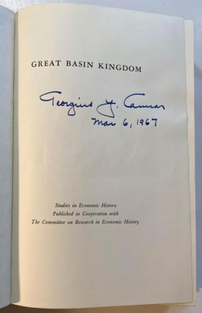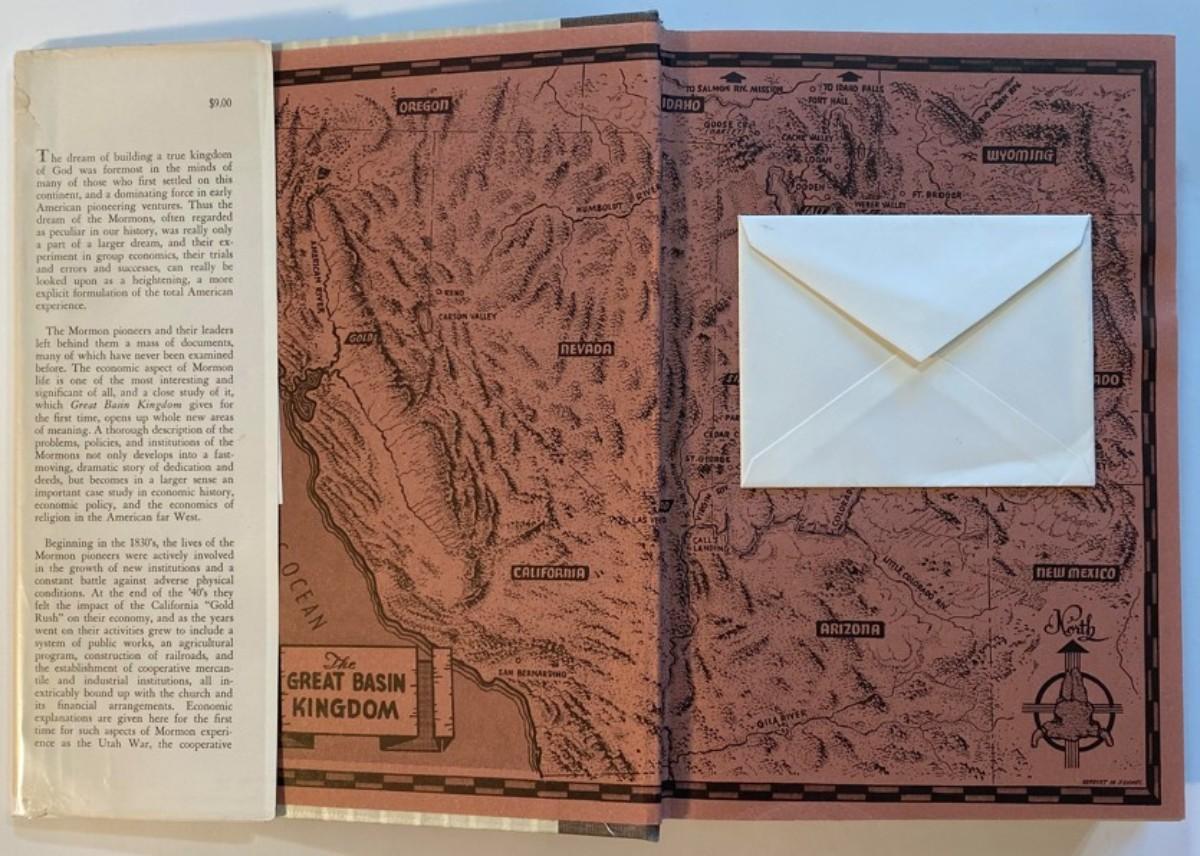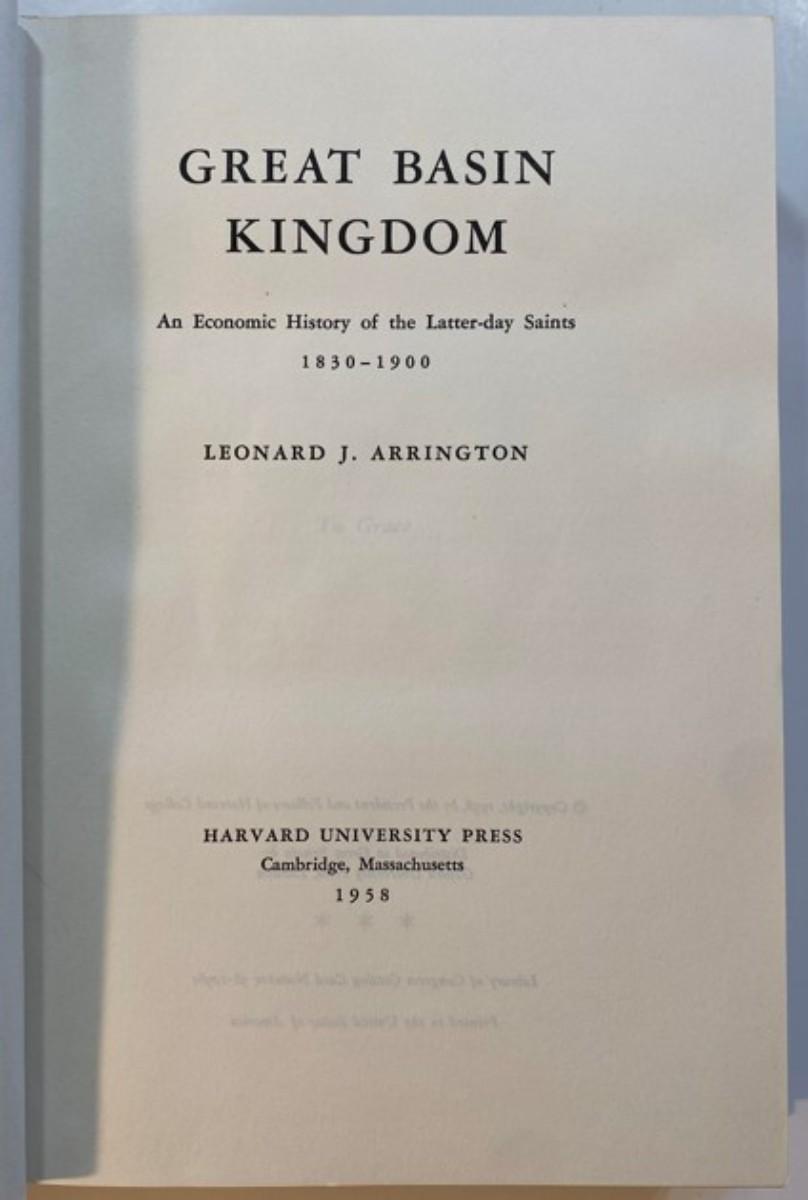 You get one vintage Great Basin Kingdom: Latter-Day Saints by Leonard J. Arrington 1958 HCDJ book published by Harvard University Press in Cambridge, Massachusetts. This item comes with a dust jacket. This is a first edition and is in English. This book is in good condition with some wear to its covers and edges. The binding is tight and the book is complete with no loose pages. The scarce dust jacket is protected in plastic, but is worn with tears and minor tanning. The binding is tight and the pages are clean and intact. There is an owner's inscription on the second front free end sheet and a small envelope was pasted to the inside of the first free end sheet, This item is 9.5 inches tall by 6.5 inches wide. These measurements are just approximations to give you an idea of how big, or small, the book is. Please refer to pictures to gauge thickness. Please see all pictures. Thank you for looking. As a reminder, if this is a lot, we do not break up lots. Also, all items are prepacked, so each item is sent individually. Any item that qualifies for media mail and weighs over one pound will be shipped via media mail. Otherwise, the item will be shipped USPS ground advantage, or UPS ground. Shipping for this item is $8.00. Items ship within two days after payment is received. Item SKU is .