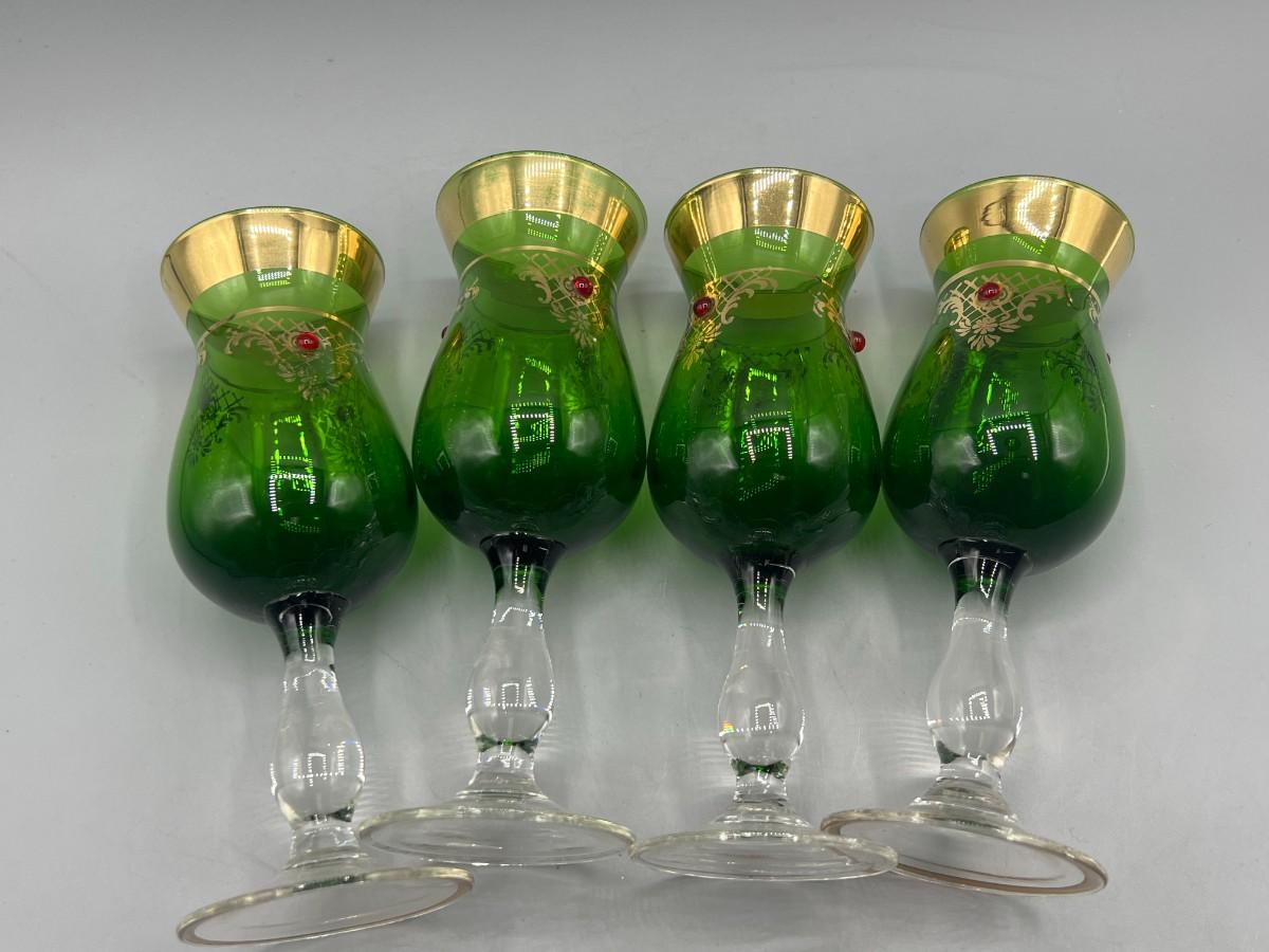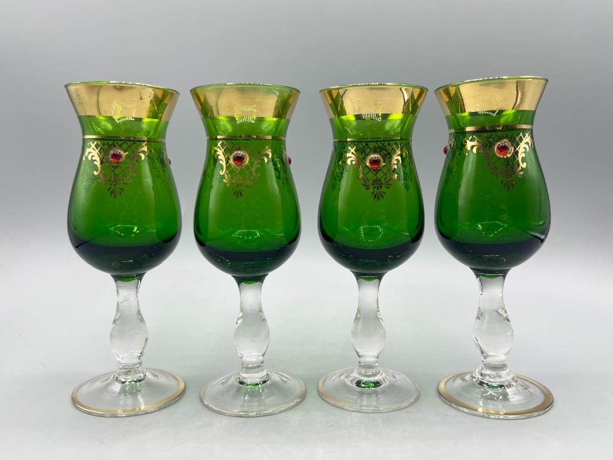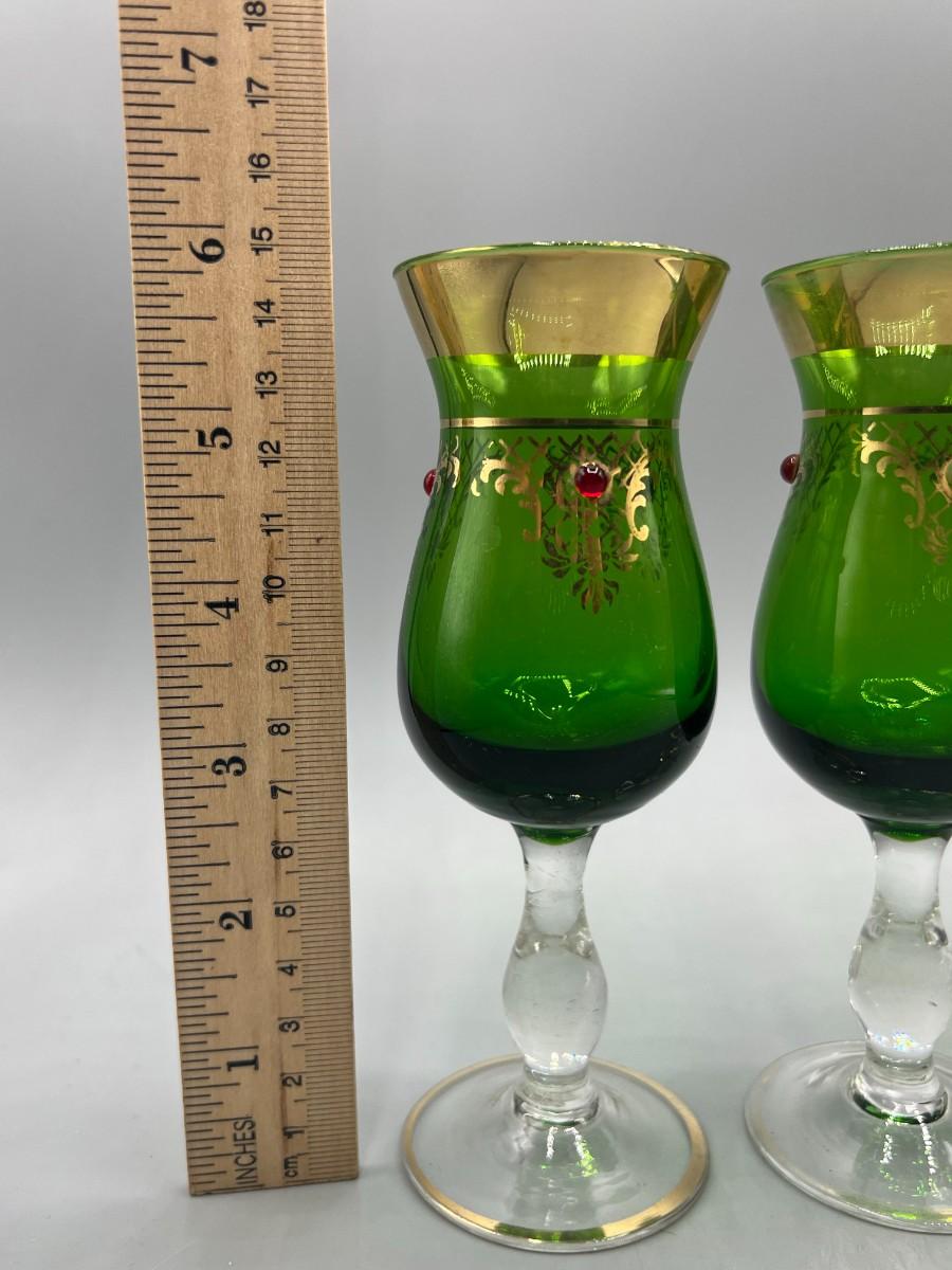 Vintage Green and Gold Drink Stemware Cordial Glasses. In overall good condition. Rhinestone accent. Some light wear to the gold. About 6" size.